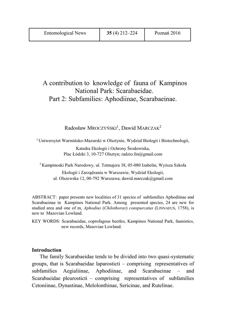 Entomological News 35 (4) 212–224 Poznań 2016 A contribution to knowledge of fauna of Kampinos National Park: Scarabaeidae. Part 2: Subfamilies: Aphodiinae, Scarabaeinae. Radosław MROCZYŃSKI1, Dawid MARCZAK2 1 Uniwersytet Warmińsko-Mazurski w Olsztynie, Wydział Biologii i Biotechnologii, Katedra Ekologii i Ochrony Środowiska, Plac Łódzki 3, 10-727 Olsztyn; [email protected] 2 Kampinoski Park Narodowy, ul. Tetmajera 38, 05-080 Izabelin, Wyższa Szkoła Ekologii i Zarządzania w Warszawie, Wydział Ekologii, ul. Olszewska 12, 00-792 Warszawa; [email protected] ABSTRACT: paper presents new localities of 31 species of subfamilies Aphodiinae and Scarabaeinae in Kampinos National Park. Among presented species, 24 are new for studied area and one of m, Aphodius (Chilothorax) conspurcatus (LINNAEUS, 1758), is new to Mazovian Lowland. KEY WORDS: Scarabaeidae, coprofagous beetles, Kampinos National Park, faunistics, new records, Masovian Lowland. Introduction The family Scarabaeidae tends to be divided into two quasi-systematic groups, that is Scarabaeidae laparosticti – comprising representatives of subfamilies Aegialiinae, Aphodiinae, and Scarabaeinae – and Scarabaeidae pleurosticti – comprising representatives of subfamilies Cetoniinae, Dynastinae, Melolonthinae, Sericinae, and Rutelinae. A CONTRIBUTION TO KNOWLEDGE OF FAUNA OF KAMPINOS N. P. […] 213 In the Polish fauna, the group Scarabaeidae laparosticti is represented by 92 species (BYK 2016), including Aegialiinae – 4, Aphodiinae – 68, Scarabaeinae – 20. The species from this group are represented by saprophages and coprophages (GÓRZ 2003). From the area of Kampinos National Park, only 8 species from this group have been hitherto recorded: Rhysothorax rufus (FABRICIUS, 1792) (MARCZAK & al. 2012), Rhyssemus puncticollis BROWN, 1929 (BYK & MINKINA 2014), Aphodius (Acrossus) rufipes (LINNAEUS, 1758), Aphodius (Aphodius) fimetarius (LINNAEUS, 1758), Aphodius (Bodilopsis) rufus (MOLL, 1782), Aphodius (Bodilopsis) sordidus sordidus (FABRICIUS, 1775), Aphodius (Planolinus) fasciatus (OLIVIER, 1789), Aphodius (Volinus) sticticus (PANZER, 1798) (KUBISZ & al. 2000). The aim of the following study is to supplement the data concerning the occurrence of the representatives of the subfamilies Aegialinae, Aphodiinae, and Scarabaeinae from the area of the Kampinos National Park. Material and methods The presented data come from the authors’ researches and the field work, which has been intensified in recent years. The evidence specimens are stored in the authors’ collections and the natural science collections of the Kampinos National Park. In the study, the following abbreviations have been used: SPA – Strict Protection Area, KNP – the Kampinos National Park, IBL-2 – a screen trap, IBL-5 – a barrier trap, Trox trap – an original, modified Barber’s trap with 5 dm3 in capacity, with the bait consisting of a rotting liver. Next to each locality, the code for a corresponding UTM grid square has been provided. The species new to the Mazovian Lowland have been marked with [*]. The nomenclature for taxa has been adopted after LÖBL and SMETANA (2006). Species overview Aphodiinae LEACH, 1815 Aphodius (Acrossus) depressus (KUGELANN, 1792) – DC69 SPA Zamczysko: 1-31 V 2011 (2 exx.), 1-30 VI 2011 (1 ex.), into an IBL-2 trap in the habitat of Tilio-Carpinetum, 1-30 VI 2011 (1 214 R. MROCZYŃSKI, D. MARCZAK ex.), 1-31 VII 2011 (1 ex.), into an IBL-5 trap hung on an oak; DC79 Brzozówka, 4 IV 2011, 1 ex., in horse feces; DC79 SPA Debły: 1-30 IV 2011 (2 exx.), 1-31 V 2011 (2 exx.), 1-30 VI 2011 (3 exx.), 1-31 V 2015 (5 exx.), 1-30 VI 2015 (2 exx.), into an IBL-2 trap in the habitat of Tilio-Carpinetum, 1-30 IV 2011 (1 ex.), 1-31 V 2011 (2 exx.), 1-30 VI 2011 (1 ex.), into an IBL-5 trap hung on an oak; DC89 SPA Sieraków: 1-30 IV 2011 (1 ex.), 1-31 V 2011 (10 exx.), 1-30 VI 2011 (2 exx.), 1-31 VIII 2011 (1 ex.), 1-31 V 2015 (2 exx.), 1-30 VI 2015 (4 exx.), into an IBL-2 trap in the habitat of Tilio-Carpinetum; DC89 SPA Zaborów Leśny: 1-31 V 2011 (1 ex.), into an IBL-5 trap hung on an oak, 1-31 V 2015 (25 exx.), 1-31 VII 2015 (5 exx.), into an IBL-2 trap in habitat of Tilio-Carpinetum; DC89 Truskaw, 18 VII 2015, 5 exx., in horse feces. A forest species commonly encountered in the whole Poland (BURAKOWSKI & al. 1983, BUNALSKI 2004). New to the Kampinos National Park. Aphodius (Acrossus) rufipes (LINNAEUS, 1758) – DC79 Mosionka, 25 VIII 2011 (10 exx.), in horse feces; DC79 SPA Debły, 1-31 VIII 2011 (1 ex.), 1-31 V 2015 (1 ex.), into an IBL-2 trap in a habitat of Tilio-Carpinetum; DC89 SPA Sieraków, 1-31 V 2011 (1 ex.), 1-30 VI 2011 (1 ex.), 1-31 VII 2011 (2 exx.), 1-31 VIII 2011 (1 ex.), 1-30 VI 2015 (5 exx.), into an IBL-2 trap in a habitat of TilioCarpinetum; DC89 SPA Zaborów Leśny, 1-31 VII 2015, 3 exx., into an IBL-2 trap in a habitat of Tilio-Carpinetum; DC89 Pociecha, 26 VII 2009, 1 ex., on ground; DC89 Truskaw, 18 VII 2015, 1 ex., in horse feces. A common species in the whole Poland encountered in open and forest ecosystems (BURAKOWSKI & al. 1983, BUNALSKI 2004). From the area of the KNP, it was recorded earlier from the SPA Czerwińskie Góry (DC59) by KUBISZ & al. (2000). Aphodius (Agrilinus) ater (DE GEER, 1774) – DC79 Brzozówka, 4 IV 2011 (3 exx.), 12 V 2011 (1 ex.), in horse feces; DC89 Łosiówka, 25 IV 2013, 1 ex., in elk feces; DC89 A CONTRIBUTION TO KNOWLEDGE OF FAUNA OF KAMPINOS N. P. […] 215 Pociecha, 12 III 2010, 1 ex., on the ground; DC89 Truskaw, 18 VII 2015, 4 exx., in horse feces. A species occurring probably in the whole Poland (BURAKOWSKI & al. 1983), locally forming numerous populations (BUNALSKI 2004). It is a species most often collected from forest areas or near them (BUNALSKI 2006). New to the Kampinos National Park. Aphodius (Agoliinus) nemoralis ERICHSON, 1848 – DC79 Brzozówka, 11 IV 2011, 4 exx., in cow dung; DC89 Izabelin, 25 IV 2013, 4 exx., in elk feces; DC89 Łosiówka, 25 IV 20