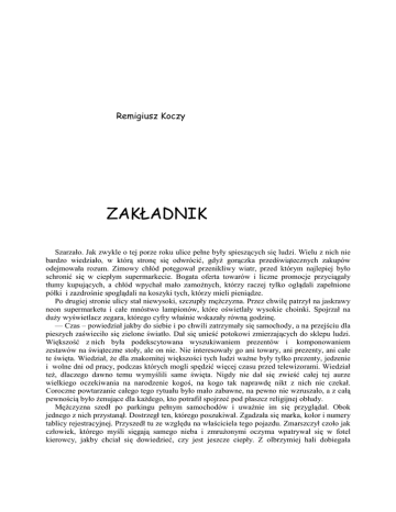 Remigiusz Koczy ZAKŁADNIK Szarzało. Jak zwykle o tej porze roku ulice pełne były spieszących się ludzi. Wielu z nich nie bardzo wiedziało, w którą stronę się odwrócić, gdyŜ gorączka przedświątecznych zakupów odejmowała rozum. Zimowy chłód potęgował przenikliwy wiatr, przed którym najlepiej było schronić się w ciepłym supermarkecie. Bogata oferta towarów i liczne promocje przyciągały tłumy kupujących, a chłód wpychał mało zamoŜnych, którzy raczej tylko oglądali zapełnione półki i zazdrośnie spoglądali na koszyki tych, którzy mieli pieniądze. Po drugiej stronie ulicy stał niewysoki, szczupły męŜczyzna. Przez chwilę patrzył na jaskrawy neon supermarketu i całe mnóstwo lampionów, które oświetlały wysokie choinki. Spojrzał na duŜy wyświetlacz zegara, którego cyfry właśnie wskazały równą godzinę. — Czas – powiedział jakby do siebie i po chwili zatrzymały się samochody, a na przejściu dla pieszych zaświeciło się zielone światło. Dał się unieść potokowi zmierzających do sklepu ludzi. Większość z nich była podekscytowana wyszukiwaniem prezentów i komponowaniem zestawów na świąteczne stoły, ale on nie. Nie interesowały go ani towary, ani prezenty, ani całe te święta. Wiedział, Ŝe dla znakomitej większości tych ludzi waŜne były tylko prezenty, jedzenie i wolne dni od pracy, podczas których mogli spędzić więcej czasu przed telewizorami. Wiedział teŜ, dlaczego dawno temu wymyślili same święta. Nigdy nie dał się zwieść całej tej aurze wielkiego oczekiwania na narodzenie kogoś, na kogo tak naprawdę nikt z nich nie czekał. Coroczne powtarzanie całego tego rytuału było mało zabawne, na pewno nie wzruszało, a z całą pewnością było Ŝenujące dla kaŜdego, kto potrafił spojrzeć pod płaszcz religijnej obłudy. MęŜczyzna szedł po parkingu pełnym samochodów i uwaŜnie im się przyglądał. Obok jednego z nich przystanął. Dostrzegł ten, którego poszukiwał. Zgadzała się marka, kolor i numery tablicy rejestracyjnej. Przyszedł tu ze względu na właściciela tego pojazdu. Zmarszczył czoło jak człowiek, którego myśli sięgają samego nieba i zmruŜonymi oczyma wpatrywał się w fotel kierowcy, jakby chciał się dowiedzieć, czy jest jeszcze ciepły. Z olbrzymiej hali dobiegała muzyka. Gdzieś tam chodzi człowiek, którego musiał we właściwym sobie momencie odnaleźć. Czuł, jak powietrze w supermarkecie wrzało od wielu emocji. Niebawem temperatura znacznie się podniesie i niczym gwałtowna eksplozja wstrząśnie całym zgromadzonym tu ludzkim mrowiem. Ruszył w kierunku wejścia. TuŜ za obrotowymi drzwiami stała młoda kobieta a przy niej kilkuletnia dziewczynka. Obok nich leŜał na podłodze lizak. MęŜczyzna schylił się, podał lizak dziewczynce i niemal proszącym tonem, z delikatnym uśmiechem powiedział jej coś, co miała usłyszeć mama: — Weź mamusię za rączkę i idź z nią do domku. Tam jest o wiele przyjemniej. Spojrzał kobiecie prosto w oczy. Była zaskoczona. Chciała zwymyślać go za bezczelność, ale niezwykłe ciepło bijące z oczu nieznajomego ucięło wzbierający w niej protest, kazało wziąć córkę na ręce i najzwyczajniej pójść do domu. Po kilku krokach męŜczyzna stanął naprzeciw bramek, przez które wchodzono do sali sprzedaŜy. KaŜdemu wchodzącemu przyglądał się pracownik ochrony. Miał kajdanki i paralizator. Słuchawka w uchu dodawała nieco powagi i waŜności misji jaką przyszło mu tu pełnić. Po drugiej stronie bramki stał drugi. Obaj byli młodzi i nieco znudzeni brakiem aktywnego zajęcia. Kiedy spojrzał w lewo, dostrzegł ich jeszcze kilku. Niektórzy w garniturach, inni w czarnych uniformach. Wszyscy pilnowali porządku i strzegli mienia wynajmującej ich firmy, wciąŜ przyglądając się kaŜdemu klientowi, jakby byli zdolni wyśledzić ukryte pod zimowymi kurtkami drobne łupy złodziei. TuŜ obok niego przeszedł jeszcze jeden, towarzysząc blond włosemu aniołowi, który w jedwabistej, lśniącej szacie z małymi skrzydełkami na plecach, koszykiem zawieszonym na przedramieniu i dźwięczącym dzwoneczkiem coś usiłował sprzedawać. Anioł zatrzymał się przy nim. — Opłatek na wigilijny stół – powiedział trzepocząc długimi rzęsami. MęŜczyzna pochylił się, by niemal wprost do ucha dziewczyny stanowczo szepnąć: — Nie uznaję fałszywych aniołów i fałszywych świąt. Wolę to, co jest prawdziwie prawdziwe. Anioł wzruszył ramionami i ruszył szukać klientów na swój świąteczny towar. — Nie daj się oszukać – dorzucił jeszcze męŜczyzna, ale wiedział, Ŝe jest obojętna. — Spadły panu rękawiczki. – Mały chłopiec o szczerbatym uśmiechu stał tuŜ obok i w wyciągniętej dłoni trzymał parę czarnych rękawiczek. — Tymoteusz! – wołał niedaleko jakiś wysoki człowiek w okularach. – Idziemy, pośpiesz się. — Dziękuję – odpowiedział męŜczyzna i przyjął podane rękawiczki. Chłopiec dotknął dłoni męŜczyzny. — Ma pan strasznie zimne ręce – powiedział przejęty. – Rękawiczki trzeba nosić, a nie gubić. — A ty masz bardzo dobre imię. Znam jednego Tymoteusza. Jest kimś bardzo waŜnym, bo słuchał babci i mamy – uśmiechnął się – ... i bardzo mu się to opłaciło. — Babci Lois? – spytał chłopczyk niepewnie. — Tak, Lois – męŜczyzna podniósł znacząco brwi. — I zna go pan? – niedowierzał malec. Jego zmarszczony nos i wielkie oczy wyraŜały głębokie zdumienie. – Jak się pan nazywa? — Ain. — A na imię? — Tylko Ain. Słuchaj ojca, on zna się na rzeczy. Zmykaj, bo się zgubisz. Chłopiec zrobił szybki zwrot na pięcie, ale po kilku krokach odwrócił się, jakby chciał jeszcze raz dobrze przyjrzeć się dziwnemu nieznajomemu w długim płaszczu, który zna babcię Lois i gubi rękawiczki. Ten uśmiechnął się do niego szeroko, wskazał palcem sufit i przyłoŜył otwart