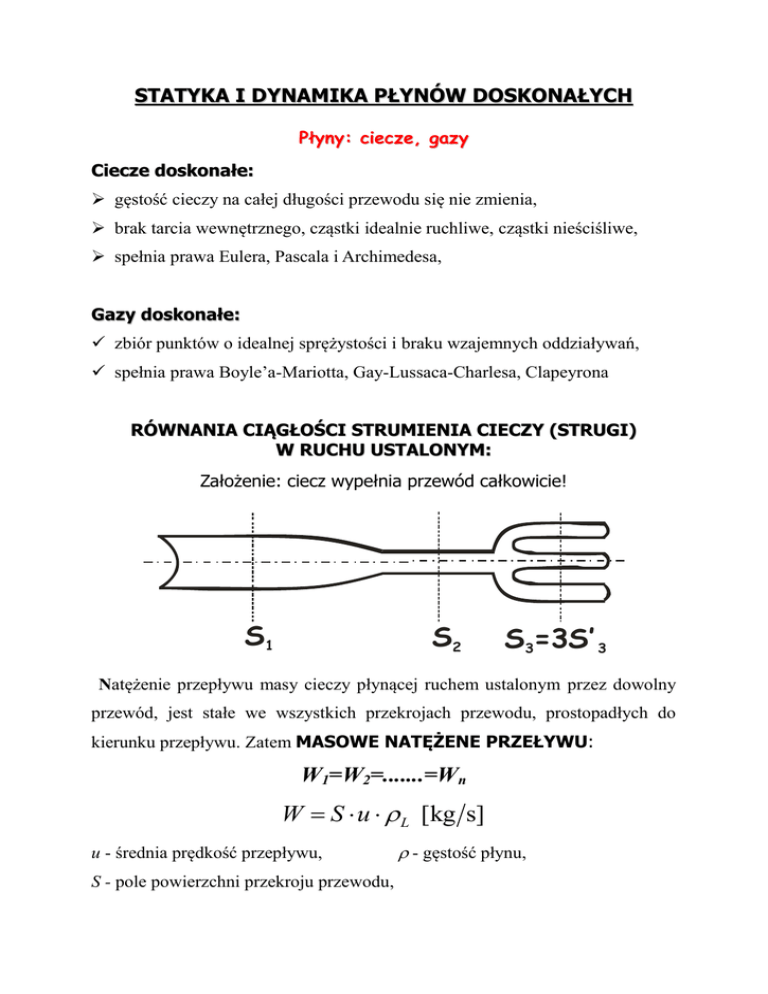 STATYKA I DYNAMIKA PŁYNÓW DOSKONAŁYCH Płyny: ciecze, gazy Ciecze doskonałe: gęstość cieczy na całej długości przewodu się nie zmienia, brak tarcia wewnętrznego, cząstki idealnie ruchliwe, cząstki nieściśliwe, spełnia prawa Eulera, Pascala i Archimedesa, Gazy doskonałe: zbiór punktów o idealnej sprężystości i braku wzajemnych oddziaływań, spełnia prawa Boyle’a-Mariotta, Gay-Lussaca-Charlesa, Clapeyrona RÓWNANIA CIĄGŁOŚCI STRUMIENIA CIECZY (STRUGI) W RUCHU USTALONYM: Założenie: ciecz wypełnia przewód całkowicie! S1 S2 S3=3S’ 3 Natężenie przepływu masy cieczy płynącej ruchem ustalonym przez dowolny przewód, jest stałe we wszystkich przekrojach przewodu, prostopadłych do kierunku przepływu. Zatem MASOWE NATĘŻENE PRZEŁYWU: W1=W2=.......=Wn W S u L [kg s] u - średnia prędkość przepływu, S - pole powierzchni przekroju przewodu, - gęstość płynu, U S u [m3 s] OBJĘTOŚCIOWE NATĘŻENIE PRZEPŁYWU W U L [kg s] zakładając brak zmian gęstości płynu na całej długości przewodu (przepływ izotermiczny, płyny są wówczas nieściśliwe) można stwierdzić, że: U1=U2=.....=Un S1 u1 S 2 u 2 S n un S1 u1 S 2 u 2 zakładając przekrój kołowy pole przekroju S wyniesie odpowiednio: d12 4 u1 d 22 4 u2 u1 d 22 2 u 2 d1 PRĘDKOŚĆ MASOWA STRUMIENIA CIECZY Jest to stosunek masowego natężenia przepływu do pola powierzchni przekroju przewodu. wL W S u L u L S S [kg m2 s] RÓWNANIE BERNOULIEGO DLA PŁYNU DOSKONAŁEGO dl1 1 S1 p1 1’ u1 z1 dl2 2 p2 u2 z2 S2 2’ poziom zerowy gęstość płynu jest wielkością stałą L=const Energia kinetyczna: u22 u12 mv2 dmu2 dEK dm 2 2 2 2 dm S u d L Praca sił ciśnienia (energia potencjalna ciśnienia): dA p1S1u1d p2 S2u2d Energia potencjalna położenia: dE p S1u1d L gz1 S2u2 d L gz2 ZASADA ZACHOWANIA ENERGII (wzrost energii kinetycznej powoduje jednoczesny spadek energii potencjalnej położenia i ciśnienia): dE k dE p dA po podstawieniu i skróceniu przez S u d , ponieważ zachowana jest zasada ciągłości strugi otrzymuje się: u12 p1 u22 p2 g z1 g z2 const /:g 2 L 2 L w powyższym równaniu każdy z członów ma wymiar [m2/s2] u2 2g p zH L g natomiast w powyższym równaniu każdy z członów ma wymiar [m] Z równania tego wynika, że suma trzech wysokości a mianowicie wysokości odpowiadającej ciśnieniu dynamicznemu odpowiadającej ciśnieniu statycznemu u2 2g , wysokości p i wysokości niwelacyjnej L g (odniesienia) z jest wielkością stałą dla jednostki masy strugi w każdym przekroju przewodu. lub inaczej W czasie ustalonego ruchu cieczy doskonałej suma energii kinetycznej, energii ciśnienia i energii potencjalnej położenia dla jednostki masy płynącej strugi cieczy jest wielkością stałą. RÓWNANIE BERNOULIEGO DLA PŁYNU DOSKONAŁEGO z - wysokość położenia tj. wysokość wzniesienia środka określonego przekroju poprzecznego strugi cieczy ponad przyjęty poziom odniesienia p g - wysokość ciśnienia tj. wysokość wzniesienia takiego słupa cieczy, która na podstawę wywiera ciśnienie p u2 - wysokość prędkości tj. wysokość, z której ciecz musiałaby swobodnie 2g spadać, aby osiągnąć prędkość końcową u. W większości w praktyce przewody są poziome lub bardzo zbliżone do poziomu, czyli z1=z2 (człony te opuszcza się w równaniu). Przekształcając dalej równanie Bernouliego, mnożąc przez g otrzymuje się: u22 u12 p1 p2 2 czyli zwiększenie prędkości spowoduje spadek ciśnienia i odwrotnie. Gdy natomiast w równaniu u2 2g p z const opuści się z i pomnoży L g obie strony przez g otrzyma się następujące równanie u2 p const . 2 Każdy z członów ma wymiar ciśnienia [Pa], zatem otrzymuje się wyrażenie u2 na ciśnienie całkowite pc, gdzie jest ciśnieniem dynamicznym pd a p 2 jest ciśnieniem statycznym ps. Stąd prędkość można obliczyć w oparciu o następujący wzór: u 2 ( pc ps ) 2 pd m s Objętościowe natężenie przepływu wynosi zatem: U S u S 2 ( pc ps ) S 2 pd m3 s Natomiast masowe natężenie przepływu jest następujące: kg W S u S 2 ( pc ps ) S 2 pd s INTERPRETACJA GRAFICZNA RÓWNANIA BERNOULIEGO DLA CIECZY DOSKONAŁEJ 1. Równoległy, poziomy przebieg przewodu w stosunku do poziomu odniesienia. Przekrój przewodu wzdłuż całej długości jest stały tzn., że prędkość przepływu też jest stała. Istnieje zatem niezmienność wysokości: odniesienia, statycznego i dynamicznego przy w/w położeniu przewodu. ciśnienia 2. Przewód przebiega pod kątem w stosunku do poziomu odniesienia. Przekrój przewodu jest stały. Mimo zmienności wartości trzech wysokości ich suma jest wielkością stałą. 3. Równoległy, poziomy przebieg przewodu w stosunku do poziomu odniesienia. Przekrój przewodu zmienny tzn., że prędkości są różne w różnych przekrojach przewodu. Zwiększenie przekroju oznacza zmniejszenie prędkości przepływu tzn. zmniejszenie energii kinetycznej wzrasta natomiast ciśnienie statyczne. Odwrotnie gdy przekrój zmniejsza się, wzrasta energia kinetyczna czyli ciśnienie dynamiczne a spada ciśnienie statyczne. 4. Przebieg przewodu pod kątem w stosunku do poziomu odniesienia. Przekrój przewodu zmienny tzn., że prędkości są różne w różnych przekrojach przewodu. (Interpretacja identyczna jak w przypadku 2 i 3). DYNAMIKA PŁYNÓW RZECZYWISTYCH RÓWNANIE BERNOULIEGO DLA PŁYNÓW RZECZYWISTYCH CZĘŚĆ ENERGII JEST TRACONA I ZAMIENIANA NA CIEPŁO Wysokość he odpowiada energii kinetycznej, która jest stała dla każdego z przekrojów (średnica przewodu jest niezmienna). Obserwowane straty ciśnienia tłumaczy się oporami jakie musi pokonać ciecz w czasie przepływu. Opory te wynikają z występowania tarcia wewnętrznego cieczy rzeczywistych jak również mogą być związane z nagłą zmianą przekroju przewodu i kierunku przepływu, istnieniem na przewodzie kurków, zaworów, zasuw itp.. P f (d , L, u, F , F ) RÓWNANIE BERNOULIEGO DLA PŁYNÓW RZECZYWISTYCH pstr m 2 u12 p1 u 22 p2 g