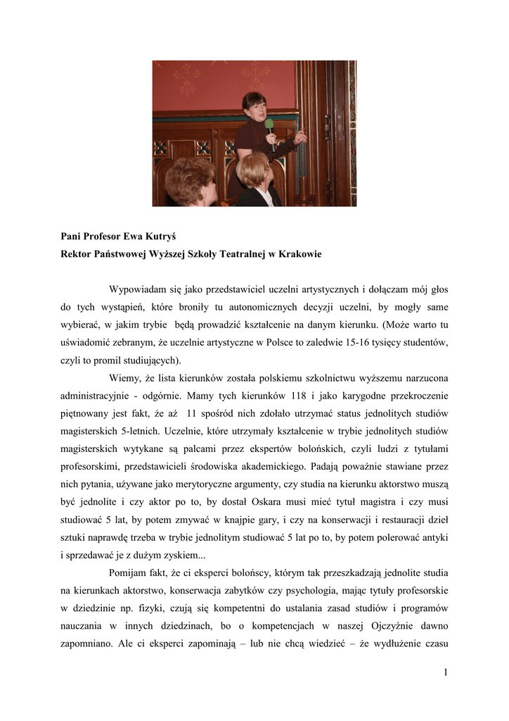 Pani Profesor Ewa Kutryś Rektor Państwowej WyŜszej Szkoły Teatralnej w Krakowie Wypowiadam się jako przedstawiciel uczelni artystycznych i dołączam mój głos do tych wystąpień, które broniły tu autonomicznych decyzji uczelni, by mogły same wybierać, w jakim trybie będą prowadzić kształcenie na danym kierunku. (MoŜe warto tu uświadomić zebranym, Ŝe uczelnie artystyczne w Polsce to zaledwie 15-16 tysięcy studentów, czyli to promil studiujących). Wiemy, Ŝe lista kierunków została polskiemu szkolnictwu wyŜszemu narzucona administracyjnie - odgórnie. Mamy tych kierunków 118 i jako karygodne przekroczenie piętnowany jest fakt, Ŝe aŜ 11 spośród nich zdołało utrzymać status jednolitych studiów magisterskich 5-letnich. Uczelnie, które utrzymały kształcenie w trybie jednolitych studiów magisterskich wytykane są palcami przez ekspertów bolońskich, czyli ludzi z tytułami profesorskimi, przedstawicieli środowiska akademickiego. Padają powaŜnie stawiane przez nich pytania, uŜywane jako merytoryczne argumenty, czy studia na kierunku aktorstwo muszą być jednolite i czy aktor po to, by dostał Oskara musi mieć tytuł magistra i czy musi studiować 5 lat, by potem zmywać w knajpie gary, i czy na konserwacji i restauracji dzieł sztuki naprawdę trzeba w trybie jednolitym studiować 5 lat po to, by potem polerować antyki i sprzedawać je z duŜym zyskiem... Pomijam fakt, Ŝe ci eksperci bolońscy, którym tak przeszkadzają jednolite studia na kierunkach aktorstwo, konserwacja zabytków czy psychologia, mając tytuły profesorskie w dziedzinie np. fizyki, czują się kompetentni do ustalania zasad studiów i programów nauczania w innych dziedzinach, bo o kompetencjach w naszej Ojczyźnie dawno zapomniano. Ale ci eksperci zapominają – lub nie chcą wiedzieć – Ŝe wydłuŜenie czasu 1 studiów na tym sławetnym np. kierunku aktorstwo spowodowane zostało decyzjami nowej ustawy i Rady Głównej Szkolnictwa WyŜszego, które powoływały się na wymogi procesu bolońskiego. Wcześniej studia na tym kierunku trwały 4 lata. Zgodnie z zaleceniami ministerstwa w czasie wdraŜania zasad procesu bolońskiego w uczelniach teatralnych (podobnie jak w innych) zostały przeprowadzone przez powołanych przez ówczesne Ministerstwo Edukacji Narodowej ekspertów konsultacje środowiskowe i ich wynikiem były decyzje uczelni artystycznych o konieczności kształcenie na niektórych kierunkach w trybie jednolitych studiów magisterskich, a nie w trybie dwustopniowym. Ministerstwo akceptowało te decyzje, by potem- poza wiedzą naszych uczelni - je zmieniać. Nasze wybory - jednolitego trybu kształcenia – zostały uzasadnione wieloma argumentami. Na poparcie zasadności tych decyzji niech słuŜą i takie przykłady, Ŝe np. angielskie szkoły teatralne kształcą w dalszym ciągu w trybie jednolitych 4-letnich studiów artystycznych, Ŝe we Wiedniu kształcenie teatralne teŜ jest w jednolitym 4-letnim trybie, Ŝe uczelnie w Pradze i Brnie przeszły jako jedne z pierwszych na system dwustopniowy (3+2) a obecnie wróciły – za zgodą swojego ministerstwa edukacji – do trybu jednolitych studiów. Wszystkie wymienione tu kraje i uczelnie funkcjonują w europejskim systemie edukacji i one mogły wybrać. Nam wszelkimi moŜliwymi sposobami próbuje się narzucić jeden – urzędniczy, równy dla wszystkich model. PrzyjeŜdŜają do nas przedstawiciele zagranicznych uczelni artystycznych i czerpią z naszych doświadczeń i naszych programów. I nie mogą zrozumieć, Ŝe musimy się bronić przed decyzjami naszych polskich ekspertów i urzędników. Bo to nie proces boloński narzuca takie wymaganie. Proces boloński daje moŜliwość wyboru. Pan dr hab. Andrzej Kraśniewski w swoich opracowaniach dotyczących wdraŜania zasad procesu bolońskiego wielokrotnie o tym pisał. I zabierający tu dzisiaj głos przedstawiciel Rady Głównej Szkolnictwa WyŜszego to wyraźnie potwierdził. Mamy to nagrane. W interesie polskiego szkolnictwa wyŜszego jest to, by uczelnie autonomicznie decydowały o tym, w jakim trybie będą prowadzić kształcenie. 2