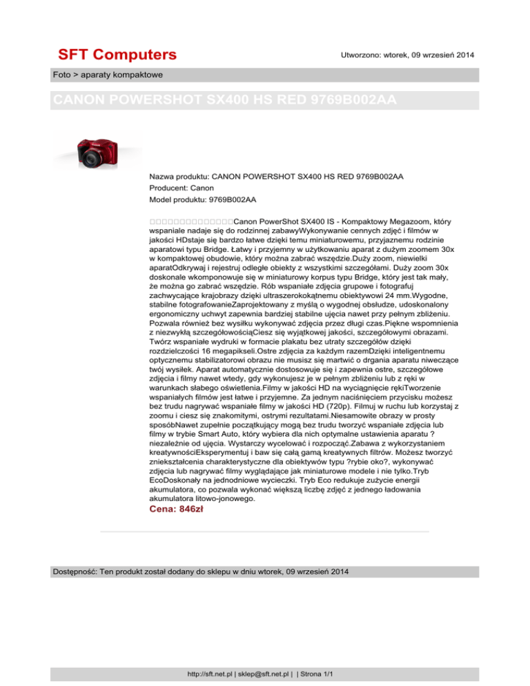 SFT Computers Utworzono: wtorek, 09 wrzesień 2014 Foto > aparaty kompaktowe CANON POWERSHOT SX400 HS RED 9769B002AA Nazwa produktu: CANON POWERSHOT SX400 HS RED 9769B002AA Producent: Canon Model produktu: 9769B002AA Canon PowerShot SX400 IS - Kompaktowy Megazoom, który wspaniale nadaje się do rodzinnej zabawyWykonywanie cennych zdjęć i filmów w jakości HDstaje się bardzo łatwe dzięki temu miniaturowemu, przyjaznemu rodzinie aparatowi typu Bridge. Łatwy i przyjemny w użytkowaniu aparat z dużym zoomem 30x w kompaktowej obudowie, który można zabrać wszędzie.Duży zoom, niewielki aparatOdkrywaj i rejestruj odległe obiekty z wszystkimi szczegółami. Duży zoom 30x doskonale wkomponowuje się w miniaturowy korpus typu Bridge, który jest tak mały, że można go zabrać wszędzie. Rób wspaniałe zdjęcia grupowe i fotografuj zachwycające krajobrazy dzięki ultraszerokokątnemu obiektywowi 24 mm.Wygodne, stabilne fotografowanieZaprojektowany z myślą o wygodnej obsłudze, udoskonalony ergonomiczny uchwyt zapewnia bardziej stabilne ujęcia nawet przy pełnym zbliżeniu. Pozwala również bez wysiłku wykonywać zdjęcia przez długi czas.Piękne wspomnienia z niezwykłą szczegółowościąCiesz się wyjątkowej jakości, szczegółowymi obrazami. Twórz wspaniałe wydruki w formacie plakatu bez utraty szczegółów dzięki rozdzielczości 16 megapikseli.Ostre zdjęcia za każdym razemDzięki inteligentnemu optycznemu stabilizatorowi obrazu nie musisz się martwić o drgania aparatu niweczące twój wysiłek. Aparat automatycznie dostosowuje się i zapewnia ostre, szczegółowe zdjęcia i filmy nawet wtedy, gdy wykonujesz je w pełnym zbliżeniu lub z ręki w warunkach słabego oświetlenia.Filmy w jakości HD na wyciągnięcie rękiTworzenie wspaniałych filmów jest łatwe i przyjemne. Za jednym naciśnięciem przycisku możesz bez trudu nagrywać wspaniałe filmy w jakości HD (720p). Filmuj w ruchu lub korzystaj z zoomu i ciesz się znakomitymi, ostrymi rezultatami.Niesamowite obrazy w prosty sposóbNawet zupełnie początkujący mogą bez trudu tworzyć wspaniałe zdjęcia lub filmy w trybie Smart Auto, który wybiera dla nich optymalne ustawienia aparatu ? niezależnie od ujęcia. Wystarczy wycelować i rozpocząć.Zabawa z wykorzystaniem kreatywnościEksperymentuj i baw się całą gamą kreatywnych filtrów. Możesz tworzyć zniekształcenia charakterystyczne dla obiektywów typu ?rybie oko?, wykonywać zdjęcia lub nagrywać filmy wyglądające jak miniaturowe modele i nie tylko.Tryb EcoDoskonały na jednodniowe wycieczki. Tryb Eco redukuje zużycie energii akumulatora, co pozwala wykonać większą liczbę zdjęć z jednego ładowania akumulatora litowo-jonowego. Cena: 846zł Dostępność: Ten produkt został dodany do sklepu w dniu wtorek, 09 wrzesień 2014 http://sft.net.pl | [email protected] | | Strona 1/1