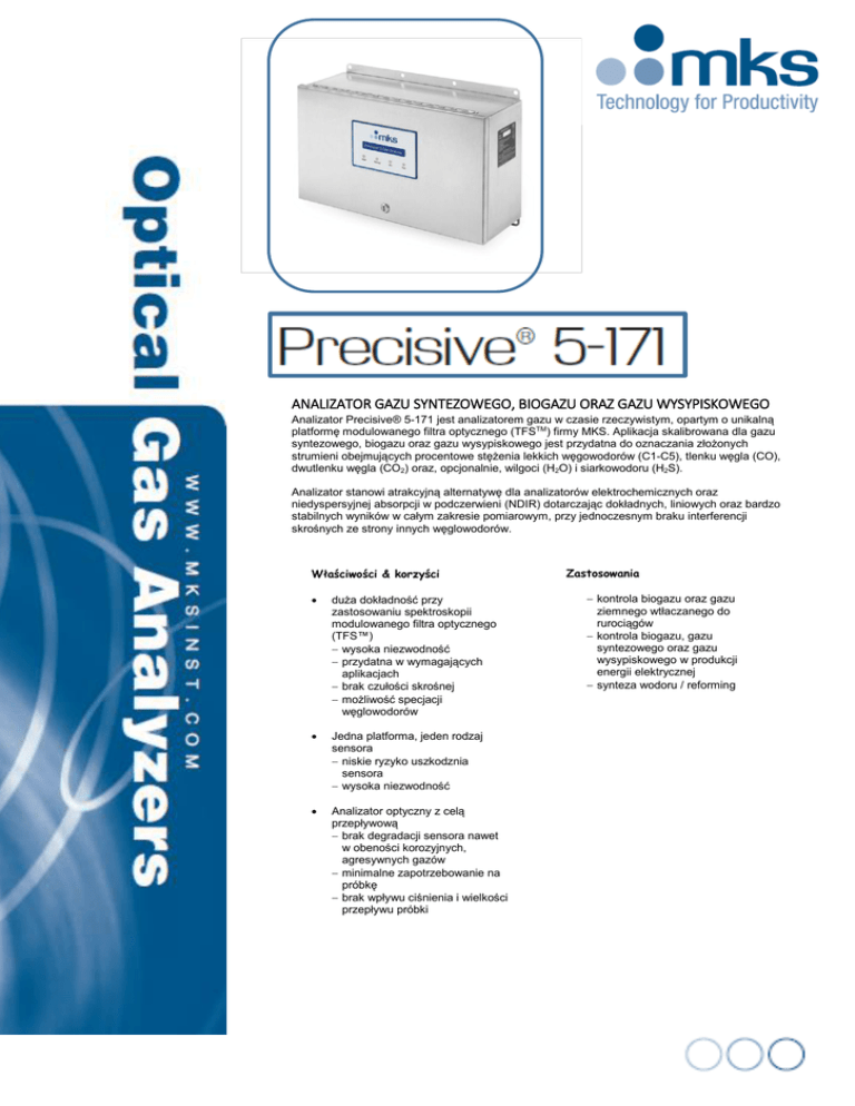 ANALIZATOR GAZU SYNTEZOWEGO, BIOGAZU ORAZ GAZU WYSYPISKOWEGO Analizator Precisive® 5-171 jest analizatorem gazu w czasie rzeczywistym, opartym o unikalną platformę modulowanego filtra optycznego (TFSTM) firmy MKS. Aplikacja skalibrowana dla gazu syntezowego, biogazu oraz gazu wysypiskowego jest przydatna do oznaczania złożonych strumieni obejmujących procentowe stężenia lekkich węgowodorów (C1-C5), tlenku węgla (CO), dwutlenku węgla (CO2) oraz, opcjonalnie, wilgoci (H2O) i siarkowodoru (H2S). Analizator stanowi atrakcyjną alternatywę dla analizatorów elektrochemicznych oraz niedyspersyjnej absorpcji w podczerwieni (NDIR) dotarczając dokładnych, liniowych oraz bardzo stabilnych wyników w całym zakresie pomiarowym, przy jednoczesnym braku interferencji skrośnych ze strony innych węglowodorów. Właściwości & korzyści duża dokładność przy zastosowaniu spektroskopii modulowanego filtra optycznego (TFS™) wysoka niezwodność przydatna w wymagających aplikacjach brak czułości skrośnej możliwość specjacji węglowodorów Jedna platforma, jeden rodzaj sensora niskie ryzyko uszkodznia sensora wysoka niezwodność Analizator optyczny z celą przepływową brak degradacji sensora nawet w obeności korozyjnych, agresywnych gazów minimalne zapotrzebowanie na próbkę brak wpływu ciśnienia i wielkości przepływu próbki Zastosowania kontrola biogazu oraz gazu ziemnego wtłaczanego do rurociągów kontrola biogazu, gazu syntezowego oraz gazu wysypiskowego w produkcji energii elektrycznej synteza wodoru / reforming Dane techniczne Zakresy pomiarowe metan etan propan izo-butan suma n-butanu i n-pentanu suma izo-pentanu i neo-pentanu CO CO2 wartość opałowa indeks Wobbego Balans Dokładność/powtarzalność azot, ślady H2O, ślady H2S węglowodory: <0.5% obj. CO, CO2: 1% obj domyślnie co 5 sek. (ustawialne między 1-120 sek. <0.2%/miesiąc (maks. 0.5% w ciągu 18 miesięcy) 0.1-5 psig 0.1-2 l/min. CSA Class 1 Div.2 Groups A/B/C/D T4 ATEX Zone 2 Ex nA nC IIC T4 Gc IECEx Odświeżanie wyniku Dryft zera Ciśnienie próbki Przepływ próbki Certyfikaty OMC ENVAG Sp. z o.o. ul. Iwonicka 21 02-924 Warszawa NIP: 526-000-03-76 0-100% 0-25% 0-25% 0-10% 0-10% 0-5% 0-100% 0-100% wg. ISO 6976:1995 wg. ISO 6976:1995 tel. +48 (22) 858 78 78 fax +48 (22) 858 78 97 www.envag.com.pl e-mail: [email protected] Raiffeisen Bank Polska S.A. ul. Piękna 20 00-549 Warszawa Konto: 34 1750 0009 0000 0000 0448 6315 Sąd Rejonowy dla m.st. Warszawy XIII Wydział Gospodarczy KRS Numer KRS: 0000186556 Kapitał zakładowy: 50000 PLN