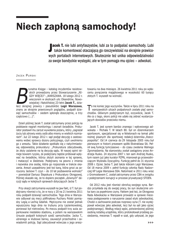 Niech zapłoną samochody! J acek T. nie lubi antyfaszystów, lubi za to podpalać samochody. Lubi także komentować otaczającą go rzeczywistość na skrajnie prawicowych portalach internetowych. Skutecznie też unika odpowiedzialności za swoje bandyckie występki, ale w tym pomaga mu ojciec – adwokat. JACEK PURSKI B runatna Księga – katalog incydentów rasistowskich prowadzony przez Stowarzyszenie „NIGDY WIĘCEJ”: „WARSZAWA. 18 lutego 2012 r. wieczorem w okolicach ulic Oleandrów, Nowowiejskiej i Natolińskiej 23-letni Jacek T., działacz skrajnej prawicy i pseudokibic Legii Warszawa, znany ze skrajnie prawicowych poglądów, podpalił dziesięć samochodów – siedem spłonęło doszczętnie, a trzy częściowo (...)”. Dzień później Jacek T. został zatrzymany przez policję na podstawie nagrań monitoringu i zeznań świadków. Prokurator postawił mu zarzut wywołania pożaru, który „zagrażał życiu lub zdrowiu wielu osób albo mieniu w wielkich rozmiarach”. Już 22 lutego 2012 r. sąd podjął decyzję o zastosowaniu wobec sprawcy dozoru policyjnego, czyli uwolnieniu go z aresztu. Takie działanie spotkało się z natychmiastową odpowiedzią prokuratury: „Prokuratura zdecydowała, że złoży zażalenie na tę decyzję sądu. W naszej opinii istnieje bowiem ryzyko, że podejrzany będzie próbował wpływać na świadków, którzy złożyli zeznania w tej sprawie, i mataczyć w śledztwie. Podejrzany na pewno z imienia i nazwiska zna osobę, która go rozpoznała w trakcie okazania. Areszt uzasadniony jest też karą, która grozi za zarzucony Jackowi T. czyn – do 10 lat pozbawienia wolności” – powiedział Dariusz Ślepokura z Prokuratury Okręgowej. Później okazało się, że to dopiero początek „dziwnych” decyzji sądu w kolejnych sprawach dotyczących Jacka T. Przy okazji zatrzymania wyszedł na jaw fakt, iż T. był podejrzany również o to, że w nocy z 20 na 21 kwietnia 2011 roku podpalił dziewięć samochodów. Tego dnia w Warszawie odbywał się mecz półfinałowy Pucharu Polski pomiędzy Legią a Lechią Gdańsk. Mężczyzna nie został jednak wpuszczony tego dnia na trybuny przy Łazienkowskiej, ponieważ był nietrzeźwy. Po meczu podpalił trzy auta zaparkowane niedaleko stadionu, a potem na warszawskim Ursusie podpalił kolejnych sześć samochodów. Jacka T., ubranego w klubowe barwy, zauważyli przechodnie i zawiadomili policję. Sąd zdecydował wówczas o jego aresz- towaniu na dwa miesiące. 26 kwietnia 2011 roku po wpłaceniu poręczenia majątkowego w wysokości 60 tysięcy złotych T. wyszedł na wolność. T o nie koniec jego wyczynów. Także w lipcu 2011 roku na warszawskich ulicach podpalonych zostało pięć samochodów. Głównym podejrzanym był, oczywiście, Jacek T. Ale co z tego, skoro policji nie udało się zebrać wystarczających dowodów przeciwko niemu. Jacek T. jest synem bardzo znanego i wpływowego adwokata – Michała T. W latach 80. był on dziennikarzem sportowym, specjalizował się w felietonach na temat piłki nożnej pisanych dla sportowej redakcji dziennika „Rzeczpospolita”. Od 14 czerwca do 29 listopada 2005 roku był pierwszym w historii prezesem spółki Ekstraklasa SA. Pełnił swą funkcję tymczasowo – do czasu zwołania Walnego Zgromadzenia. Na stanowisku został zastąpiony przez Andrzeja Rusko. 24 stycznia 2007 r. ten sam Andrzej Rusko, tym razem już jako kurator PZPN, mianował go przewodniczącym Wydziału Dyscypliny. Funkcję pełnił do 31 stycznia 2008 r. Ojciec Jacka T. jest także kibicem Legii Warszawa. Od 18 marca 2009 r. pełnił funkcję członka Rady Nadzorczej KP Legia Warszawa SSA. Natomiast w 2011 roku wraz z Gromosławem C. został zatrzymany przez CBA w związku z podejrzeniami korupcji w procesie prywatyzacji STOEN. Od 2012 roku jest również obrońcą swojego syna. Bardzo przykłada się do swojej pracy, bo syn skutecznie unika kary za popełnione czyny. Faktem jest też, że Okręgowa Rada Adwokacka w Warszawie prowadzi w sprawie mecenasa postępowanie o naruszenie zasad etyki adwokackiej. Chodzi o zachowanie podczas rozprawy syna (T. nie występował wówczas jako adwokat, lecz był na sali jako ojciec podejrzanego). Według relacji sędzi, potwierdzonej później osobną notatką urzędnika, który protokołował przebieg posiedzenia, mecenas T. wpadł w szał, gdy usłyszał, że jego uuu Zatrzymanie Jacka T. w lutym 2012 roku syn zostaje w areszcie. Adwokat podszedł do stołu sędziowskiego, był agresywny. W pewnym momencie wyrwał sędzi z rąk ostatni tom akt. Później cisnął nim o stół. Sędzia dwukrotnie naciskała przycisk alarmowy wzywający ochronę, ale strażnicy nie przychodzili. Potem poprosiła protokolanta, by otworzył drzwi na korytarz, licząc na to, że ktoś usłyszy okrzyki dochodzące z sali i przyjdzie jej z pomocą. Sprawa, podczas której doszło do tych wydarzeń, miała związek z kolejnymi podpaleniami. W nocy z 23 na 24 lutego 2013 roku na ulicy Oleandrów Jacek T. ponownie podpalił dwa samochody. Następnej nocy podłożył ogień pod kolejnych pięć pojazdów. Zatrzymanemu przez policję postawiono zarzuty podpalenia pięciu samochodów w centrum stolicy. „Nie przyznał się do zarzuconych czynów. Odmówił składania wyjaśnień” – powiedział Zdzisław Kuropatwa, szef Prokuratury Warszawa-Śródmieście. a tym historia się nie kończy, o ile kiedykolwiek ten festiwal bezkarności ma szansę się skończyć... Ale Jacek T. to nie tylko notoryczny podpalacz. Realizuje się także w działalności publicystycnej. W 2008 roku Jacek T. na portalu salon24.pl opublikował tekst o wykopywaniu rasizmu ze stadionów, w którym szkalował Stowarzyszenie „NIGDY WIĘCEJ”. Przytacza w nim wiele argumentów, które jednoznacznie wskazują na jego ideologiczne sympatie. Wystarczy trochę dokładniej poszukać informacji o Jacku T., by przekonać się o jego związkach z Młodzieżą Wszechpolską. W siódmym num