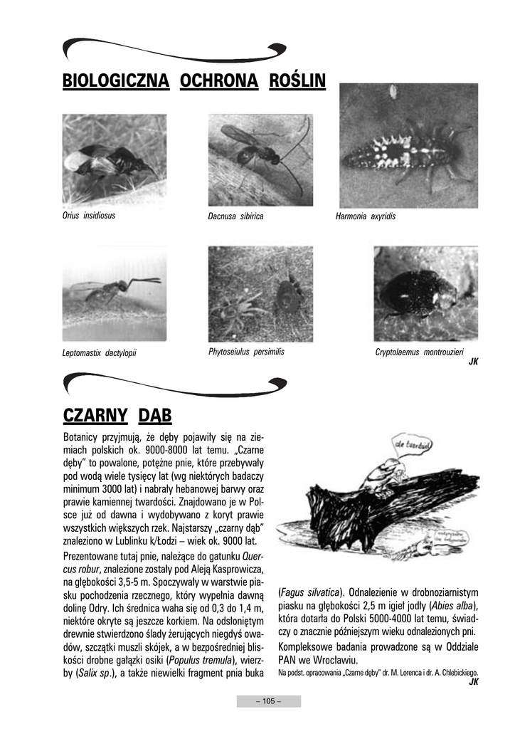 BIOLOGICZNA OCHRONA ROŚLIN Orius insidiosus Dacnusa sibirica Leptomastix dactylopii Phytoseiulus persimilis Harmonia axyridis Cryptolaemus montrouzieri JK CZARNY DĄB Botanicy przyjmują, że dęby pojawiły się na ziemiach polskich ok. 9000-8000 lat temu. „Czarne dęby” to powalone, potężne pnie, które przebywały pod wodą wiele tysięcy lat (wg niektórych badaczy minimum 3000 lat) i nabrały hebanowej barwy oraz prawie kamiennej twardości. Znajdowano je w Polsce już od dawna i wydobywano z koryt prawie wszystkich większych rzek. Najstarszy „czarny dąb” znaleziono w Lublinku k/Łodzi – wiek ok. 9000 lat. Prezentowane tutaj pnie, należące do gatunku Quercus robur, znalezione zostały pod Aleją Kasprowicza, na głębokości 3,5-5 m. Spoczywały w warstwie piasku pochodzenia rzecznego, który wypełnia dawną dolinę Odry. Ich średnica waha się od 0,3 do 1,4 m, niektóre okryte są jeszcze korkiem. Na odsłoniętym drewnie stwierdzono ślady żerujących niegdyś owadów, szczątki muszli skójek, a w bezpośredniej bliskości drobne gałązki osiki (Populus tremula), wierzby (Salix sp.), a także niewielki fragment pnia buka (Fagus silvatica). Odnalezienie w drobnoziarnistym piasku na głębokości 2,5 m igieł jodły (Abies alba), która dotarła do Polski 5000-4000 lat temu, świadczy o znacznie późniejszym wieku odnalezionych pni. Kompleksowe badania prowadzone są w Oddziale PAN we Wrocławiu. Na podst. opracowania „Czarne dęby” dr. M. Lorenca i dr. A. Chlebickiego. – 105 – JK