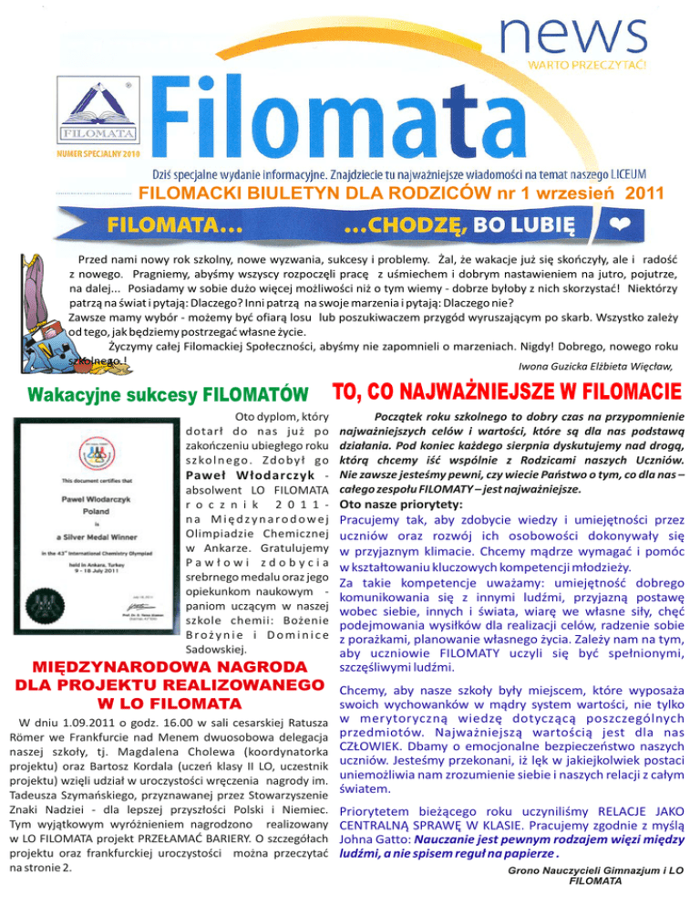 FILOMACKI BIULETYN DLA RODZICÓW nr 1 wrzesień 2011 Przed nami nowy rok szkolny, nowe wyzwania, sukcesy i problemy. Żal, że wakacje już się skończyły, ale i radość z nowego. Pragniemy, abyśmy wszyscy rozpoczęli pracę z uśmiechem i dobrym nastawieniem na jutro, pojutrze, na dalej... Posiadamy w sobie dużo więcej możliwości niż o tym wiemy - dobrze byłoby z nich skorzystać! Niektórzy patrzą na świat i pytają: Dlaczego? Inni patrzą na swoje marzenia i pytają: Dlaczego nie? Zawsze mamy wybór - możemy być ofiarą losu lub poszukiwaczem przygód wyruszającym po skarb. Wszystko zależy od tego, jak będziemy postrzegać własne życie. Życzymy całej Filomackiej Społeczności, abyśmy nie zapomnieli o marzeniach. Nigdy! Dobrego, nowego roku szkolnego.! Iwona Guzicka Elżbieta Więcław, Wakacyjne sukcesy FILOMATÓW Oto dyplom, który dotarł do nas już po zakończeniu ubiegłego roku sz ko l n e go . Zd o b y ł go Paweł Włodarczyk absolwent LO FILOMATA r o c z n i k 2 0 1 1 na Międzynarodowej Olimpiadzie Chemicznej w Ankarze. Gratulujemy Pawłowi zdobycia srebrnego medalu oraz jego opiekunkom naukowym paniom uczącym w naszej szkole chemii: Bożenie Brożynie i Dominice Sadowskiej. TO, CO NAJWAŻNIEJSZE W FILOMACIE Początek roku szkolnego to dobry czas na przypomnienie najważniejszych celów i wartości, które są dla nas podstawą działania. Pod koniec każdego sierpnia dyskutujemy nad drogą, którą chcemy iść wspólnie z Rodzicami naszych Uczniów. Nie zawsze jesteśmy pewni, czy wiecie Państwo o tym, co dla nas – całego zespołu FILOMATY – jest najważniejsze. Oto nasze priorytety: Pracujemy tak, aby zdobycie wiedzy i umiejętności przez uczniów oraz rozwój ich osobowości dokonywały się w przyjaznym klimacie. Chcemy mądrze wymagać i pomóc w kształtowaniu kluczowych kompetencji młodzieży. Za takie kompetencje uważamy: umiejętność dobrego komunikowania się z innymi ludźmi, przyjazną postawę wobec siebie, innych i świata, wiarę we własne siły, chęć podejmowania wysiłków dla realizacji celów, radzenie sobie z porażkami, planowanie własnego życia. Zależy nam na tym, aby uczniowie FILOMATY uczyli się być spełnionymi, szczęśliwymi ludźmi. MIĘDZYNARODOWA NAGRODA DLA PROJEKTU REALIZOWANEGO Chcemy, aby nasze szkoły były miejscem, które wyposaża swoich wychowanków w mądry system wartości, nie tylko W LO FILOMATA W dniu 1.09.2011 o godz. 16.00 w sali cesarskiej Ratusza Römer we Frankfurcie nad Menem dwuosobowa delegacja naszej szkoły, tj. Magdalena Cholewa (koordynatorka projektu) oraz Bartosz Kordala (uczeń klasy II LO, uczestnik projektu) wzięli udział w uroczystości wręczenia nagrody im. Tadeusza Szymańskiego, przyznawanej przez Stowarzyszenie Znaki Nadziei - dla lepszej przyszłości Polski i Niemiec. Tym wyjątkowym wyróżnieniem nagrodzono realizowany w LO FILOMATA projekt PRZEŁAMAĆ BARIERY. O szczegółach projektu oraz frankfurckiej uroczystości można przeczytać na stronie 2. w merytoryczną wiedzę dotyczącą poszczególnych przedmiotów. Najważniejszą wartością jest dla nas CZŁOWIEK. Dbamy o emocjonalne bezpieczeństwo naszych uczniów. Jesteśmy przekonani, iż lęk w jakiejkolwiek postaci uniemożliwia nam zrozumienie siebie i naszych relacji z całym światem. Priorytetem bieżącego roku uczyniliśmy RELACJE JAKO CENTRALNĄ SPRAWĘ W KLASIE. Pracujemy zgodnie z myślą Johna Gatto: Nauczanie jest pewnym rodzajem więzi między ludźmi, a nie spisem reguł na papierze . Grono Nauczycieli Gimnazjum i LO FILOMATA Rada Pedagogiczna Gimnazjum i LO FILOMATA Dyrektor szkoły- Elżbieta Więcław (nauczyciel języka polskiego i retoryki), Wicedyrektor szkoły - Iwona Guzicka (Prezes FILOMATA Sp.z o.o organu prowadzącego szkołę, nauczyciel historii i podstaw przedsiębiorczości), język polski - Magdalena Piotrowska, Magdalena Toczek, Katarzyna Wloczek, Katarzyna Jureczko, język angielski Anna Ziębińska, Arkadiusz Badziński, Piotr Oszenda, język francuski- Anna Amrugowicz, Aneta Sufleta, język niemiecki - Magdalena Cholewa, Agnieszka Kraka, historia - Izabela Ballon, Beata Stawowska, wiedza o społeczeństwie - Izabela Ballon, Beata Stawowska, biologia- Sabina Wesoły, Anna Mazurek, matematyka- Grażyna Bułaty, Iwona Koronowicz-Kot, Maria Lazarowicz, fizyka - Bożena Brożyna, chemia- Bożena Brożyna, Dominika Garcorz, geografia - Marta Machnowska, informatyka - Hubert Janowski, plastyka - Magdalena Magdziarz, wiedza o kulturze, historia sztuki- Magdalena Magdziarz, wychowanie fizyczne - Adrian Bielaszka, Ewa Bielaszka, Błażej Krysa, Katarzyna Szumny, Urszula Bijańska, Leszek Zdziech, religia - Agata Wieczorek, pedagog szkolny - Patrycja Rajzer-Gieszczyk, psycholog szkolny - Teresa Radzikowska, biblioteka szkolna - Katarzyna Jureczko, MIĘDZYNARODOWA NAGRODA DLA PROJEKTU REALIZOWANEGO W LO FILOMATA cd. ze str 1 Tadeusz Szymański to były więzień obozów w Oświęcimiu, GroßRosen i Buchenwaldzie, a następnie pracownik Muzeum w Oświęcimiu. Nagroda jego imienia dla projektu PRZEŁAMAĆ BARIERY- EDYCJA 2011 Losy Polaków i Żydów prześladowanych w czasie II wojny światowej i Holokaustu w świetle polskiej i niemieckiej literatury powojennej – poszukiwanie śladów została przyznana FILOMACIE za zaangażowanie w pojednanie i porozumienie między Niemcami i Polakami. Uroczystość wręczenia nagrody odbyła się w Ratuszu Römer we Frankfurcie nad Menem w sali cesarskiej. Wręczeniu nagród towarzyszyły przemówienia przedstawiciela Rady Miasta Frankfurt, dyrektora MDMS Oświęcim oraz przedstawicieli Stowarzyszenia Znaki Nadziei. Podczas uroczystości odczy tano również list gratulacyjny Przewodniczącego Parlamentu Europejskiego- Jerzego Buzka. Nagrodzony projekt został zorganizowany wspólnie przez MDSM Oświęcim, Gimnazjum w Heepen/Bielefeld i Liceum Ogólnokształcące FILOMATA w Gliwicach. Wzięło w nim udział 25 uczniów i uczennic. Seminarzyści 