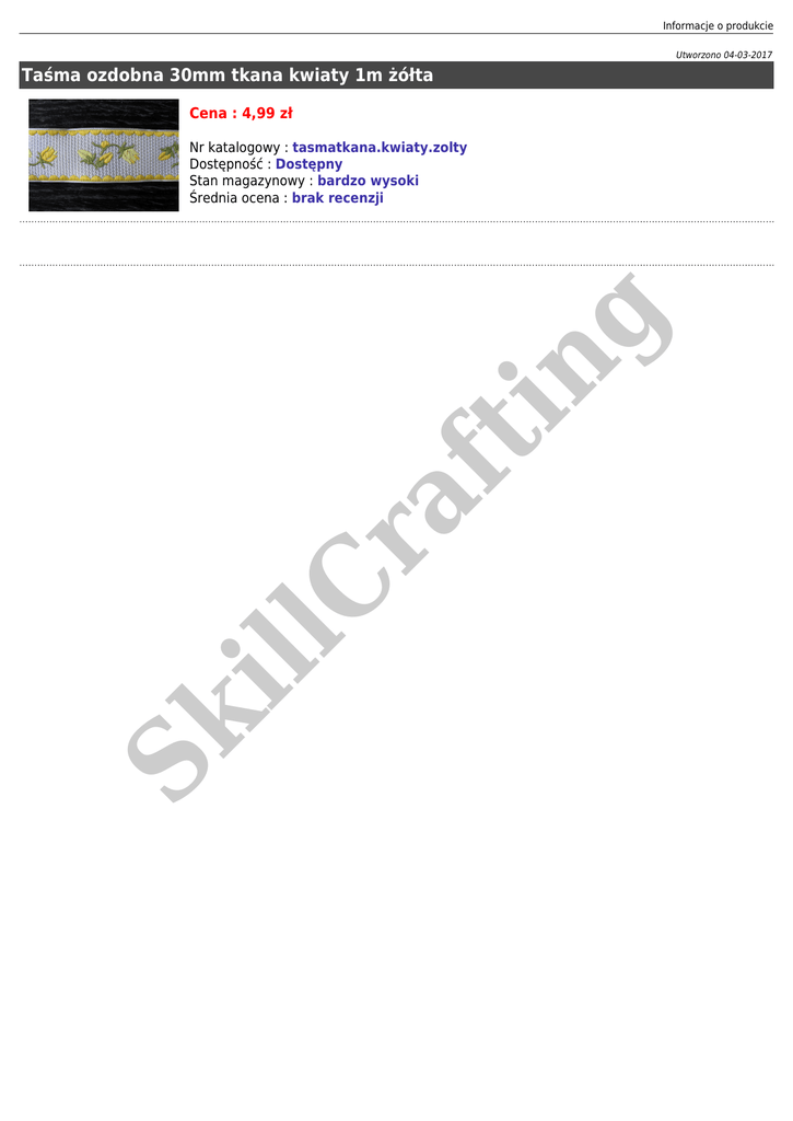 Informacje o produkcie Utworzono 04-03-2017 Taśma ozdobna 30mm tkana kwiaty 1m żółta Cena : 4,99 zł Sk ill C ra ft in g Nr katalogowy : tasmatkana.kwiaty.zolty Dostępność : Dostępny Stan magazynowy : bardzo wysoki Średnia ocena : brak recenzji