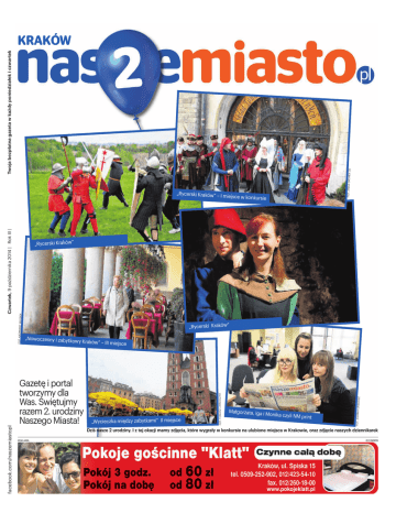 Twoja bezpłatna gazeta w każdy poniedziałek i czwartek (3) Czwartek, 9 października 2014 | Rok III | Nr 76 (199) | krakow.naszemiasto.pl w konkursie „Rycerski Kraków” „Nowoczesny i zabytko wy Kraków” Gazetę i portal tworzymy dla Was. Świętujmy razem 2. urodziny Naszego Miasta! – III miejsce „Wycieczka między zabytkami” II miejsce FOT. TOMASZ JARNUCZAK FOT. KAZIMIERZ WŁO DEK „Rycerski Kraków” Małgorzata, Iga i Monika czyli NM print FOT. JOANNA URB ANIEC facebook.com/naszemiastopl Czwartek, 9 października 2014 | Rok III | „Rycerski Kraków” – I mi ejsce FOT. ANNA GRONEK facebook.com/naszemiastopl Twoja bezpłatna gazeta w każdy poniedziałek i czwartek KRAKÓW Dziś nasze 2 urodziny. I z tej okazji mamy zdjęcia, które wygrały w konkursie na ulubione miejsca w Krakowie, oraz zdjęcie naszych dziennikarek REKLAMA i033380899 www.pokojeklatt.pl facebook.com/naszemiastopl | krakow.naszemiasto.pl 60 SEKUND Nie naprawię świata piosenkami, ale jestem w stanie sprawić przyjemność płynącą z rytmów, ale też refleksji i wzruszeń tym paru osobom, które słuchają mojej muzyki. Kraj i świat z „Gazetą Krakowską“ Renata Przemyk, piosenkarka i muzyk, dla Onetu /Częstochowa. a Jeżeli w strefie płatnego parkowania miejsca nie są oznaczone odpowiednimi znakami pionowymi oraz poziomymi, to nie musimy kupować biletu, bo służby parkingowe nie mogą nas ukarać. Tak wynika z przepisów, które weszły w życie 14 lutego. Jak pisze „Dziennik Zachodni”, dotychczas nic sobie z tego nie robiono, ale może to zmienić przypadek częstochowskiego kierowcy, który wygrał batalię z Miejskim Zarządem Dróg i Transportu, podważając mandat wystawiony za parkowanie w niedozwolonym miejscu. Płatne strefy znajdują się zazwyczaj w centrach, które często przeszły rewitalizację. Ulice zostały wybrukowane lub wyłożone kostką, a na niej FOT. JOANNA URBANIEC Nie zapłaciłeś za parkowanie? Nie martw się mandatem namalowanie poziomych linii jest praktycznie niemożliwe. BLD /Polska. Koniec z pobłażliwością wobec pieszych aTo już koniec okresu ochronnego dla pieszych, którzy nie noszą odblasków w terenie niezabudowanym. Pra- Rowerzysta to pospolity szkodnik! Nic nie daje a wszystko zabiera. Wytycz mu ścieżkę rowerową a i tak jedzie ulicą. I tak wnerwiająca sprawa jak rower jadący po chodniku dla mnie to to samo co samochód zaparkowany na chodniku – komentarz do tekstu „Piesi mają dość rowerzystów” wo działa od miesiąca, do tej pory policja tylko pouczała, ale teraz grozi już wysokimi mandatami. Znowelizowane prawo o ruchu drogowym obowiązuje od miesiąca i nakazuje pieszym nosić kamizelki lub gadżety odblaskowe. W ubiegłym miesiącu policjanci traktowali ulgowo osoby popełniające wykroczenie, od teraz jak pisze „Dziennik Bałtycki”, za ich brak otrzymamy mandat do 500 zł. BLD /Polska. Chipsy w odwrocie. Najwyższy czas na bakalie aModanaodchudzanieizdrowe odżywianiezmieniapolskirynek przekąsek-informuje„Rzeczpospolita”.Choć,jakprognozująeksperci,nasłoneisłodkieprzekąski wprzyszłymrokuwydamyponad 2,5mldzł(oniecały1proc.więcej niżrokwcześniej),towtejchwiliaż ponadpołowakupowanychbakaliijestwnaszymkrajutraktowana jakoprzekąska. BLD Od Florydy do Bermudów w plastikowej bańce /WielkaBrytania. Naukowcy wynaleźli lek na alkoholizm? a Narodowy Instytut Zdrowia w Wielkiej Brytanii opracował recepturę leku, który ma pomóc umiarkowanym alkoholikom w zwalczeniu swojego nałogu. Specyfik oparty jest na nalmefenie, związku chemicznym opartym na opiatach. W tej chwili Brytyjczycy chcą przetestować lek na 600 tys. osób. BLD /Szwecja. Policzyli wszystkie jeziora na naszej planecie a Pismo „Geophysical Research Letters” opublikowało najnowsze badania naukow- Pisze nam Gazeta Krakowska aNa Małym Rynku trwa kiermasz kulturalno-handlowy, na którym w dalszym ciągu zbierane są zabawki dla przedszkola w Raciechowicach, które ucierpiało w sierpniowej powodzi. Każdyktoprzyniesiezabawkidostaje w prezencie torbę jabłek, którefirma„Artim”zakupiłausadowników z Raciechowic. Nadchodząca sobota i niedziela też pełna będzie folklorystycznych występów na estradzie. Jesienne obrzedy i zwyczaje zaprezentuja artyści z Tatru Regionalnego. Akcentem kulminacyjnymbędzie przekazanie za- bawek placówce w Raciechowicach. Świadkami wydarzenia będą prezydent Krakowa Jacek Majchrowski i wójt gminy Raciechowice Marek Gabzdyl. Do akcji zbierania zabawek włączyły sie również krakowskie szkoły i harcerze. Poprzedniweekendpoświęconybyłpromocjiobwarzanka.Wielkimzainteresowaniemcieszyłysie opowieścizwiązanezhistoriatego najbardziej sybmolicznego krakowskiegowypieku.Dzieciimłodzież pod okiem profesjonalnych piekarzyuczyłasięformowaćiwypiekaćobwarzanki. Regionalny kiermasz zakończy się wczesnym wieczorem w niedzielę. a BLD /USA. a Ashley i Tyson Gardner z Utah w Stanach Zjednoczonych zostaną rodzicami niezwykłych czworaczków. Będą to dwie pary bliźniaków, które zdarzają się raz na 70 mln narodzin. Młodzi rodzice już rozpoczęli zbiórkę pieluch. BLD BLD PREZYDENT KRAKOWA JACEK MAJCHROWSKI Moim szlakiem po moim mieście Dzieci i starsi z radością uczyli się robienia obwarzanków a Około 1,6 tys. kilometrów chciał w nadmuchiwanej plastikowej bańce „przebiec” po oceanie irański uchodźca Reza Baluchi. Trasa mężczyzny miała przebiegać od Florydy aż do Bermudów. Swoją trasę Baluchi zakończył już jednak po ponad 120 km, kiedy to musiała interweniować Amerykańska Straż Wybrzeża. ców z uniwersytetu Umea w Szwecji. Badacze policzyli, ile jezior znajduje się na Ziemi. Jeszcze 8 lat temu sądzono, iż ich liczba przekracza 300 mln, jednak po dokładnej analizie zdjęć satelitarnych okazało się, że jest to 117 mln. Jak tłumaczą przedstawiciele uczelni, większość z nich znajduje się z dala od ludzkich siedzib, na dalekiej północy. Łąc