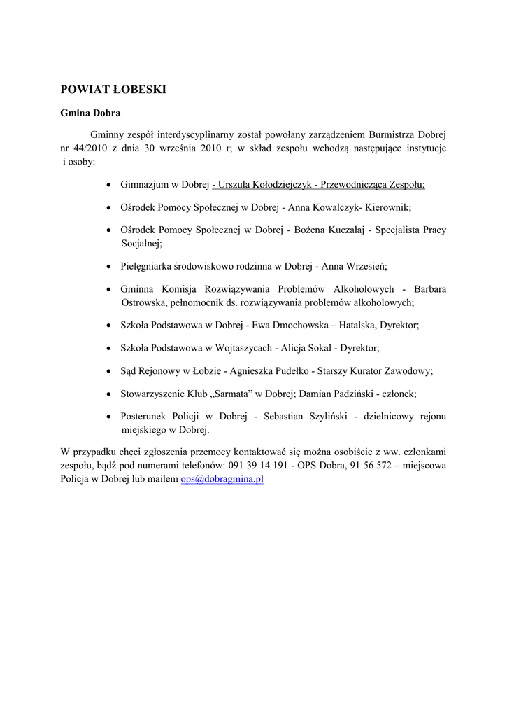 POWIAT ŁOBESKI Gmina Dobra Gminny zespół interdyscyplinarny został powołany zarządzeniem Burmistrza Dobrej nr 44/2010 z dnia 30 września 2010 r; w skład zespołu wchodzą następujące instytucje i osoby: Gimnazjum w Dobrej - Urszula Kołodziejczyk - Przewodnicząca Zespołu; Ośrodek Pomocy Społecznej w Dobrej - Anna Kowalczyk- Kierownik; Ośrodek Pomocy Społecznej w Dobrej - Bożena Kuczałaj - Specjalista Pracy Socjalnej; Pielęgniarka środowiskowo rodzinna w Dobrej - Anna Wrzesień; Gminna Komisja Rozwiązywania Problemów Alkoholowych - Barbara Ostrowska, pełnomocnik ds. rozwiązywania problemów alkoholowych; Szkoła Podstawowa w Dobrej - Ewa Dmochowska – Hatalska, Dyrektor; Szkoła Podstawowa w Wojtaszycach - Alicja Sokal - Dyrektor; Sąd Rejonowy w Łobzie - Agnieszka Pudełko - Starszy Kurator Zawodowy; Stowarzyszenie Klub „Sarmata” w Dobrej; Damian Padziński - członek; Posterunek Policji w Dobrej - Sebastian Szyliński - dzielnicowy rejonu miejskiego w Dobrej. W przypadku chęci zgłoszenia przemocy kontaktować się można osobiście z ww. członkami zespołu, bądź pod numerami telefonów: 091 39 14 191 - OPS Dobra, 91 56 572 – miejscowa Policja w Dobrej lub mailem [email protected] Gmina Resko Zespół Interdyscyplinarny został powołany Zarządzeniem Burmistrza Reska z dnia 27 stycznia 2011 r.; pierwsze posiedzenie Zespołu odbyło się dnia 22 lutego 2011 r. 1. Skład Zespołu Interdyscyplinarnego art. 9a ust. 3,4,5 ustawy o przeciwdziałaniu przemocy (instytucja i zajmowane stanowisko, liczba osób) Jednostek organizacyjnych pomocy społecznej – Agnieszka Zielińska – Opar – OPS w Resku - Przewodniczący Zespołu Interdyscyplinarnego, tel. 913951396 – OPS Resko Robert Bogdański – Straż Miejska w Resku – Wiceprzewodniczący Zespołu Interdyscyplinarnego gminnej komisji rozwiązywania problemów alkoholowych – Jolanta Siełacz policji – Sebastian Gradus – PP w Resku oświaty – Dominika Walentynowicz - SP w Resku – Sekretarz Zespołu Interdyscyplinarnego ochrony zdrowia – Edyta Gromek – pielęgniarka środowiskowa, Marzanna Strojna – pielęgniarka środowiskowa organizacji pozarządowych – Iwona Lewandowska – Stowarzyszenie na Rzecz Pomocy Rodzinie „Arka”, Bożena Wielgus – Stowarzyszenie „Współistnienie” kuratela sądowa – Małgorzata Puzyrewska – SR w Łobzie, Tomasz Soroczyński SR w Łobzie innych podmiotów – Lucyna Kreczko – Wilk – Prokuratura Rejonowa w Łobzie. Gmina Radowo Małe Gminny Zespół Interdyscyplinarny w Radowie Małym został powołany Zarządzeniem Wójta Gminy Radowo Małe Nr 29/2011 z dnia 21 lutego 2011 r. oraz Zarządzeniem Wójta Gminy Radowo Małe Nr 45/2011 z dnia 23.05.2011 r. (zmieniające); 1. W skład Zespołu wchodzą przedstawiciele następujących instytucji: Ośrodka Pomocy Społecznej w Radowie Małym – Jadwiga Kotłów - starszy pracownik socjalny. GKRPA – Regina Wypijewska - członek Komisji. Placówek Oświatowych: Krystyna Wojciechowska – nauczyciel Zespółu Szkół Publicznych w Radowie Małym; Ryszard Jamroży – dyrektor Szkoły Podstawowej w Siedlicach; Przewodniczący Zespołu Interdyscyplinarnego Komendy Powiatowej Policji – Rafał Grzegrzółka Prokuratury – Małgorzata Post – Dzięcioł. Urzędu Gminy w Radowie Małym – Bożena Król - pracownik urzędu. Kurator zawodowy dla dorosłych – Małgorzata Praczyk. Ośrodka Zdrowia w Radowie Małym – Elżbieta Lipska - pielęgniarka rodzinna. Stowarzyszenie „Współistnienie” w Resku – Anita Grabska - członek stowarzyszenia, – pracownik PCPR w Łobzie Siedzibą zespołu jest Ośrodek Pomocy Społecznej w Radowie Małym, Kontakt – OPS Radowo Małe 21, 72 – 314 Radowo Małe, tel. 91 39 72 102, e-mail: [email protected] oraz przewodniczący Zespołu i członkowie Gmina Węgorzyno Gminny Zespół Interdyscyplinarny został powołany Zarządzeniem Burmistrza Węgorzyna Nr 51/2011. Skład zespołu: Ośrodek Pomocy Społecznej w Węgorzynie – Monika Dobrzaniecka – z-ca kierownika, Przewodnicząca Zespołu Interdyscyplinarnego Ośrodek Pomocy Społecznej w Węgorzynie – Lidia Sobańska-Protasiuk – starszy pracownik socjalny Ośrodek Pomocy Społecznej w Węgorzynie – Dorota Jackiewicz – pracownik socjalny Ośrodek Pomocy Społecznej w Węgorzynie – Anna Żurawik-Tobiasz – pracownik socjalny Szkoła Podstawowa Węgorzyno – Bożena Brodzińska – pedagog szkolny Gimnazjum Węgorzyno - Dorota Stankowska – Adamów – pedagog szkolny Posterunek Policji w Węgorzynie – Mariusz Różycki – dzielnicowy posterunku policji w Węgorzynie Sąd Rejonowy w Łobzie – Małgorzata Capłap – kurator zawodowy Powiatowe Centrum Pomocy Rodzinie w Łobzie, Stowarzyszenie „Współistnienie” w Resku – Anita Grabska – inspektor w dziele interwencji kryzysowej, członek zarządu Gminna Komisja Rozwiązywania Problemów Alkoholowych w Węgorzynie – Jadwiga Kamińska – przewodnicząca komisji, radna Siedziba ZI mieści się w Ośrodku Pomocy Społecznej w Węgorzynie, który zapewnia obsługę administracyjno – techniczną. W przypadku chęci zgłoszenia stosowania przemocy kontaktować się można z Przewodniczącym ZI – Moniką Dorzaniecką, tel. 91 5777 72 79 lub pracownikami socjalnymi tel. 91 3971 409; adres OPS ul. Sosnowskiego 5, 73 – 155 Węgorzyno, e –mail: [email protected] Gmina Łobez Zespół Interdyscyplinarny w Łobzie został powołany przez Radę Miejską w Łobzie: 1. Rada Miejska w Łobzie Uchwałą nr LVIII/382/10 z dnia 19 października 2010 r. ustaliła warunki funkcjonowania oraz tryb i sposób powoływania i odwoływania członków Zespołu Interdyscyplinarnego w Łobzie; 2. Burmistrz Łobza Zarządzeniem nr 779/10 z dnia 27 października 2010 r. powołał członków Zespołu Interdyscyplinarnego oraz Zarządzeniem nr 57/11 Burmistrza Łobza z dnia 07 kwietnia 2011 r. nastąpiły zmiany w składzie Zespołu. 3. Przewodniczącym zespo