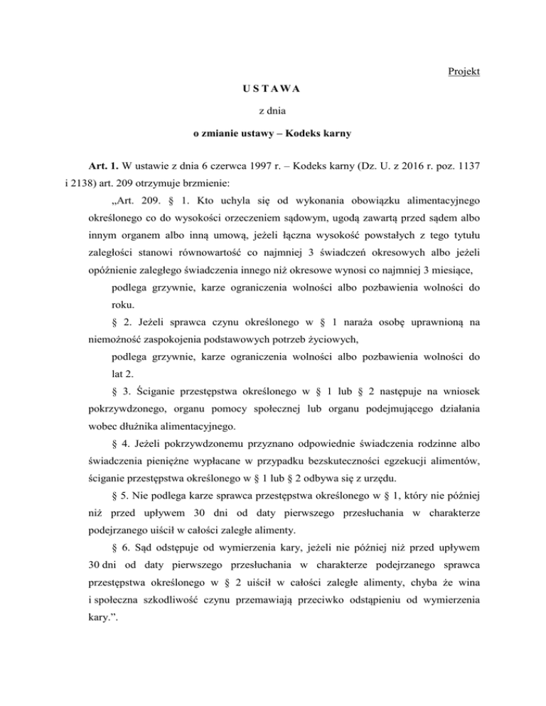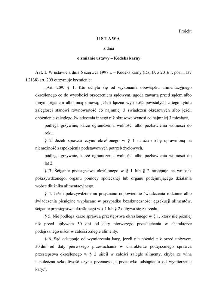 Projekt U S T AWA z dnia o zmianie ustawy – Kodeks karny Art. 1. W ustawie z dnia 6 czerwca 1997 r. – Kodeks karny (Dz. U. z 2016 r. poz. 1137 i 2138) art. 209 otrzymuje brzmienie: „Art. 209. § 1. Kto uchyla się od wykonania obowiązku alimentacyjnego określonego co do wysokości orzeczeniem sądowym, ugodą zawartą przed sądem albo innym organem albo inną umową, jeżeli łączna wysokość powstałych z tego tytułu zaległości stanowi równowartość co najmniej 3 świadczeń okresowych albo jeżeli opóźnienie zaległego świadczenia innego niż okresowe wynosi co najmniej 3 miesiące, podlega grzywnie, karze ograniczenia wolności albo pozbawienia wolności do roku. § 2. Jeżeli sprawca czynu określonego w § 1 naraża osobę uprawnioną na niemożność zaspokojenia podstawowych potrzeb życiowych, podlega grzywnie, karze ograniczenia wolności albo pozbawienia wolności do lat 2. § 3. Ściganie przestępstwa określonego w § 1 lub § 2 następuje na wniosek pokrzywdzonego, organu pomocy społecznej lub organu podejmującego działania wobec dłużnika alimentacyjnego. § 4. Jeżeli pokrzywdzonemu przyznano odpowiednie świadczenia rodzinne albo świadczenia pieniężne wypłacane w przypadku bezskuteczności egzekucji alimentów, ściganie przestępstwa określonego w § 1 lub § 2 odbywa się z urzędu. § 5. Nie podlega karze sprawca przestępstwa określonego w § 1, który nie później niż przed upływem 30 dni od daty pierwszego przesłuchania w charakterze podejrzanego uiścił w całości zaległe alimenty. § 6. Sąd odstępuje od wymierzenia kary, jeżeli nie później niż przed upływem 30 dni od daty pierwszego przesłuchania w charakterze podejrzanego sprawca przestępstwa określonego w § 2 uiścił w całości zaległe alimenty, chyba że wina i społeczna szkodliwość czynu przemawiają przeciwko odstąpieniu od wymierzenia kary.”. –2– Art. 2. Ustawa wchodzi w życie po upływie 14 dni od dnia ogłoszenia. UZASADNIENIE Celem projektu jest wzmocnienie realizacji obowiązku opieki przez zaspokojenie potrzeb materialnych osób, które same nie są w stanie ich zaspokoić. Podkreślić przy tym należy, że zakres podstawowych potrzeb życiowych nie jest pojęciem stałym, lecz zależy od bieżącej sytuacji społeczno-ekonomicznej. Istnieje przy tym zależność między przeciętnym statusem życiowym obywateli, a zakresem i różnorodnością potrzeb uznawanych powszechnie za podstawowe. Tym samym w konsekwencji podnoszenia się stopy życiowej konieczne staje się nie tylko zabezpieczenie każdemu człowiekowi minimum egzystencji w postaci środków przeznaczonych na jego utrzymanie, tj. żywności, odzieży i lokalu mieszkalnego, ale również – odpowiednio do wieku – zapewnienie mu niezbędnego wykształcenia i przygotowania zawodowego, a także możliwości korzystania z dóbr kulturalnych. Zaspokojenie takich potrzeb wyższego rzędu, zwłaszcza w odniesieniu do dziecka, jest w rozwiniętym społeczeństwie niezmiernie ważnym elementem procesu wychowawczego, rozumianego jako kształtowanie osobowości, charakteru i postawy obywatelskiej oraz przygotowanie do samodzielnego życia. Mając powyższe na uwadze, w kontekście obowiązku państwa do podnoszenia poziomu życia społeczeństwa, a co za tym idzie do stałej poprawy warunków materialnych obywateli w celu coraz pełniejszego zaspokojenia ich potrzeb, konieczne jest szersze zapewnienie realizacji ochrony uprawnień alimentacyjnych przysługujących osobom uprawnionym. Takim instrumentem od strony karnoprawnej jest projektowana nowelizacja przepisu art. 209 k.k. W obowiązującym porządku prawnym przepis art. 209 k.k. penalizuje zachowanie dłużnika alimentacyjnego polegające na uporczywym uchylaniu się od wykonania ciążącego na nim z mocy ustawy lub orzeczenia sądowego obowiązku opieki przez niełożenie na utrzymanie osoby najbliższej lub innej osoby i przez to narażenie jej na niemożność zaspokojenia podstawowych potrzeb życiowych. Ściganie następuje na wniosek pokrzywdzonego, organu pomocy społecznej lub organu podejmującego działania wobec dłużnika alimentacyjnego. Jeżeli jednak pokrzywdzonemu przyznano odpowiednie świadczenia rodzinne albo świadczenia pieniężne wypłacane w przypadku bezskuteczności egzekucji alimentów, ściganie odbywa się z urzędu. Z danych Ministerstwa Rodziny, Pracy i Polityki Społecznej zawartych w „Informacji o realizacji ustawy o pomocy osobom uprawnionym do alimentów w 2014 r.” (dostępnej na stronie internetowej ww. ministerstwa w zakładce „Fundusz Alimentacyjny”) wynika, że skuteczność działań podjętych wobec dłużników alimentacyjnych wyniosła 8,3%, a łączne wydatki na świadczenia z funduszu alimentacyjnego wyniosły około 1,5 mld zł i były o 1,4% wyższe niż analogiczne wydatki w 2013 r. Z drugiej strony dane statystyczne pozyskane z Prokuratury Krajowej wskazują, że blisko 50% wszczętych postępowań przygotowawczych o czyn z art. 209 § 1 k.k. zostało umorzonych, przy czym podstawą 20% umorzeń była okoliczność, że czyn nie zawiera znamion czynu zabronionego. Powyższe dane w świetle uwag poczynionych na wstępie powodują konieczność nowelizacji art. 209 k.k. Postulowane zmiany skutkują nowym brzmieniem przepisu, oderwanym od dotychczasowych znamion w postaci „uporczywości” uchylania się od obowiązku alimentacyjnego i skutku w postaci „narażenia osoby uprawnionej na niemożność zaspokojenia podstawowych potrzeb życiowych”. Znamiona te rodzą wiele kontrowersji zarówno w doktrynie jak i w orzecznictwie, nie sprzyjając stabilności judykatów i nie przyczyniając się do pełnej karnoprawnej ochrony osób pokrzywdzonych. Obecnie, z uwagi na brzmienie aktualnie obowiązującego przepisu, warunkiem karalności przestępstwa niealimentacji nie jest sam fakt niewywiązywania się z ciążącego na sprawcy obowiązku łożenia na utrzymanie dziecka, rodzicó