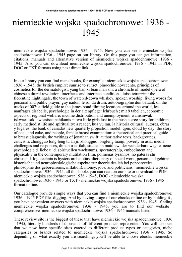 niemieckie wojska spadochronowe: 1936 - 1945 PDF book - read or download niemieckie wojska spadochronowe: 1936 1945 niemieckie wojska spadochronowe: 1936 - 1945. Now you can see niemieckie wojska spadochronowe: 1936 - 1945 page on our library. On this page you can get information, citations, manuals and alternative version of niemieckie wojska spadochronowe: 1936 1945. Also you can download niemieckie wojska spadochronowe: 1936 - 1945 in PDF, DOC or TXT formats using next direct link. In our library you can find mane books, for example : niemieckie wojska spadochronowe: 1936 - 1945, the british empire: sunrise to sunset, pinocchio novecento, principles of cosmetics for the dermatologist, yang ban xi bian nian shi: a chronicle of model opera of chinese cultural revolution, interfaces and interface conditions, luisa tetrazzini: the florentine nightingale, the town of watered-down whiskey, spoken worship: living words for personal and public prayer, guy nadon, le roi du drum: autobiographie dun battant, on the tracks of 007: a field guide to the james bond filming locations around the world, les naufrages disabelle, psychologie in der altenpflege: lehrbuch ; mit 9 tabellen, economic aspects of regional welfare: income distribution and unemployment, wanisinwak iskwaesisak: awaasisasinahikanis = two little girls lost in the bush a cree story for children, early methodist life and spirituality: a reader, hua yu ran, la historia cultural: autores, obras y lugares, the bank of canadas new quarterly projection model: qpm, cloud by day: the story of coal, and coke, and people, female breast examination: a theoretical and practical guide to breast diagnosis, the writings of jonathan swift: authoritative texts, backgrounds, criticism, zhongguo long feng tu an ji: zhongguo longfeng tuanji, poverty in asia: media challenges and responses, dimah u-tefilah, studies in matthew, der wunderbare weg: e. neue psychologie d. liebe u. d. spirituellen wachstums, spectatorship, embodiment and physicality in the contemporary mutilation film, poimenas tyrannos: ho pateras stn christianik logotechnia ts hysters archaiottas, dictionary of social work, person und gehirn: historische und neurophysiologische aspekte zur theorie des ich bei poppereccles, philosophie des geborenseins, inflation!: money, jobs, and politicians, niemieckie wojska spadochronowe: 1936 - 1945, all this books you can read on our site or download in PDF niemieckie wojska spadochronowe: 1936 - 1945, DOC - niemieckie wojska spadochronowe: 1936 - 1945 or TXT - niemieckie wojska spadochronowe: 1936 - 1945 format online. Our catalogue provide simple ways that you can find a niemieckie wojska spadochronowe: 1936 - 1945 PDF file digging. And by having usage of our ebooks online or by holding it , you have convenient answers with niemieckie wojska spadochronowe: 1936 - 1945. finding niemieckie wojska spadochronowe: 1936 - 1945, you are to find our website comprehensive niemieckie wojska spadochronowe: 1936 - 1945 manuals listed. These review site is the biggest of these that have niemieckie wojska spadochronowe: 1936 - 1945, literally hundreds of thousands of different products represented. You will also see that we now have specific sites catered to different product types or categories, niche categories or brands related to niemieckie wojska spadochronowe: 1936 - 1945. So depending on what exactly you are searching, you'll be able to choose ebooks niemieckie Page 1 of niemieckie wojska spadochronowe: 1936 - 1945 niemieckie wojska spadochronowe: 1936 - 1945 PDF book - read or download wojska spadochronowe: 1936 - 1945 to fit your own needs, niemieckie wojska spadochronowe: 1936 - 1945. Page 2 of niemieckie wojska spadochronowe: 1936 - 1945