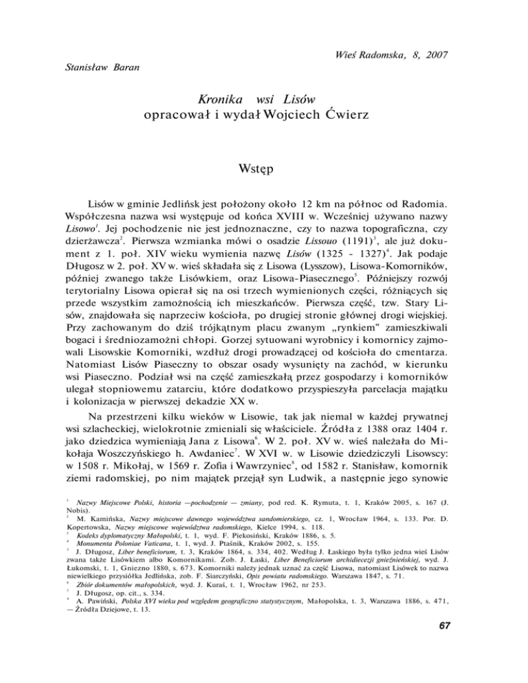 Wieś Radomska, 8, 2007 Stanisław Baran Kronika wsi Lisów opracował i wydał Wojciech Ćwierz Wstęp Lisów w gminie Jedlińsk jest położony około 12 km na północ od Radomia. Współczesna nazwa wsi występuje od końca XVIII w. Wcześniej używano nazwy Lisowo1. Jej pochodzenie nie jest jednoznaczne, czy to nazwa topograficzna, czy dzierżawcza2. Pierwsza wzmianka mówi o osadzie Lissouo (1191) 3 , ale już doku ment z 1. poł. XIV wieku wymienia nazwę Lisów (1325 - 1327) 4 . Jak podaje Długosz w 2. poł. XV w. wieś składała się z Lisowa (Lysszow), Lisowa-Komorników, później zwanego także Lisówkiem, oraz Lisowa-Piasecznego5. Późniejszy rozwój terytorialny Lisowa opierał się na osi trzech wymienionych części, różniących się przede wszystkim zamożnością ich mieszkańców. Pierwsza część, tzw. Stary Li sów, znajdowała się naprzeciw kościoła, po drugiej stronie głównej drogi wiejskiej. Przy zachowanym do dziś trójkątnym placu zwanym „rynkiem" zamieszkiwali bogaci i średniozamożni chłopi. Gorzej sytuowani wyrobnicy i komornicy zajmo wali Lisowskie Komorniki, wzdłuż drogi prowadzącej od kościoła do cmentarza. Natomiast Lisów Piaseczny to obszar osady wysunięty na zachód, w kierunku wsi Piaseczno. Podział wsi na część zamieszkałą przez gospodarzy i komorników ulegał stopniowemu zatarciu, które dodatkowo przyspieszyła parcelacja majątku i kolonizacja w pierwszej dekadzie XX w. Na przestrzeni kilku wieków w Lisowie, tak jak niemal w każdej prywatnej wsi szlacheckiej, wielokrotnie zmieniali się właściciele. Źródła z 1388 oraz 1404 r. jako dziedzica wymieniają Jana z Lisowa6. W 2. poł. XV w. wieś należała do Mi kołaja Woszczyńskiego h. Awdaniec7. W XVI w. w Lisowie dziedziczyli Lisowscy: w 1508 r. Mikołaj, w 1569 r. Zofia i Wawrzyniec8, od 1582 r. Stanisław, komornik ziemi radomskiej, po nim majątek przejął syn Ludwik, a następnie jego synowie 1 Nazwy Miejscowe Polski, historia —pochodzenie — zmiany, pod red. K. Rymuta, t. 1, Kraków 2005, s. 167 (J. Nobis). 2 M. Kamińska, Nazwy miejscowe dawnego województwa sandomierskiego, cz. 1, Wrocław 1964, s. 133. Por. D. Kopertowska, Nazwy miejscowe województwa radomskiego, Kielce 1994, s. 118. 3 Kodeks dyplomatyczny Małopolski, t. 1, wyd. F. Piekosiński, Kraków 1886, s. 5. 4 Monumenta Poloniae Vaticana, t. 1, wyd. J. Ptaśnik, Kraków 2002, s. 155. 3 J. Długosz, Liber beneficiorum, t. 3, Kraków 1864, s. 334, 402. Według J. Łaskiego była tylko jedna wieś Lisów zwana także Lisówkiem albo Komornikami. Zob. J. Łaski, Liber Beneficiorum archidiecezji gnieźnieńskiej, wyd. J. Łukomski, t. 1, Gniezno 1880, s. 673. Komorniki należy jednak uznać za część Lisowa, natomiast Lisówek to nazwa niewielkiego przysiółka Jedlińska, zob. F. Siarczyński, Opis powiatu radomskiego. Warszawa 1847, s. 71. 6 Zbiór dokumentów małopolskich, wyd. J. Kuraś, t. 1, Wrocław 1962, nr 253. 7 J. Długosz, op. cit., s. 334. 8 A. Pawiński, Polska XVI wieku pod względem geograficzno statystycznym, Małopolska, t. 3, Warszawa 1886, s. 471, — Źródła Dziejowe, t. 13. 67 9 Stanisław i Piotr . Od 2. poł. XVII w. Lisów należał do rodziny Prażmowskich. 10 W 1670 r. dziedzicem był Samuel Prażmowski, wojewoda płocki , który dostał tę wieś' od swojego brata Mikołaja" - arcybiskupa gnieźnieńskiego. Według spisu po 12 datków z 1789 r. liczący 12 domów Lisów, należał do Eligiusza Prażmowskiego . Według innego rejestru w 1789 r. było w Lisowie 19 domów, w tym 9 sepnych, 13 czyli gruntowych . Kolejnym właścicielem był Adam Przerembski, który sprzedał 14 lisowski majątek w 1800 r. Filipowi Kołdowskiemu , dziedzicowi wsi Piaseczno i Sopot oraz zakupionych później Błotnicy, Czyżówki i Dębowicy. Według danych z 1808 r. w Lisowie było 18 domów (21 izb), zamieszkiwanych przez 93 osoby15. W 1825 r. Lisów i Piaseczno przypadły w spadku jego córce Józefie Sołtykowej. W 1836 r. szacowany na 150 tys. złp. majątek ponownie został odziedziczony w linii żeńskiej, stając się własnością Laury Sołtyk, od 1843 r. żony Karola Gordo na 1 6 . Gdy wieś należała do rodu Gordonów nastąpiło uwłaszczenie chłopów, którzy stali się właścicielami 395 mórg ziemi. Po uwłaszczeniu w Lisowie do włościan należało 16 drewnianych domów. Gordonowie oprócz dworu posiadali w Lisowie 5 budynków na folwarku, z czego 1 drewniany 17 . W 1879 r. ponad tysiąc mórg ziemi, pozostałych w rękach Gordonów, kupił Stefan Łączyński. Po nim od 1885 r. majątkiem władał Maksymilian Małyński. Ostatnim dziedzicem Lisowa był Gu staw Porawski, który nabył go w 1895 r. za sumę 57.500 rs. 18 Dodatkowych infor macji o miejscowości dostarczają urzędowe spisy rosyjskie (1880: 1088 mórg dwor skich — własność Karola Gordona, 397 mórg chłopskich, 19 domów drewnianych i 1 murowany, 107 mężczyzn i 102 kobiety; 1895: 557 dziesięcin ziemi dwor skiej — własność Stefana Łączyńskiego i 202 chłopskich, 30 domów drewnianych i 1 murowany. 120 mężczyzn i 124 kobiety, młyn wodny na rzece Radomce; 1907: 605 dziesięcin ziemi chłopskiej, 30 domów drewnianych i 2 murowane, 156 męż czyzn i 150 kobiet) 1 9 i spis polski z 1921 r. (Lisów Kolonia: domów 26, ludności 158, w tym 77 mężczyzn i 81 kobiet, wyznania rzymskokatolickiego i narodowości polskiej; Lisów Stary wieś: domów 23, ludności 139, w tym 63 mężczyzn i 76 kobiet, wyznania rzymskokatolickiego i narodowości polskiej)20 Dzieje parafii w Lisowie sięgają początku XV w. W 1414 r. Lisowscy ufundowali ' A. Boniecki, Herbarz polski, t. 14, Warszawa 1913 (przedr. fotooffset., Warszawa 1985 - 19&7), s. 377. 10 Pamiętnik Ulryka Werduma, w: Liske K., Cudzoziemcy w Polsce, Lwów 1876, s. 75. " Mikołaj Prażmowski herbu Belina (1617 - 1673), interreks 1668 - 1669, arcybiskup gnieźnieński i prymas Polski od 1666, biskup łucki od 1659, biskup warmiński od 1664, w