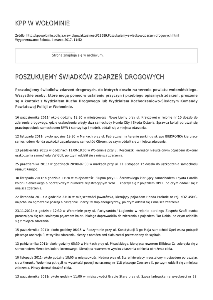 KPP W WOŁOMINIE Źródło: http://kppwolomin.policja.waw.pl/pw/aktualnosci/28689,Poszukujemy-swiadkow-zdarzen-drogowych.html Wygenerowano: Sobota, 4 marca 2017, 11:52 Strona znajduje się w archiwum. POSZUKUJEMY ŚWIADKÓW ZDARZEŃ DROGOWYCH Poszukujemy świadków zdarzeń drogowych, do których doszło na terenie powiatu wołomińskiego. Wszystkie osoby, które mogą pomóc w ustaleniu przyczyn i przebiegu opisanych zdarzeń, proszone są o kontakt z Wydziałem Ruchu Drogowego lub Wydziałem Dochodzeniowo-Śledczym Komendy Powiatowej Policji w Wołominie. 16 października 2011r około godziny 19:30 w miejscowości Nowe Lipiny przy ul. Krzyżowej w rejonie nr 10 doszło do zdarzenia drogowego, gdzie uszkodzeniu uległy dwa samochody Honda City i Skoda Octavia. Sprawca kolizji poruszał się prawdopodobnie samochodem BMW ( starszy typ i model), oddalił się z miejsca zdarzenia. 12 listopada 2011r około godziny 19:30 w Markach przy ul. Fabrycznej na terenie parkingu sklepu BIEDRONKA kierujący samochodem Honda uszkodził zaparkowany samochód Citroen, po czym oddalił się z miejsca zdarzenia. 13 października 2011r w godzinach 11:00-18:00 w Wołominie przy ul. Kościuszki kierujący nieustalonym pojazdem dokonał uszkodzenia samochodu VW Golf, po czym oddalił się z miejsca zdarzenia. 25 października 2011r w godzinach 20:00-07:30 w markach przy ul. 11 Listopada 12 doszło do uszkodzenia samochodu renault Kangoo. 30 listopada 2011r o godzinie 21:20 w miejscowości Słupno przy ul. Żeromskiego kierujący samochodem Toyota Corolla koloru niebieskiego o początkowym numerze rejestracyjnym WWL… zderzył się z pojazdem OPEL, po czym oddalił się z miejsca zdarzenia. 22 listopada 2011r o godzinie 23:10 w miejscowości Jaworówka, kierujący pojazdem Honda Prelude nr rej. NDZ 45HG, najechał na ogrodzenie posesji a następnie uderzył w słup energetyczny, po czym oddalił się z miejsca zdarzenia. 23.11.2011r o godzinie 12:30 w Wołominie przy ul. Partyzantów/ Legionów w rejonie parkingu Zespołu Szkół osoba poruszająca się nieustalonym pojazdem koloru białego doprowadziła do zderzenia z pojazdem Fiat Doblo, po czym oddaliła się z miejsca zdarzenia. 15 października 2011r około godziny 06;15 w Radzyminie przy ul. Konstytucji 3-go Maja samochód Opel Astra potrącił pieszego Andrzeja P. w wyniku zdarzenia, pieszy z obrażeniami ciała został przewieziony do szpitala. 13 października 2011r około godziny 05:30 w Markach przy ul. Piłsudskiego, kierująca rowerem Elżbieta Cz. zderzyła się z samochodem Mercedes koloru kremowego. Kierująca rowerem w wyniku zdarzenia odniosła obrażenia ciała. 10 listopada 2011r około godziny 18:00 w miejscowości Nadma przy ul. Starej kierujący nieustalonym pojazdem poruszając sie z kierunku Wołomina potrącił na wysokości posesji oznaczonej nr 118 pieszego Czesława K. po czym oddalił się z miejsca zdarzenia. Pieszy doznał obrażeń ciała. 13 października 2011r około godziny 11:00 w miejscowości Grabie Stare przy ul. Szosa Jadowska na wysokości nr 28 kierujący samochodem Citroen Xsara podczas wyprzedzania kolumny pojazdów, zjechał na pobocze, następnie uderzył w drzewo i ogrodzenie posesji. Kierowca z obrażeniami ciała został przewieziony do szpitala. Wszystkie osoby, które mogą pomóc w ustaleniu przyczyn i przebiegu opisanych zdarzeń, proszone są o kontakt z Wydziałem Ruchu Drogowego KPP Wołomin pod nr tel. (22) 60-47-422, lub Wydziałem Dochodzeniowo – Śledczym KPP Wołomin tel. (22) 60- 47-324, (22) 60-47-259, lub całodobowo z dyżurnym Komendy Powiatowej Policji w Wołominie tel. (22) 776 - 20 - 21. Informacje można pozostawić również anonimowo pod całodobowym numerem telefonu ( 22 ) 787 20 00. /ts/ Ocena: 0/5 (0) Tweetnij