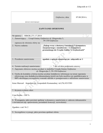Załącznik nr 1/2 Grębocice, dnia 07.08.2014 r. (pieczęć zamawiającego) ZAPYTANIE OFERTOWE Nr sprawy: RBiGK.271.17.2014 1. Zamawiający: : Urząd Gminy Grębocice ul. Głogowska 3; 59-150 Grębocice zaprasza do złożenia oferty na: 2. Nazwa zadania: „Zakup wraz z dostawą i instalacją 1 komputera stacjonarnego z monitorem i 1 komputera przenośnego do Urzędu Gminy w Grębocicach” 3. Przedmiot zamówienia: zgodnie z opisem stanowiącym załącznik nr 1 4. Termin realizacji zamówienia: 7 dni od dnia podpisania umowy 5. Zapytanie ofertowe można uzyskać w siedzibie Urzędu Gminy Grębocice ul. Głogowska 3; 59-150 Grębocice. 6. Osoba do kontaktu u której można uzyskać dodatkowe informacje na temat zapytania ofertowego oraz dodatkową dokumentację (jeżeli nie było możliwe jej opublikowanie w BIP) określającą szczegółowe warunki udziału w postępowaniu o udzielenie zamówienia: Irena Marszał –Inspektor ds. Gospodarki Komunalnej tel.(76) 8315501 7. Kryteria wyboru ofert: Cena brutto – 100 % 8. Wymagania, jakie powinni spełniać wykonawcy zamówienia w zakresie dokumentów i oświadczeń (np. uprawnienia, posiadanie koncesji, zezwolenia): Zgodnie z zał. Nr 2 9. Szczegółowe wymogi, jakie powinna spełniać oferta: 1 Załącznik nr 1/2 10. Wzór umowy lub istotne postanowienia umowy, które zostaną w jej treści zawarte (jeżeli jest wymagana forma pisemna umów na podstawie odrębnych przepisów zamawiającego): Zał. Nr 3 11. Wymagania dotyczące zabezpieczenia należytego wykonania umowy, sposobu oraz formy jego wniesienia (jeżeli jest wymagany): 12. Warunki gwarancji: 13. Sposób przygotowania oferty: ofertę należy sporządzić w języku polskim, w formie pisemnej 14. faksem e-mailem Miejsce i termin składania ofert: ofertę należy 19.08.2014 w Centrum Obsługi do godziny 1000 złożyć do dnia r. Mieszkańca (pok. nr 1) w siedzibie Zamawiającego tj. w Urzędzie Gminy w Grębocicach ul. Głogowska 3, 59-150 Grębocice Tel. 076 831 55 01; faks 076 831 50 77 e-mail: [email protected] Wójt Gminy Grębocice /-/ Roman Jabłoński (podpis Kierownika Zamawiającego) 2 Załącznik nr 1/2 Załącznik nr 1 do zapytania ofertowego nr RBiGK 271. Opis przedmiotu zamówienia do zapytania ofertowego na zadanie: „Zakup wraz z dostawą i instalacją 1 komputera stacjonarnego z monitorem i 1 komputera przenośnego do Urzędu Gminy w Grębocicach” Przedmiotem zamówienia jest zakup wraz dostawą ( instalacją i przeniesieniem danych) sprzętu komputerowego wraz z oprogramowaniem do Urzędu Gminy w Grębocicach” składającego się z: 1. Komputer przenośny DELL Latitude E5530 i3-3110M 2,4 lub równoważny innego producenta wraz z system operacyjnym, pakietem biurowym, przeniesieniem danychc1szt. Komputer z systemem operacyjnym Windows 7 Pro 64 bit oraz pakietem Microsoft Office 2013 dla Użytkowników Domowych i Małych Firm 32/64 Bit PL Rodzaj gwarancji: 24 miesiące, na miejscu u Klienta - reakcja następny dzień roboczy z możliwością wykupienia dodatkowej gwarancji. Komputer o parametrach nie gorszych niż: Typ Komputer przenośny typu notebook z ekranem 15.6" o rozdzielczości: HD (1366x768) w technologii LED przeciwodblaskowy, jasność 220 nits, kontrast 300:1, rozmiar plamki : 0,25mm. i3-3110M 2,4 lub równoważne innego producenta Procesor Pamięć operacyjna 4GB (1x4096MB) DDR3 1600 MHz możliwość rozbudowy do min 8GB RAM Dysk HDD Min. 320 GB SATA, min. 5400 obr./min. Zintegrowana w procesorze z możliwością dynamicznego przydzielenia pamięci systemowej, ze sprzętowym wsparciem dla DirectX 10.1, Shader Karta graficzna 4.1 posiadająca min. 6EU (Graphics Execution Units) oraz Dual HD HW Decode lub rozwiązanie równoważne innego producenta Min 24-bitowa Karta dźwiękowa zintegrowana z płytą główną, zgodna z Multimedia High Definition, wbudowane głośniki stereo. 6-cell, 60WHr, Li-Ion. Umożliwiająca jej szybkie naładowanie do Bateria i zasilanie poziomu 80% w czasie 1 godziny i do poziomu 100% w czasie 2 godzin. Zasilacz o mocy min. 90W Waga max 2,6 kg z baterią Szerokość: max 388 mm Waga i wymiary Wysokość: max 34 mm Głębokość: max 252 mm Obudowa notebooka metalowa-wzmocniona, wykonana ze szczotkowanego aluminium, szkielet i zawiasy notebooka wykonany z Obudowa wzmacnianego metalu, dookoła matrycy gumowe uszczelnienie chroniące klawiaturę notebooka po zamknięciu przed kurzem i wilgocią. Kąt 3 Załącznik nr 1/2 Wirtualizacja Certyfikaty i standardy BIOS Warunki gwarancji otwarcia notebooka min 180 stopni. W obudowie notebooka zintegrowany mechaniczny przesuwny zamek lub inne rozwiązanie uniemożliwiający samoczynne otwarcie się notebooka. Sprzętowe wsparcie technologi wirtualizacji procesorow, pamięci i urządzeń I/O realizowane łącznie w procesorze, chipsecie płyty główej oraz w BIOS systemu (możliwość włączenia/wyłączenia sprzętowego wsparcia wirtualizacji dla poszczególnych komponentów systemu). Certyfikat ISO9001:2000 dla producenta sprzętu Certyfikat ISO 14001 dla producenta sprzętu Deklaracja zgodności CE Potwierdzenie spełnienia kryteriów środowiskowych, w tym zgodności z dyrektywą RoHS Unii Europejskiej o eliminacji substancji niebezpiecznych w postaci oświadczenia producenta jednostki Potwierdzenie kompatybilności komputera na stronie Windows Logo Products List na daną platformę systemową EPEAT na poziomie GOLD. Wymagany wpis dotyczący oferowanej stacji dostępowej w internetowym katalogu http://www.epeat.net Certyfikat EnergyStar 5.0 – komputer musi znajdować się na liście zgodności dostępnej na stronie www.energystar.gov oraz http://www.euenergystar.org · · Możliwość wyłączenia/włączenia: zintegrowanej karty sieciowej, portów USB, portu eSATA, modemu analogowego, napędu optycznego, czytnika kard multimedialnych, mikrofonu, kamery, systemu ochrony dysku przed upadkiem, Intel TurboBoost, ASF 2.0, pracy wielordzeniowej procesora, modułów: WWAN, WLAN i Blue