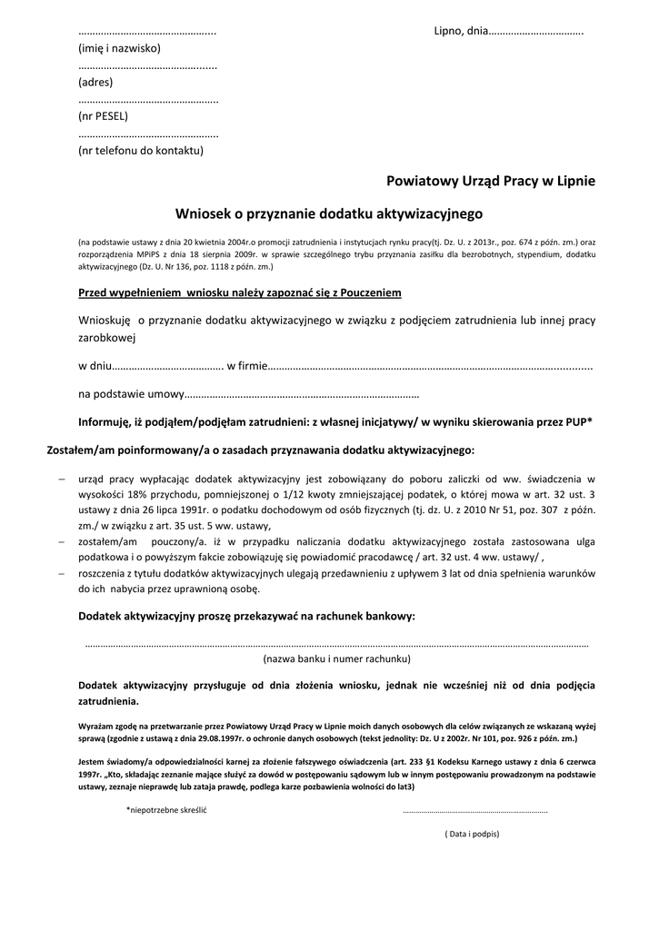 ……………………………………….... (imię i nazwisko) ……………………………………....... (adres) ………………………………………….. (nr PESEL) ………………………………………….. (nr telefonu do kontaktu) Lipno, dnia……………………………. Powiatowy Urząd Pracy w Lipnie Wniosek o przyznanie dodatku aktywizacyjnego (na podstawie ustawy z dnia 20 kwietnia 2004r.o promocji zatrudnienia i instytucjach rynku pracy(tj. Dz. U. z 2013r., poz. 674 z późn. zm.) oraz rozporządzenia MPiPS z dnia 18 sierpnia 2009r. w sprawie szczególnego trybu przyznania zasiłku dla bezrobotnych, stypendium, dodatku aktywizacyjnego (Dz. U. Nr 136, poz. 1118 z późn. zm.) Przed wypełnieniem wniosku należy zapoznad się z Pouczeniem Wnioskuję o przyznanie dodatku aktywizacyjnego w związku z podjęciem zatrudnienia lub innej pracy zarobkowej w dniu…………………………………. w firmie…………………………………………………………………………………………............. na podstawie umowy………………………………………………………………………… Informuję, iż podjąłem/podjęłam zatrudnieni: z własnej inicjatywy/ w wyniku skierowania przez PUP* Zostałem/am poinformowany/a o zasadach przyznawania dodatku aktywizacyjnego: urząd pracy wypłacając dodatek aktywizacyjny jest zobowiązany do poboru zaliczki od ww. świadczenia w wysokości 18% przychodu, pomniejszonej o 1/12 kwoty zmniejszającej podatek, o której mowa w art. 32 ust. 3 ustawy z dnia 26 lipca 1991r. o podatku dochodowym od osób fizycznych (tj. dz. U. z 2010 Nr 51, poz. 307 z późn. zm./ w związku z art. 35 ust. 5 ww. ustawy, zostałem/am pouczony/a. iż w przypadku naliczania dodatku aktywizacyjnego została zastosowana ulga podatkowa i o powyższym fakcie zobowiązuję się powiadomid pracodawcę / art. 32 ust. 4 ww. ustawy/ , roszczenia z tytułu dodatków aktywizacyjnych ulegają przedawnieniu z upływem 3 lat od dnia spełnienia warunków do ich nabycia przez uprawnioną osobę. Dodatek aktywizacyjny proszę przekazywad na rachunek bankowy: ……………………………………………………………………………………………………………………………………………………………………………… (nazwa banku i numer rachunku) Dodatek aktywizacyjny przysługuje od dnia złożenia wniosku, jednak nie wcześniej niż od dnia podjęcia zatrudnienia. Wyrażam zgodę na przetwarzanie przez Powiatowy Urząd Pracy w Lipnie moich danych osobowych dla celów związanych ze wskazaną wyżej sprawą (zgodnie z ustawą z dnia 29.08.1997r. o ochronie danych osobowych (tekst jednolity: Dz. U z 2002r. Nr 101, poz. 926 z późn. zm.) Jestem świadomy/a odpowiedzialności karnej za złożenie fałszywego oświadczenia (art. 233 §1 Kodeksu Karnego ustawy z dnia 6 czerwca 1997r. „Kto, składając zeznanie mające służyd za dowód w postępowaniu sądowym lub w innym postępowaniu prowadzonym na podstawie ustawy, zeznaje nieprawdę lub zataja prawdę, podlega karze pozbawienia wolności do lat3) *niepotrzebne skreślid …………………………………………………………….. ( Data i podpis) POUCZENIE Dodatek aktywizacyjny przysługuje bezrobotnemu, posiadającemu prawo do zasiłku, jeżeli: w wyniku skierowania przez powiatowy urząd pracy podjął zatrudnienie w niepełnym wymiarze czasu pracy i otrzymuje wynagrodzenie niższe od minimalnego wynagrodzenia za pracę (dodatek aktywizacyjny przysługuje w wysokości, stanowiącej różnicę między minimalnym wynagrodzeniem za pracę a otrzymywanym wynagrodzeniem, nie większej jednak niż 50% zasiłku, o którym mowa w art. 72 ust. 1 pkt.1 ustawy z dnia 20 kwietnia 2004 roku o promocji zatrudnienia i instytucjach rynku pracy (tj. Dz. U. z 2013, poz. 674 z późn. zm.), przez okres w jakim przysługiwałby bezrobotnemu zasiłek, z własnej inicjatywy podjął zatrudnienie lub inną pracę zarobkową( dodatek aktywizacyjny przysługuje w wysokości do 50% zasiłku, o którym mowa w art. 72ust.1 pkt. 1 ww. ustawy, przez połowę okresu w jakim przysługiwałby bezrobotnemu zasiłek. Dodatek przyznawany jest na wniosek strony. Przyznanie dodatku następuje od dnia złożenia wniosku. Wniosek o dodatek można przesład pocztą- pracodawca potwierdza zgodnośd kopii umowy o pracę z oryginałem. W trakcie pobierania dodatku aktywizacyjnego może się zdarzyd iż dana osoba zawrze kolejną umowę o pracę, bezpośrednio następującą po uprzedniej umowie ( u tego samego lub innego pracodawcy), należy uznad iż jest to kontynuacja poprzedniego zatrudnienia i dodatek aktywizacyjny powinien byd wypłacony nadal, aż do wyczerpania okresu jego przysługiwania. Urząd pracy wypłacając dodatek aktywizacyjny jest zobowiązany do poboru zaliczki od ww. świadczenia w wysokości 18% przychodu, pomniejszonej o 1/12 kwoty zmniejszającej podatek, o której mowa w art. 32 ust. 3 ustawy z dnia 26 lipca 1991r. o podatku dochodowym od osób fizycznych ( Dz. U. z 2010 Nr 51 poz. 307 z poźn. zm.) w związku z art. 35 ust. 5 ww. ustawy. Zostałem/ am pouczony/a, iż w przypadku naliczania dodatku aktywizacyjnego została zastosowana ulga podatkowa i o powyższym fakcie zobowiązuję się powiadomid pracodawcę- art. 32 ust. 4 ww. ustawy. Dodatek aktywizacyjny wypłaca się z dołu za okresy miesięczne. Wypłata dodatku jest uzależniona od comiesięcznego dostarczania w terminie do 5-go każdego miesiąca, jasnego i przejrzystego zaświadczenia lub oświadczenia o pozostawaniu w stosunku pracy lub wykonywaniu innej pracy zarobkowej w minionym miesiącu. Dodatek aktywizacyjny nie przysługuje w przypadku: skierowania bezrobotnego przez powiatowy urząd pracy do prac interwencyjnych, robót publicznych lub na stanowisku pracy, którego koszty wyposażenia lub doposażenia zostały zrefundowane zgodnie z art. 46 ust. 1 pkt.1 ustaw