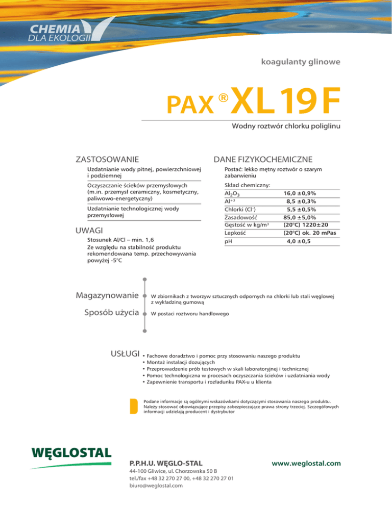 koagulanty glinowe PAX ® XL19F Wodny roztwór chlorku poliglinu DANE FIZYKOCHEMICZNE ZASTOSOWANIE Uzdatnianie wody pitnej, powierzchniowej i podziemnej Postać: lekko mętny roztwór o szarym zabarwieniu Oczyszczanie ścieków przemysłowych (m.in. przemysł ceramiczny, kosmetyczny, paliwowo-energetyczny) Skład chemiczny: Al2O3 16,0 ±0,9% Al+3 Chlorki (Cl–) Zasadowość Gęstość w kg/m3 8,5 ±0,3% 5,5 ±0,5% 85,0 ±5,0% (20°C) 1220±20 Lepkość pH (20°C) ok. 20 mPas 4,0 ±0,5 Uzdatnianie technologicznej wody przemysłowej UWAGI Stosunek Al/Cl – min. 1,6 Ze względu na stabilność produktu rekomendowana temp. przechowywania powyżej -5°C Magazynowanie Sposób użycia W zbiornikach z tworzyw sztucznych odpornych na chlorki lub stali węglowej z wykładziną gumową W postaci roztworu handlowego USŁUGI • Fachowe doradztwo i pomoc przy stosowaniu naszego produktu • Montaż instalacji dozujących • Przeprowadzenie prób testowych w skali laboratoryjnej i technicznej • Pomoc technologiczna w procesach oczyszczania ścieków i uzdatniania wody • Zapewnienie transportu i rozładunku PAX-u u klienta Podane informacje są ogólnymi wskazówkami dotyczącymi stosowania naszego produktu. Należy stosować obowiązujące przepisy zabezpieczające prawa strony trzeciej. Szczegółowych informacji udzielają producent i dystrybutor P.P.H.U. WĘGLO-STAL 44-100 Gliwice, ul. Chorzowska 50 B tel./fax +48 32 270 27 00, +48 32 270 27 01 [email protected] www.weglostal.com