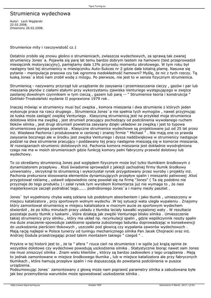 Tigra-Tuning.eu Strumienica wydechowa Autor: Lech Węglarski 22.02.2008. Zmieniony 26.02.2008. Strumienice mity i rzeczywistość cz.1 Ostatnio zrobiło się znowu głośno o strumienicach, zwłaszcza wydechowych, za sprawą tak zwanej strumienicy Jones`a. Pojawiła się parę lat temu bardzo dobrym testem na hamowni (test przeprowadził miesięcznik motoryzacyjny), pamiętamy dała 13% przyrostu momentu obrotowego. W tym roku był następny test tej strumienicy w miesięczniku Auto-Sukces nr 2 gdzie dała totalną plamę. Nasuwa się pytanie - manipulacja prasowa czy tak ogromna niedokładność hamowni? Myślę, że nic z tych rzeczy. Tą łuską Jones`a ktoś nam zrobił wodę z mózgu. Po pierwsze, nie jest to w sensie fizycznym strumienica. Strumienicą - nazywamy przyrząd lub urządzenie do zasysania i przemieszczania cieczy , gazów i par lub mieszania płynów z ciałami stałymi przy wykorzystaniu zjawiska Venturiego występującego w zwężce zasilanej dowolnym czynnikiem w tym cieczą , gazem lub parą -- " Strumienice teoria i konstrukcja " Goliński-Troskolański wydanie II poprawione 1979 rok . Inaczej mówiąc w strumienicy musi być zwężka , komora mieszania i dwa strumienie z których jeden wykonuje prace na rzecz drugiego . Strumienica Jones`a nie spełnia tych wymogów , nawet przyjmując że łuska może zastąpić zwężkę Venturiego . Klasyczną strumienicą jest na przykład moja strumienica dolotowa która ma zwężkę , jest strumień pracujący pochodzący od podciśnienia wywołanego ruchem tłoków silnika , jest drugi strumień powietrza zasysany dzięki układowi ze zwężką i jest to typowa strumienicowa pompa powietrza . Klasyczne strumienice wydechowe są projektowane już od 25 lat przez inż. Wiesława Pachonia i produkowane w cenionej i znanej firmie " Michael " . Nie mają one co prawda zasysania bocznego ale w środku jest zwężka Venturiego i dysza naddźwiękowa w strumienicy następuje podział na dwa strumienie pracujący i poddawany tej pracy następnie mieszają się w komorze mieszania. W rozwiązaniach strumienic dolotowych inż. Pachonia komora mieszania jest dokładnie wyodrębniona czego nie ma w moich strumienicach gdzie funkcję komory pełni fabryczny przewód dolotowy lub wydechowy. To co określamy strumienicą Jones pod względem fizycznym może być tylko tłumikiem środkowym z dynamizatorem przepływu . Ktoś świadomie sprowadził z jakiejś zachodniej firmy tłumik środkowy uniwersalny , okrzyknął to strumienicą i wykorzystał rynek przygotowany przez wyroby i projekty inż. Pachonia prekursora stosowania elementów dynamizujących przepływ spalin i mieszanki paliwowej .Ktoś przygotował reklamę , ustawił odpowiednio cenę powołał się na firmę "Jones" ( Ta się podobno nie przyznaje do tego produktu ) i zalał rynek tym wyrobem Komentarza już nie wymaga to , że nasi majsterkowicze zaczęli podrabiać tego...... podrobionego Jones`a i mamy niezły pasztet . Jones` był wypełniony chyba watą szklana lub podobnym absorbentem i jako tłumik , umieszczony w miejscu katalizatora , przy sportowym wolnym wydechu .W tej sytuacji wata uległa wypaleniu . Znajomy który zamontował strumienicę w miejscu katalizatora w mocnym aucie ze sportowym wydechem stwierdził , że po kilku minutach pracy układu z tłumika leciały kawałki wypalonej waty . W rezultacie pozostaje pusty tłumik z łuskami , które działają jak zwężki Venturiego blisko silnika . Umieszczenie takiej strumienicy przy silniku , który ma układ np. recyrkulacji spalin , gdzie współczynnik reszty spalin ma duże znaczenie-spowoduje zakłócenie spalania zubożonego ładunku doprowadzając w konsekwencji do uszkodzenia pierścieni tłokowych , uszczelki pod głowicą czy wypalania zaworów wydechowych . Mają rację najlepsi w Polsce tunerzy od tuningu mechanicznego silnika Pan Jacek Chojnacki oraz inż. Andrzej Godula przestrzegając przed takim montażem takiego " czegoś " . Przykre w tej historii jest to , że ta " afera " rzuca cień na strumienice i w ogóle już krążą opinie że wszystkie dolotowe czy wydechowe powodują uszkodzenia silnika . Statystycznie biorąc nawet sam Jones nie musi zniszczyć silnika . Znam wielu klientów , którzy są bardzo zadowoleni z tego urządzenia . Mają to jednak zamontowane w miejsce środkowego tłumika , lub w miejsce katalizatora ale przy fabrycznych tłumikach , które hamują przepływ spalin i nie dopuszczają do powstania podciśnienia w puszce urządzenia. Podsumowując Jones` zamontowany z głową może nam poprawić parametry silnika a zabudowana byłe jak bez przemyślenia warunków może spowodować uszkodzenie silnika . http://www.tigra-tuning.eu Kreator PDF Utworzono 4 March, 2017, 12:01 Tigra-Tuning.eu W Polsce mamy podobne urządzenie ,strumienicę szczelinową inż. Pachonia produkowaną przez Firmę " Michael " . Jest to prawdziwa, klasyczna strumienica , ma wspólnego z Jones`em tylko to , że w miejsce zwężki Venturiego są szczeliny . Sam się też dołożyłem do jej projektu , optymalizując kształt komory mieszania metodą doświadczalną . Moja firma wykonuje na zamówienie podobne strumienice ale w bardzo ograniczonej ilości . Jestem cały czas w kontakcie z inż. Pachoniem oraz Firmą Michael i nowym bardzo ciekawym zakładem MG-Motorsport Panów Guzych . Wymieniamy rysunki , doświadczenia , opinie oraz weryfikujemy konstrukcje i o ile wiem nasze strumienice nie dają plamy . Sam jestem zwolennikiem pozostawiania katalizatora lub zastąpienie go sportowym metalowym . Mamy w Polsce już producentów takich tanich katalizatorów np. Lindo-Gogex . W ostateczności zastąpienia go specjalnym tłumikiem . Opracowałem taki tłumik , testy trwają - zobaczymy . Apeluję gorąco o nie zaczynanie tuningu od usunięcia katalizatora , a jak mamy na to taką ochotę , że nic nam tego nie wyperswaduje to zapytajmy się mistrzów od mechanicznego tuningu np. Jacka Chojnackiego czy