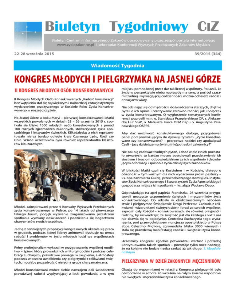 Biuletyn Tygodniowy CIZ Biuletyn Centrum Informacyjnego Zakonów opracowywany przez zespół portalu internetowego www.zyciezakonne.pl i sekretariat Konferencji Wyższych Przełożonych Zakonów Męskich 22-28 września 2015 39/2015 (344) Wiadomość Tygodnia KONGRES MŁODYCH I PIELGRZYMKA NA JASNEJ GÓRZE II KONGRES MŁODYCH OSÓB KONSEKROWANYCH II Kongres Młodych Osób Konsekrowanych „Radość konsekracji” bez wątpienia stał się największym i najbardziej entuzjastycznym wydarzeniem przeżywanego w Kościele Roku Życia Konsekrowanego w naszej ojczyźnie. Na Jasnej Górze u boku Maryi – pierwszej konsekrowanej i Matki wszystkich powołanych w dniach 23 – 26 września 2015 r. spotkało się blisko 1000 młodych osób konsekrowanych z ponad 100 różnych zgromadzeń zakonnych, stowarzyszeń życia apostolskiego i instytutów świeckich. Kilkadziesiąt z nich reprezentowało nieraz bardzo odległe kraje Czarnego Lądu, Rosji czy Chin. Wśród uczestników była również reprezentantka klasztorów klauzurowych. miejscu pomnożonej przez dar tak licznej wspólnoty. Pokazali, że życie w perspektywie nieba naprawdę ma sens, a pośród czasami trudnej i wymagającej codzienności, można odnaleźć radość i entuzjazm wiary. Nie odcinając się od mądrości i doświadczenia starszych, chętnie pytali o ich opinie i przeżywanie zarówno radości, jak i bolączek w życiu konsekrowanym. O wygłoszenie tematycznych konferencji poprosili m.in. o. Stanisława Przepierskiego OP, s. Aleksandrę Huf SSsP, o. Mateusza Hinca OFM Cap i o. Augustyna Pelanowskiego OSPPE. Aby dać możliwość konstruktywnego dialogu, przygotowali panel pod prowokującym do dyskusji tytułem: „Życie konsekrowane czy konserwowane? – proroctwo nadziei czy apokalipsa? Czyli – jacy dzisiejszemu światu (nie)potrzebni zakonnicy?” Nie bali się zadawać trudnych pytań, i choć wiele z nich pozostało otwartych, to bardzo mocno postulowali przedstawienie ich siostrom i braciom odpowiedzialnym za ich wspólnoty i decydującym o formacji i sposobie życia dzisiejszych zakonników. W bliskości Matki czuli się Kościołem i w Kościele, dlatego o obecność w tym ważnym dla nich wydarzeniu prosili pasterzy – ks. bpa Kazimierza Gurdę, przewodniczącego Komisji ds. Instytutów Życia Konsekrowanego i Stowarzyszeń Życia Apostolskiego i gospodarza miejsca ich spotkania – ks. abpa Wacława Depo. Młodzi, zainspirowani przez 4 Konsulty Wyższych Przełożonych życia konsekrowanego w Polsce, po 14 latach od pierwszego takiego forum, podjęli wyzwanie zorganizowania przestrzeni spotkania wymiany doświadczeń i podzielenia się bogactwem charyzmatów swoich wspólnot. Jedną z cenniejszych propozycji kongresowych okazała się praca w grupach, podczas której liderzy animowali dyskusję na temat radości i problemów w życiu młodych ludzi we wspólnotach konsekrowanych. Pełny profesjonalizm wykazali w przygotowaniu wspólnej modlitwy – śpiew, który prowadził ich w liturgii godzin i podczas celebracji Eucharystii, prawdziwie pomagał w skupieniu, a atmosfery podczas wieczoru uwielbienia czy pielgrzymki z relikwiami świętych, mogłaby pozazdrościć niejedna grupa charyzmatyczna. Młodzi konsekrowani wobec siebie nawzajem dali świadectwo prawdziwej radości wypływającej z łaski powołania, a w tym Odpowiadając na apel papieża Franciszka, 26 września przygotowali uroczyste wspomnienie świętych i męczenników życia konsekrowanego. Do udziału w okolicznościowym nabożeństwie i pielgrzymce Świadkowie Drogi Perfectae Caritatis z relikwiami i wizerunkami świętych sióstr i braci ze swoich wspólnot, zaprosili cały Kościół – konsekrowanych, ale również przyjaciół i rodziny, by zaświadczyć, że świętość jest dla każdego i nikt z nas nie zbawia się w pojedynkę. Centralna Eucharystia tego wydarzenia, pod przewodnictwem nuncjusza apostolskiego w Polsce abpa Celestino Migliore, zgromadziła blisko 3000 wiernych i stała się prawdziwą manifestacją radości i świętości życia konsekrowanego. Uczestnicy kongresu zgodnie potwierdzali wartość i potrzebę kontynuowania takich spotkań – pozostaje tylko mieć nadzieję, że na kolejne nie będzie trzeba czekać aż tak długo. S. Magdalena Bajan PIELGRZYMKA W DZIEŃ ZAKONNYCH MĘCZENNIKÓW Okazją do wspomnianej w relacji z Kongresu pielgrzymki było obchodzone w sobote 26 września na całym świecie wspomnienie świętych i męczenników życia konsekrowanego. 22-28 września 2015 Biuletyn Tygodniowy CiZ 39/2015 (344) ______________________________________________________________________________________________ wspomnieć wiele sióstr, które w powojennych obozach pracy umierały powoli z wycieńczenia”. Trzeba męczenników z dalszej i bliższej przeszłości przypomnieć (…). Chcemy ich twarze przypomnieć Kościołowi w Polsce, ludowi Bożemu w naszej Ojczyźnie (…). Trzeba byśmy zobaczyli, jak wielu spośród nas umiało być wiernymi do końca, aż do przelania krwi – napisali w zaproszeniu m. Leticja Niemczura CSSJ i o. Janusz Sok CSRS, przewodniczący żeńskiej i męskiej konferencji zakonnej wyższych przełożonych. Po nabożeństwie kilka tysięcy sióstr zakonnych, zakonników i przedstawicieli Instytutów Życia Konsekrowanego, przeszło w procesji z Archikatedry Częstochowskiej w „Pielgrzymce wdzięczności Bogu za świętych i męczenników życia konsekrowanego - Świadkowie Drogi - Perfectae Caritatis”. Przedstawiciele poszczególnych zakonów i zgromadzeń nieśli w pielgrzymce relikwie świętych i błogosławionych męczenników ze swoich zgromadzeń. Wiemy dobrze jak wiele osób konsekrowanych z Polski dało na przestrzeni dziejów świadectwo męczeństwa. Począwszy od Pięciu braci męczenników, którzy oddali życie za Chrystusa w 1003 r. w Międzyrzeczu, aż po męczenników naszych czasów, których szczególnymi twarzami stają się o. Michał Tomaszek i o. Zbigniew Strzał
