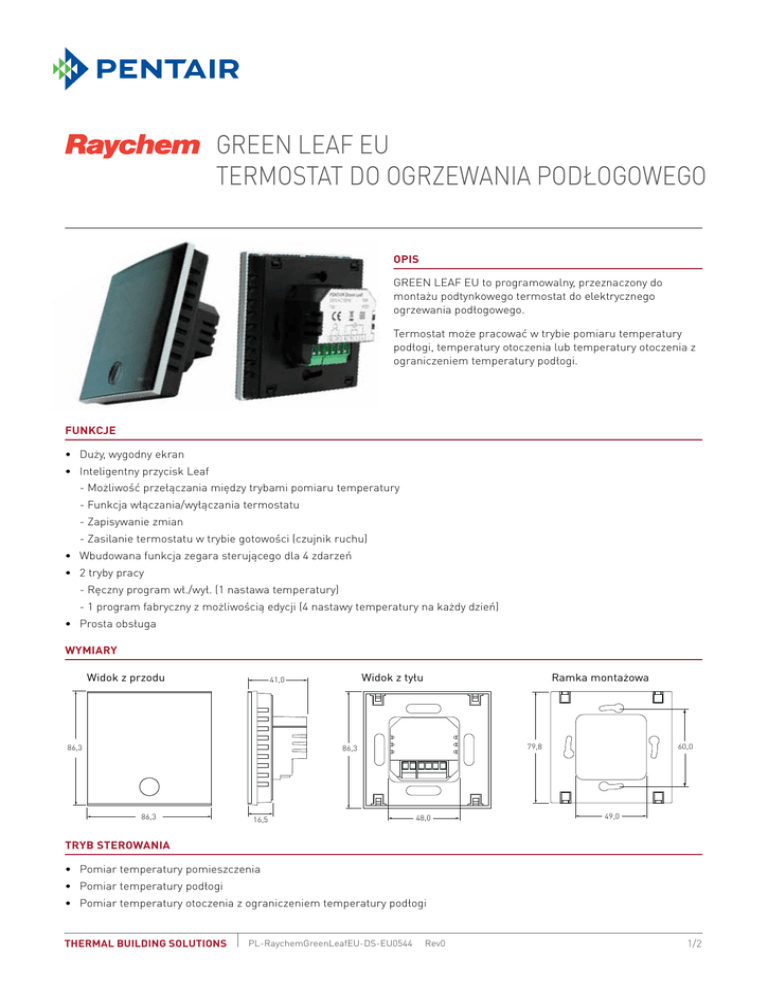 GREEN LEAF EU TERMOSTAT DO OGRZEWANIA PODŁOGOWEGO OPIS GREEN LEAF EU to programowalny, przeznaczony do montażu podtynkowego termostat do elektrycznego ogrzewania podłogowego. Termostat może pracować w trybie pomiaru temperatury podłogi, temperatury otoczenia lub temperatury otoczenia z ograniczeniem temperatury podłogi. Funkcje • Duży, wygodny ekran • Inteligentny przycisk Leaf - Możliwość przełączania między trybami pomiaru temperatury -F unkcja włączania/wyłączania termostatu - Zapisywanie zmian - Zasilanie termostatu w trybie gotowości (czujnik ruchu) • Wbudowana funkcja zegara sterującego dla 4 zdarzeń • 2 tryby pracy - Ręczny program wł./wył. (1 nastawa temperatury) - 1 program fabryczny z możliwością edycji (4 nastawy temperatury na każdy dzień) • Prosta obsługa WYMIARY Widok z przodu Widok z tyłu 41,0 86,3 Ramka montażowa 79,8 86,3 86,3 16,5 48,0 60,0 49,0 TRYB STEROWANIA • Pomiar temperatury pomieszczenia • Pomiar temperatury podłogi • Pomiar temperatury otoczenia z ograniczeniem temperatury podłogi THERMAL building SOLUTIONS PL-RaychemGreenLeafEU-DS-EU0544 Rev0 1/2 DANE TECHNICZNE Napięcie zasilania: 230 V AC (+10% / -15%) – 50 Hz Parametry przekaźnika 230 V AC, maks. 13 A obciążenia rezystancyjnego (maks. 3000 W) Zużycie energii (tryb czuwania) 3 VA Dopuszczalna temperatura otoczenia 0 .. +40°C, 5 do 95% wilgotności względnej (bez skraplania) Histereza przełączania 1 K (ustawienia fabryczne regulowane w przedziale 0,5 - 2,0 K) Złącza Maks. 2,5 mm² Klasa ochrony IP 21 Czujnik Zewnętrzny czujnik temperatury podłogi (zakres od +5 do +35°C) - Z przewodem 3 m (maks. przedłużenie 100 m z 2 x 1,5 mm²) - Typ NTC 10K przy 25°C - Kompatybilny z obecnie dostępnymi czujnikami temperatury podłogi Raychem (NRG-Temp, R-TA, R-TC, R-TE) Wbudowany czujnik temperatury otoczenia (zakres od +5 do +40°C) Temperatura transportu -10 .. +60°C Atesty Certyfikacja CE zgodnie z wymaganiami norm EN 60730-1:2011 & EN 60730-2-9:2010 Zgodność z dyrektywą RoHS Zgodność z dyrektywą WEEE INFORMACJE O SYSTEMIE Zgodność z następującymi produktami Raychem: • Maty T2QuickNet 90 W/m² i 160 W/m² • Samoregulujący przewód grzejny T2Red • Stałooporowe przewody grzejne T2Blue 10 W/m i T2Blue 20 W/m • Stałooporowe przewody grzejne T2Green • Stałooporowe przewody grzejne CeraPro OPAKOWANIE Opakowanie zawiera: •Termostat • Czujnik temperatury podłogi •Ramkę montażową •Skróconą instrukcję obsługi w kilku językach Pełną instrukcję obsługi w języku angielskim i skrócona instrukcję obsługi w kilku językach można pobrać po zeskanowaniu kodu. pentairthermal.com/manuals/ DANE POTRZEBNE DO ZAMÓWIENIA NR KAT. Termostat GREEN LEAF EU 1244-017312 Zapasowy czujnik temperatury podłogi 1244-002952 WWW.PENTAIRTHERMAL.PL POLSKA Tel. +48 22 331 29 50 Fax +48 22 331 29 51 [email protected] Znak Pentair stanowi własność firmy Pentair albo jej podmiotów stowarzyszonych. Wszelkie pozostałe znaki towarowe stanowią własność ich właścicieli. Pentair zastrzega sobie prawo do zmiany specyfikacji bez wcześniejszego powiadomienia. © 2016 Pentair. THERMAL building SOLUTIONS PL-RaychemGreenLeafEU-DS-EU0544 Rev0 2/2