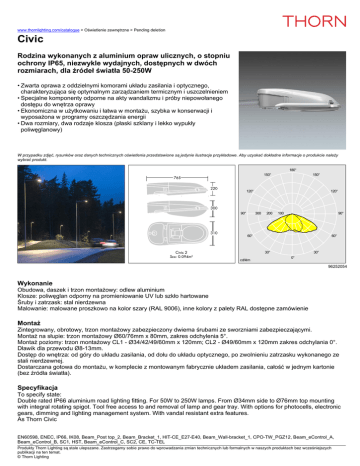 www.thornlighting.com/catalogue > Oświetlenie zewnętrzne > Pending deletion Civic Rodzina wykonanych z aluminium opraw ulicznych, o stopniu ochrony IP65, niezwykle wydajnych, dostępnych w dwóch rozmiarach, dla źródeł światła 50-250W • Zwarta oprawa z oddzielnymi komorami układu zasilania i optycznego, charakteryzująca się optymalnym zarządzaniem termicznym i uszczelnieniem • Specjalne komponenty odporne na akty wandalizmu i próby niepowołanego dostępu do wnętrza oprawy • Ekonomiczna w użytkowaniu i łatwa w montażu, szybka w konserwacji i wyposażona w programy oszczędzania energii • Dwa rozmiary, dwa rodzaje klosza (płaski szklany i lekko wypukły poliwęglanowy) W przypadku zdjęć, rysunków oraz danych technicznych oświetlenia przedstawione są jedynie ilustracje przykładowe. Aby uzyskać dokładne informacje o produkcie należy wybrać produkt. 180° 150° 150° 120° 90° 120° 300 200 100 90° 60° 60° 30° cd/klm 30° 0° 96252054 Wykonanie Obudowa, daszek i trzon montażowy: odlew aluminium Klosze: poliwęglan odporny na promieniowanie UV lub szkło hartowane Śruby i zatrzask: stal nierdzewna Malowanie: malowane proszkowo na kolor szary (RAL 9006), inne kolory z palety RAL dostępne zamówienie Montaż Zintegrowany, obrotowy, trzon montażowy zabezpieczony dwiema śrubami ze sworzniami zabezpieczającymi. Montaż na słupie: trzon montażowy Ø60/76mm x 80mm, zakres odchylenia 5°. Montaż poziomy: trzon montażowy CL1 - Ø34/42/49/60mm x 120mm; CL2 - Ø49/60mm x 120mm zakres odchylania 0°. Dławik dla przewodu Ø8-13mm. Dostęp do wnętrza: od góry do układu zasilania, od dołu do układu optycznego, po zwolnieniu zatrzasku wykonanego ze stali nierdzewnej. Dostarczana gotowa do montażu, w komplecie z montowanym fabrycznie układem zasilania, całość w jednym kartonie (bez źródła światła). Specyfikacja To specify state: Double rated IP66 aluminium road lighting fitting. For 50W to 250W lamps. From Ø34mm side to Ø76mm top mounting with integral rotating spigot. Tool free access to and removal of lamp and gear tray. With options for photocells, electronic gears, dimming and lighting management system. With vandal resistant extra features. As Thorn Civic EN60598, ENEC, IP66, IK08, Beam_Post top_2, Beam_Bracket_1, HIT-CE_E27-E40, Beam_Wall-bracket_1, CPO-TW_PGZ12, Beam_eControl_A, Beam_eControl_B, SC1, HST, Beam_eControl_C, SC2, CE, TC-TEL Produkty Thorn Lighting są stale ulepszane. Zastrzegamy sobie prawo do wprowadzania zmian technicznych lub formalnych w naszych produktach bez wcześniejszych publikacji na ten temat. © Thorn Lighting