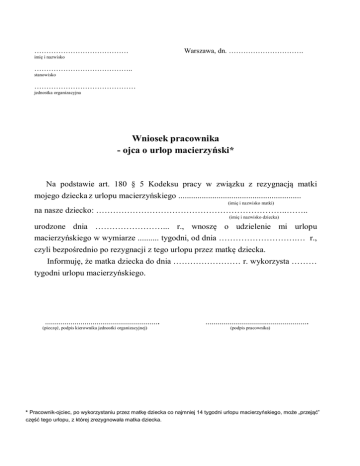 ………………………………… Warszawa, dn. …………………………. imię i nazwisko ………………………………….. stanowisko …………………………………… jednostka organizacyjna Wniosek pracownika - ojca o urlop macierzyński* Na podstawie art. 180 § 5 Kodeksu pracy w związku z rezygnacją matki mojego dziecka z urlopu macierzyńskiego .......................................................... (imię i nazwisko matki) na nasze dziecko: …………………………………………………………..…….. (imię i nazwisko dziecka) urodzone dnia ……………………... r., wnoszę o udzielenie mi urlopu macierzyńskiego w wymiarze .......... tygodni, od dnia ……………………….… r., czyli bezpośrednio po rezygnacji z tego urlopu przez matkę dziecka. Informuję, że matka dziecka do dnia …………………… r. wykorzysta ……… tygodni urlopu macierzyńskiego. …………………………………………………. (pieczęć, podpis kierownika jednostki organizacyjnej) ……………………………………………. (podpis pracownika) * Pracownik-ojciec, po wykorzystaniu przez matkę dziecka co najmniej 14 tygodni urlopu macierzyńskiego, może „przejąć” część tego urlopu, z której zrezygnowała matka dziecka.