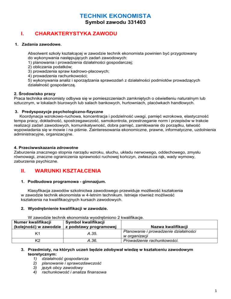 TECHNIK EKONOMISTA Symbol zawodu 331403 I. CHARAKTERYSTYKA ZAWODU 1. Zadania zawodowe. Absolwent szkoły kształcącej w zawodzie technik ekonomista powinien być przygotowany do wykonywania następujących zadań zawodowych: 1) planowania i prowadzenia działalności gospodarczej; 2) obliczania podatków; 3) prowadzenia spraw kadrowo-płacowych; 4) prowadzenia rachunkowości; 5) wykonywania analiz i sporządzania sprawozdań z działalności podmiotów prowadzących działalność gospodarczą. 2. Środowisko pracy Praca technika ekonomisty odbywa się w pomieszczeniach zamkniętych o oświetleniu naturalnym lub sztucznym, w lokalach biurowych lub salach bankowych, hurtowniach, placówkach handlowych. 3. Predyspozycje psychologiczno-fizyczne Koordynacja wzrokowo-ruchowa, koncentracja i podzielność uwagi, pamięć wzrokowa, elastyczność tempa pracy, dokładność, spostrzegawczość, samokontrola, przestrzeganie norm i przepisów w trakcie realizacji zadań zawodowych, komunikatywność, dobra pamięć, zamiłowanie do porządku, łatwość wypowiadania się w mowie i na piśmie. Zainteresowania ekonomiczne, prawne, informatyczne, uzdolnienia administracyjne, organizacyjne. 4. Przeciwwskazania zdrowotne Zaburzenia znacznego stopnia narządu wzroku, słuchu, układu nerwowego, oddechowego, zmysłu równowagi, znaczne ograniczenia sprawności ruchowej kończyn, zwłaszcza rąk, wady wymowy, zaburzenia psychiczne. II. WARUNKI KSZTAŁCENIA 1. Podbudowa programowa - gimnazjum. Klasyfikacja zawodów szkolnictwa zawodowego przewiduje możliwość kształcenia w zawodzie technik ekonomista w 4-letnim technikum. Istnieje również możliwość kształcenia na kwalifikacyjnych kursach zawodowych. 2. Wyodrębnienie kwalifikacji w zawodzie. W zawodzie technik ekonomista wyodrębniono 2 kwalifikacje. Numer kwalifikacji Symbol kwalifikacji (kolejność) w zawodzie z podstawy programowej Nazwa kwalifikacji Planowanie i prowadzenie działalności K1 A.35. w organizacji K2 A.36. Prowadzenie rachunkowości. 3. Przedmioty, na których uczeń będzie zdobywał wiedzę w kształceniu zawodowym teoretycznym: 1) działalność gospodarcza 2) planowanie i sprawozdawczość 3) język obcy zawodowy 4) rachunkowość i analiza finansowa 1 4. Przedmioty, na których uczeń będzie zdobywał umiejętności w kształceniu zawodowym praktycznym 1) pracownia ekonomiczna 2) pracownia finansowo-księgowa i analiz 3) praktyki zawodowe W trakcie trwania nauki są do zdobycia dwie(2) kwalifikacje wyodrębnione w zawodzie.  Egzamin potwierdzający pierwszą kwalifikację (K1) odbywa się pod koniec II semestru klasy drugiej.  Egzamin potwierdzający drugą kwalifikację (K2) odbywa się pod koniec I semestru klasy czwartej. Po każdym zdanym egzaminie uczeń otrzymuje świadectwo uzyskania kwalifikacji. Mając zaliczone wszystkie egzaminy potwierdzające zdobycie wymaganych kwalifikacji w zawodzie uczeń otrzymuje dyplom technika. 5. MOŻLIWOŚCI UZYSKIWANIA DODATKOWYCH KWALIFIKACJI W ZAWODACH W RAMACH OBSZARU KSZTAŁCENIA OKREŚLONEGO W KLASYFIKACJI ZAWODÓW SZKOLNICTWA ZAWODOWEGO Absolwent szkoły kształcącej w zawodzie technik ekonomista po potwierdzeniu kwalifikacji A.35. Planowanie i prowadzenie działalności w organizacji i A.36. Prowadzenie rachunkowości może uzyskać dyplom potwierdzający kwalifikacje w zawodzie technik rachunkowości, po potwierdzeniu dodatkowo kwalifikacji A.65. Rozliczanie wynagrodzeń i danin publicznych. III. KARIERA ZAWODOWA Kwalifikacje zawodowe, nabyte w procesie kształcenia, umożliwią absolwentowi podejmowanie pracy między innymi w: 1) instytucjach związanych z bankowością, 2) instytucjach ubezpieczeniowych, 3) urzędach skarbowych, 4) obrót i zarządzanie nieruchomościami, 5) podmiotach gospodarczych, w których potrzebna jest wiedza i umiejętności z zakresu finansów rachunkowości, stowarzyszenia i fundacje, 6) 7) 8) 9) urzędy administracji, sekretariaty, biura księgowe, agencje celne, biura maklerskie, 10) instytucjach prowadzących badania rynku, 11) własna firma, IV. MOŻLIWOŚCI DALSZEGO KSZTAŁCENIA Po przystąpieniu i zdaniu egzaminu maturalnego absolwent ma możliwość kontynuacji nauki na studiach wyższych lub w szkole policealnej. 2
