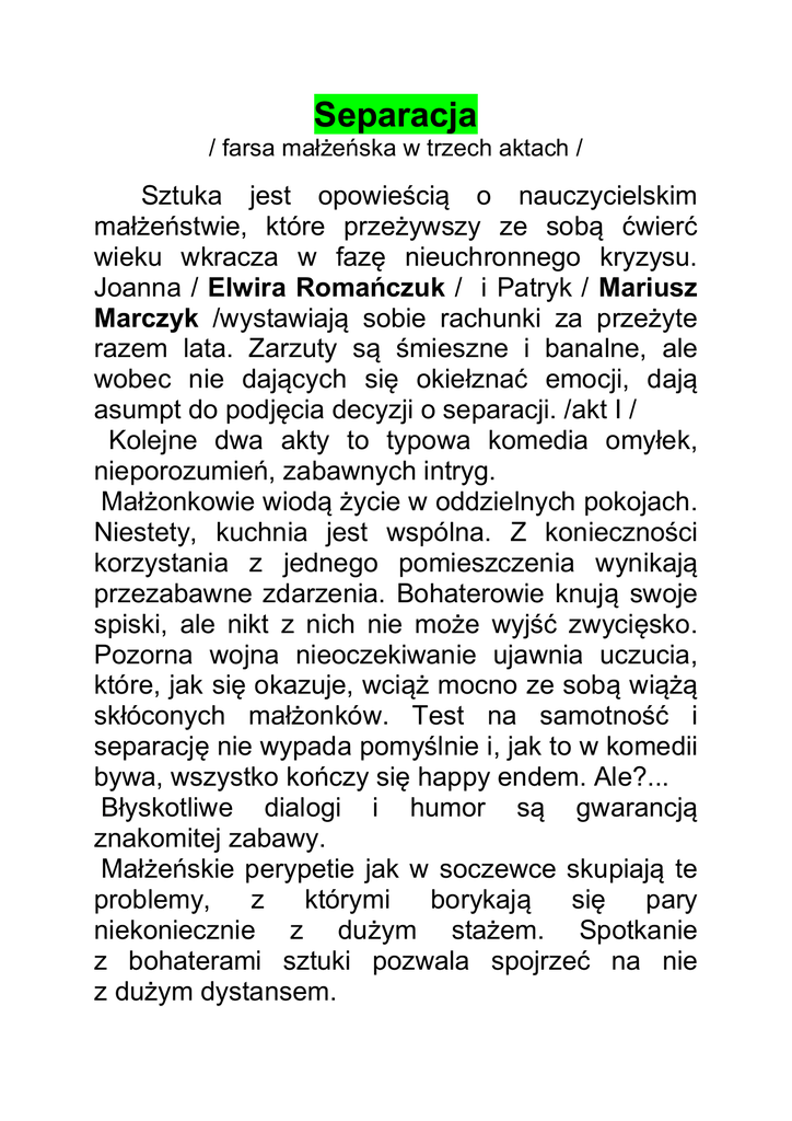 Separacja / farsa małżeńska w trzech aktach / Sztuka jest opowieścią o nauczycielskim małżeństwie, które przeżywszy ze sobą ćwierć wieku wkracza w fazę nieuchronnego kryzysu. Joanna / Elwira Romańczuk / i Patryk / Mariusz Marczyk /wystawiają sobie rachunki za przeżyte razem lata. Zarzuty są śmieszne i banalne, ale wobec nie dających się okiełznać emocji, dają asumpt do podjęcia decyzji o separacji. /akt I / Kolejne dwa akty to typowa komedia omyłek, nieporozumień, zabawnych intryg. Małżonkowie wiodą życie w oddzielnych pokojach. Niestety, kuchnia jest wspólna. Z konieczności korzystania z jednego pomieszczenia wynikają przezabawne zdarzenia. Bohaterowie knują swoje spiski, ale nikt z nich nie może wyjść zwycięsko. Pozorna wojna nieoczekiwanie ujawnia uczucia, które, jak się okazuje, wciąż mocno ze sobą wiążą skłóconych małżonków. Test na samotność i separację nie wypada pomyślnie i, jak to w komedii bywa, wszystko kończy się happy endem. Ale?... Błyskotliwe dialogi i humor są gwarancją znakomitej zabawy. Małżeńskie perypetie jak w soczewce skupiają te problemy, z którymi borykają się pary niekoniecznie z dużym stażem. Spotkanie z bohaterami sztuki pozwala spojrzeć na nie z dużym dystansem. Producent spektaklu: Scena ”Rode” Kraków-Rzeszów Reżyseria: Elwira Romańczuk Scenografia: Lidia Hardulak Muzyka: Maria Natalia Rajkin Czas trwania spektaklu: 2h./ w tym 10 min. Przerwy po 1i2 akcie / Premiera: Kraków 2013 Dystrybucja spektaklu: Agencja Promocji: Krosno ul. Żwirki i Wigury 13/2 tel. 660 772 125 Producent: Scena „Rode” Kraków Informacja o wykonawcach: Joanna Kowalska - Elwira Romańczuk Patryk Kowalski - Mariusz Marczyk Elwira Romańczuk - magister sztuki, absolwentka PWSFiTV w Łodzi, Wydział Aktorski/1982/ Aktorka teatrów w Łodzi, Warszawie, Wrocławiu, Tarnowie, Kaliszu, Krakowie / role filmowe – „Najciekawsza historia”, „Osobliwy pamiętnik grzesznika” J.W. Hassa /, reżyser wielu autorskich spektakli teatralnych, wieloletni wykładowca sztuki aktorskiej / Uniwersytet „La Sapienza”, Akademia „Pietro Scharoff” – Rzym, Uniwersytet Jana Kochanowskiego – Kielce / Nagroda Ministra Kultury za działalność artystyczną /2004/Nagroda za rolę na Międzynarodowym Festiwalu w Sankt Petersburgu / 2003 / Od sezonu 2012/ 2013 współpracuje ze Sceną „Rode” Kraków – Tarnów - Rzeszów Mariusz Marczyk – aktor, dyplom aktorski ZASP, założyciel i dyrektor artystyczny Sceny „Rode” Kraków – Tarnów – Rzeszów / 2003 r. / Autor powieści, dramatów i książek poetyckich. Między innymi: „Dziadek – carski oficer” / powieść / „Fetysze Izydora Bluma” /powieść/, „Przypadki męskiej nieśmiałości” /powieść/ „Tysiąc franków Norwida” /dramat/ „Na dnie duszy prawda” /dramat/ , „Separacja” /farsa/ . Mistrz żywego słowa – zdobywca wielu nagród. Między innymi nagrody Grand Prix im. Mieczysława Kotlarczyka na Międzynarodowym Festiwalu Sztuki Słowa Poznaniu, a także nagrody za najlepszą interpretację tekstu biblijnego oraz nagrody publiczności / Poznań 2006 /.