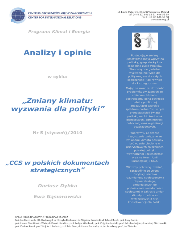 Program: Klimat i Energia Analizy i opinie w cyklu: „Zmiany klimatu: wyzwania dla polityki” Nr 5 (styczeń)/2010 „CCS w polskich dokumentach strategicznych” Dariusz Dybka Ewa Gąsiorowska Postępujące zmiany klimatyczne mają wpływ na politykę, gospodarkę i na codzienne życie Polaków. Stanowią one globalne wyzwanie nie tylko dla polityków, ale dla całych społeczności, jak również dla każdego z nas. Mając na uwadze złożoność problemów związanych ze zmianami klimatu, dostrzegamy pilną potrzebę debaty publicznej angażującej szerokie spektrum partnerów, w tym przedstawicieli świata polityki, nauki, środowisk biznesowych, administracji publicznej oraz organizacji pozarządowych. Wierzymy, że szanse i zagrożenia związane ze zmianami klimatu powinny być odzwierciedlone w priorytetowych założeniach polskiej polityki wewnętrznej i zewnętrznej oraz na forum Unii Europejskiej i ONZ. Widzimy potrzebę działań, szczególnie ze strony instytucji szeroko rozumianego społeczeństwa obywatelskiego, zmierzających do podniesienia świadomości społecznej w zakresie zmian klimatycznych oraz wynikających z nich konsekwencji dla Polski. CCS w polskich dokumentach strategicznych Wzajemne powiązanie zagadnień klimatu, energii i bezpieczeństwa energetycznego w przypadku Polski koncentruje się na sposobach wykorzystania węgla jako podstawowego surowca energetycznego, który z jednej strony jest wyjątkowo niepożądany z punktu widzenia klimatu, jednocześnie będąc funkcjonalnym elementem dla bezpieczeństwa energetycznego Polski. Unia Europejska stawiając sobie ambitne cele w dziedzinie klimatu i lokując w tym swój przyszłościowy interes gospodarczy i polityczny, uwzględnia rolę węgla w polityce energetycznej. W odpowiedzi na działania strategiczne UE, Polska przygotowała dokumenty uwzględniające zarówno cele redukcji emisji jak i innowacji technologicznych, które mają do nich prowadzić. Raport Polska 2030 wyzwania rozwojowe jest efektem prac Zespołu Doradców Strategicznych Prezesa Rady Ministrów. Definiując przyszłość energetyczną i klimatyczną Polski, dokument ten odnosi się bezpośrednio do użycia technologii wychwytywania i sekwestracji węgla widząc dla niej zastosowanie w Polsce. Dokument strategiczny Polityka energetyczna Polski do 2030r. Polityka zakłada poza rozwojem sektora energii atomowej rozwój czystych technologii węglowych, CCS oraz 20% energii pochodzącej ze źródeł odnawialnych. Kwestie związane z wychwytywaniem, transportem i składowaniem CO 2 w sposób logiczny wpisują się w zakres VI kierunku Polityki dotyczącego ograniczenia oddziaływania energetyki na środowisko. Osiągnięcie takich założeń ma być możliwe dzięki: wykorzystaniu przychodów z aukcji uprawnień do emisji CO 2 do wspierania działań ograniczających emisję gazów cieplarnianych, wprowadzenie standardów budowy nowych elektrowni w systemie przygotowania do wychwytywania CO2 oraz określenie krajowych możliwości geologicznego składowania dwutlenku węgla, w tym w pustych złożach ropy naftowej i gazu ziemnego na dnie Morza Bałtyckiego, aktywny udział w realizacji inicjatywy Komisji Europejskiej, dotyczącej budowy obiektów demonstracyjnych dużej skali, w zakresie technologii wychwytywania i magazynowania dwutlenku węgla (CCS), wykorzystanie technologii CCS do wspomagania wydobycia ropy naftowej i gazu ziemnego, zintensyfikowanie badań naukowych i prac rozwojowych nad technologią CCS oraz nowymi technologiami pozwalającymi 1 wykorzystać wychwycony CO2 jako surowiec w innych gałęziach przemysłu, wsparcie działań w zakresie ochrony środowiska z wykorzystaniem m.in.: funduszy europejskich. Przepisy o CCS powinny określać ramy prawne do wszelkich wskazanych wyżej zagadnień, aby zapewnić odpowiednie warunki do jej realizacji. Przedmiotem dyrektywy w sprawie geologicznego składowania CO 2 jest bezpieczeństwo składowania i środowisko. Regulacja prawna musi objąć zagadnienia wyboru składowiska i pozwolenia na składowanie, warunki eksploatacji i zamknięcia składowiska, powołanie organu nadzorującego i odpowiedzialnego po przekazaniu przez operatora oraz prawo dostępu do sieci transportu CO2. Przygotowanie legislacji jest zadaniem kompleksowym ze względu na wiele dziedzin prawa, które będą wymagały dostosowania. Mowa tutaj o prawie rzeczowym, prawie ochrony środowiska, zapisach dotyczących wywłaszczenia, odpowiedzialności państwa, ryzyka związanego z transportem i składowaniem oraz przepisów transgranicznych, gdyby inne kraje chciały przesyłać lub składować CO2 na terytorium Polski. Polski rząd ma obowiązek wdrożyć dyrektywę do kwietnia 2011 roku. Za prace nad projektem ustawy odpowiada Ministerstwo Środowiska. Wśród zainteresowanych powstaniem tej regulacji znajdują się również instytucje prywatne, które ze względu na działalność energetyczną będą realizować projekty CCS. Szczególnie aktywne pozostają przedsiębiorstwa działające w ramach Polskiej Platformy Czystych Technologii Węglowych.1 Ministerstwo Środowiska w połowie 2008 roku przyjęło program „Działania Ministerstwa Środowiska w celu rozpoznania struktur geologicznych dla podziemnego składowania dwutlenku węgla”, aby określić możliwości sekwestracji dwutlenku węgla na terenie Polski oraz przedstawienie priorytetowych kierunków działań Ministra Środowiska w tym zakresie, w tym także dostosowanie przepisów prawa krajowego w zakresie regulowanym dyrektywą w sprawie geologicznego składowania dwutlenku węgla. W listopadzie 2009 roku, Ministerstwo Środowiska przedstawiło projekt założeń ustawy określającej zasady zatłaczania CO 2 do warstw geologicznych, propozycje rozwiązań dotyczących monitorowania składowiska oraz jego zamknięcia oraz rozwiązania w zakresie 1 Polska Grupa Energetyczna S.A., Południowy Koncern Energetyczny S.A., GDF Suez Polska, EDF Polska Sp. z