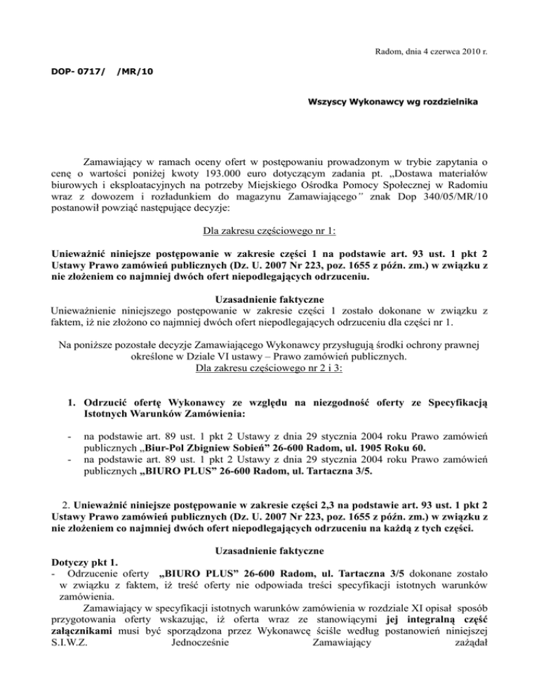 Radom, dnia 4 czerwca 2010 r. DOP- 0717/ /MR/10 Wszyscy Wykonawcy wg rozdzielnika Zamawiający w ramach oceny ofert w postępowaniu prowadzonym w trybie zapytania o cenę o wartości poniŜej kwoty 193.000 euro dotyczącym zadania pt. „Dostawa materiałów biurowych i eksploatacyjnych na potrzeby Miejskiego Ośrodka Pomocy Społecznej w Radomiu wraz z dowozem i rozładunkiem do magazynu Zamawiającego” znak Dop 340/05/MR/10 postanowił powziąć następujące decyzje: Dla zakresu częściowego nr 1: UniewaŜnić niniejsze postępowanie w zakresie części 1 na podstawie art. 93 ust. 1 pkt 2 Ustawy Prawo zamówień publicznych (Dz. U. 2007 Nr 223, poz. 1655 z późn. zm.) w związku z nie złoŜeniem co najmniej dwóch ofert niepodlegających odrzuceniu. Uzasadnienie faktyczne UniewaŜnienie niniejszego postępowanie w zakresie części 1 zostało dokonane w związku z faktem, iŜ nie złoŜono co najmniej dwóch ofert niepodlegających odrzuceniu dla części nr 1. Na poniŜsze pozostałe decyzje Zamawiającego Wykonawcy przysługują środki ochrony prawnej określone w Dziale VI ustawy – Prawo zamówień publicznych. Dla zakresu częściowego nr 2 i 3: 1. Odrzucić ofertę Wykonawcy ze względu na niezgodność oferty ze Specyfikacją Istotnych Warunków Zamówienia: - na podstawie art. 89 ust. 1 pkt 2 Ustawy z dnia 29 stycznia 2004 roku Prawo zamówień publicznych „Biur-Pol Zbigniew Sobień” 26-600 Radom, ul. 1905 Roku 60. na podstawie art. 89 ust. 1 pkt 2 Ustawy z dnia 29 stycznia 2004 roku Prawo zamówień publicznych „BIURO PLUS” 26-600 Radom, ul. Tartaczna 3/5. 2. UniewaŜnić niniejsze postępowanie w zakresie części 2,3 na podstawie art. 93 ust. 1 pkt 2 Ustawy Prawo zamówień publicznych (Dz. U. 2007 Nr 223, poz. 1655 z późn. zm.) w związku z nie złoŜeniem co najmniej dwóch ofert niepodlegających odrzuceniu na kaŜdą z tych części. Uzasadnienie faktyczne Dotyczy pkt 1. - Odrzucenie oferty „BIURO PLUS” 26-600 Radom, ul. Tartaczna 3/5 dokonane zostało w związku z faktem, iŜ treść oferty nie odpowiada treści specyfikacji istotnych warunków zamówienia. Zamawiający w specyfikacji istotnych warunków zamówienia w rozdziale XI opisał sposób przygotowania oferty wskazując, iŜ oferta wraz ze stanowiącymi jej integralną część załącznikami musi być sporządzona przez Wykonawcę ściśle według postanowień niniejszej S.I.W.Z. Jednocześnie Zamawiający zaŜądał w rozdziale XI pkt 12 specyfikacji istotnych warunków zamówienia : − podpisanego przez umocowanego (zgodnie z reprezentacją zawartą w dokumentach rejestrowych) przedstawiciela oferenta lub właściwie umocowanego pełnomocnika i wypełnionego według załączonego do niniejszej specyfikacji istotnych warunków zamówienia wzoru formularza ofertowego (Załącznik nr 1); − oryginału, lub poświadczonej przez Wykonawcę kopii, właściwego pełnomocnictwa, jeŜeli oferta i wszystkie wymagane załączniki zostaną podpisane przez umocowanego pełnomocnika. − zaakceptowanego i podpisanego przez umocowanego przedstawiciela Wykonawcy na kaŜdej stronie wzoru umowy przekazanego w materiałach przetargowych (Załącznik nr 4). Wykonawca nie sporządził swojej oferty zgodnie z postanowieniami specyfikacji istotnych warunków zamówienia (w szczególności z postanowieniami znajdującymi się w rozdziale XI specyfikacji istotnych warunków zamówienia do niniejszego postępowania). Wykonawca złoŜył swoją ofertę bez zaakceptowanego i podpisanego przez umocowanego przedstawiciela Wykonawcy na kaŜdej stronie wzoru umowy przekazanego w materiałach przetargowych (Załącznik nr 4). Zamawiający po stwierdzeniu powyŜszych faktów nie wezwał Wykonawcy do złoŜenia załącznika nr 4 zgodnie z art.26 ust. 3 Ustawy Prawo zamówień publicznych z uwagi na fakt iŜ integralna część oferty jakim jest załącznik nr 4 nie jest dokumentem o których mowa w art. 25 ust. 1 i jako taki nie moŜe być w trybie powyŜszego artykułu uzupełniony. Mając na uwadze powyŜsze Zamawiający stwierdza, iŜ treść oferty Wykonawcy nie odpowiada treści specyfikacji istotnych warunków zamówienia dlatego teŜ podlega ona odrzuceniu w przedmiotowym postępowaniu stosownie do regulacji zawartej w art. 89 ust. 1 pkt 2 cytowanej na wstępie ustawy. - Odrzucenie oferty „Biur-Pol Zbigniew Sobień” 26-600 Radom, ul. 1905 Roku 60 dokonane zostało w związku z faktem, iŜ treść oferty nie odpowiada treści specyfikacji istotnych warunków zamówienia. Zamawiający w specyfikacji istotnych warunków zamówienia w rozdziale XI opisał sposób przygotowania oferty wskazując, iŜ oferta wraz ze stanowiącymi jej integralną część załącznikami musi być sporządzona przez Wykonawcę ściśle według postanowień niniejszej S.I.W.Z. Jednocześnie Zamawiający zaŜądał w rozdziale XI pkt 12 specyfikacji istotnych warunków zamówienia zawartą − podpisanego przez umocowanego (zgodnie z reprezentacją w dokumentach rejestrowych) przedstawiciela oferenta lub właściwie umocowanego pełnomocnika i wypełnionego według załączonego do niniejszej specyfikacji istotnych warunków zamówienia wzoru formularza ofertowego (Załącznik nr 1); − oryginału, lub poświadczonej przez Wykonawcę kopii, właściwego pełnomocnictwa, jeŜeli oferta i wszystkie wymagane załączniki zostaną podpisane przez umocowanego pełnomocnika. − zaakceptowanego i podpisanego przez umocowanego przedstawiciela Wykonawcy na kaŜdej stronie wzoru umowy przekazanego w materiałach przetargowych (Załącznik nr 4). Wykonawca nie sporządził swojej oferty zgodnie z postanowieniami specyfikacji istotnych warunków zamówienia (w szczególności z postanowieniami znajdującymi się w rozdziale XI specyfikacji istotnych warunków zamówienia do niniejszego postępowania). Wykonawca złoŜył swoją ofertę bez zaakceptowanego i podpisanego przez umocowanego przedstawiciela Wykonawcy na kaŜdej stronie wzoru umowy pr