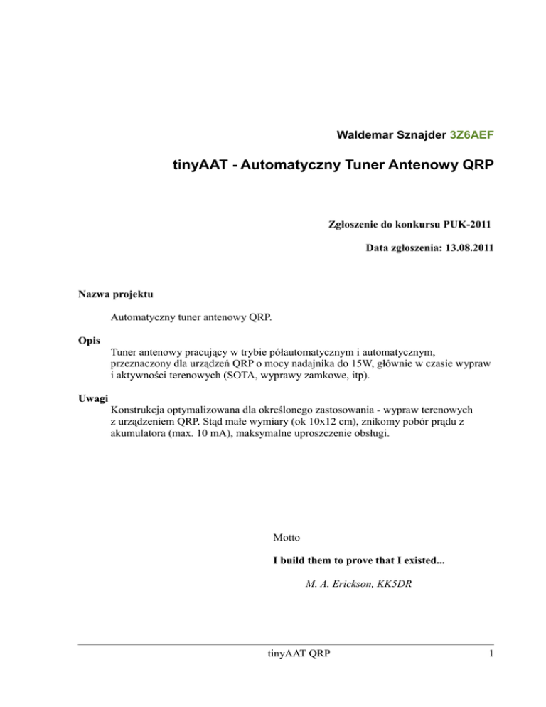 strojenia. Projekt został nazwany tinyAAT QRP i zgłoszony do konkursu PUK-2011.