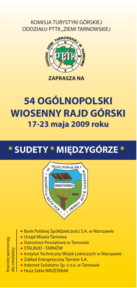 KOMISJA TURYSTYKI GÓRSKIEJ ODDZIAŁU PTTK „ZIEMI TARNOWSKIEJ ZAPRASZA NA 54 OGÓLNOPOLSKI WIOSENNY RAJD GÓRSKI 17-23 maja 2009 roku dla młodzieży: imprezę sponsorują * SUDETY * MIĘDZYGÓRZE * Bank Polskiej Spółdzielczości S.A. w Warszawie Urząd Miasta Tarnowa Starostwo Powiatowe w Tarnowie STALBUD - TARNÓW Instytut Techniczny Wojsk Lotniczych w Warszawie Zakład Energetyczny Tarnów S.A. Internet Solutions Sp. z o.o. w Tarnowie Huta Szkła WRZEŚNIAK POLSKIE TOWARZYSTWO TURYSTYCZNO - KRAJOZNAWCZE ODDZIAŁ „ZIEMI TARNOWSKIEJ” Biuro Oddzia³u czynne jest codziennie w nastêpuj¹cych godzinach: poniedzia³ek i czwartek 900-1300, 1700-2000 wtorek, roda, pi¹tek 900-1530 Polskie Towarzystwo Turystyczno-Krajoznawcze Oddzia³ Ziemi Tarnowskiej 33-100 Tarnów, ul. ¯ydowska 20 tel./fax: 014 622 22 00; 014 655 43 52 e-mail:[email protected] http://tarnow.pttk.pl REGULAMIN RAJDU UCZESTNICTWO 1. W Rajdzie mogą uczestniczyć drużyny: a) dorosłych (również turyści indywidualni). b) młodzieżowe, zgłoszone przez szkoły i organizacje młodzieżowe. Drużyny młodzieżowe mogą brać udział w Rajdzie pod opieką wyznaczonych przez Dyrekcję szkoły wychowawców (na 10 uczestników minimum l opiekun). 2. Uczestnicy biorą udział w Rajdzie na własną odpowiedzialność. 3. Obowiązek ubezpieczenia ciąży na uczestnikach, względnie organizacji zgłaszającej. 4. Kierownikiem drużyny winien być doświadczony turysta (ukończone 18 lat). 5. Każda drużyna winna posiadać apteczkę pierwszej pomocy, latarki, kompas i turystyczne mapy terenu. 6. Uczestnicy muszą posiadać ekwipunek przystosowany do wędrówek w trudnych wiosennych warunkach górskich. Opiekunowie wyznaczeni przez szkołę ponoszą pełną odpowiedzialność za właściwe wyposażenie młodzieży. 7. Każdy uczestnik Rajdu musi posiadać przy sobie ważny dokument potwierdzający tożsamość. OPŁATY Wpisowe TRASY I,II,V III, IV VI Młodzież 30 zł 120 zł 80 zł 80 zł Dorośli 60 zł 150 zł 100 zł - W Międzygórzu istnieje możliwość zarezerwowania dodatkowych noclegów w cenie 25 zł za dobę. Wpisowe łącznie z wpłatą na noclegi (wraz z kosztem noclegów dodatkowych) należy przekazać na konto PTTK: Oddział LUKAS BANK S.A. w Tarnowie 62 1940 1076 3028 5525 0000 0000, lub przekazem pocztowym na adres : Oddział PTTK ul. Żydowska 20. 33-100 Tarnów. Zgłoszenie nadesłane bez wpłat na noclegi lub z niepełnymi wpłatami będą zwracane. Właściciele kwater żądają pokrycia należności za wszystkie miejsca zarezerwowane ZGŁOSZENIA Zgłoszenia z podaniem trasy głównej i zastępczej należy przesłać na kartach zgłoszeń w nieprzekraczalnym terminie do dnia 17 kwietnia 2009 r. na adres: Oddział PTTK ul. Żydowska 20. 33-100 Tarnów (tel. 014 622 22 00 lub 014 6554352 lub 014 6554353). Wycofanie zgłoszenia na Rajd ze zwrotem wpłaty na noclegi może nastąpić pisemnie najpóźniej do dnia 30 kwietnia 2009 r. (po tym terminie wpisowe i wpłaty na noclegi nie będą zwracane). Ze względu na reorganizację PKP uczestnikom Rajdu zgodnie z zarządzeniem Dyrekcji PKP nie przysługują zniżki z tytułu uczestnictwa w Rajdzie. Karty zgłoszeń drużyn młodzieżowych bez potwierdzenia przez Dyrekcję szkoły nie będą przyjmowane. Kierownictwo Rajdu zapewnia: 1. Obsługę tras rajdowych. 2. Zarezerwowanie odpłatnych noclegów. 3. Odznakę rajdową i punkty GOT dla każdego uczestnika. 4. Na zakończenie Rajdu wspólną watrę 22 maja 2009 o godz. 19.00 w Międzygórzu - Fundusz Wczasów Pracowniczych, ul. Sanatoryjna 2. 5. W przypadku niesprzyjających warunków atmosferycznych Kierownictwo Rajdu zastrzega sobie prawo zmiany trasy, a nawet odwołania Rajdu. 6. O wyjściu na trasę zasadniczą (w przypadku trudnych warunków atmosferycznych) decyduje przewodnik trasy. Z turystycznym pozdrowieniem Komandor Rajdu JERZY MRÓZ Trasa I Miejsce zbiórki uczestników trasy – Zieleniec – Schronisko PTTK do godz. 12:00 17.05.2009 r. – Zieleniec (zn. zielone) – Rezerwat Torfowisko pod Zieleńcem – Rozdroże pod Bieśćcem (zn. niebieskie) – Schronisko Jagodna na Przełęczy Spalona. 5,40 godz. S – 14 18.05.2009 r. – Schronisko Jagodna na Przełęczy Spalona.(zn. niebieskie) – Jagodna – Przełęcz nad Porębą (Przejazd z Przełęczy nad Porębą do Wilkanowa pod Kościół) (zn. czerwone) – Marianówka – Schronisko na Iglicznej. 4,30 godz. S-14 i S-16 19.05.2009 – Schronisko na Iglicznej (zn. zielone) – Rozdroże pod Lesieńcem (zn. niebieskie) – Przełęcz .Puchaczówka (zn. czerwone)– Czarna Góra – Żmijowiec – Schronisko pod Śnieżnikiem 5,0 godz. S-16 20.05.2009 – Schronisko pod Śnieżnikiem (zn. zielone) – Mały Śnieżnik – Trójmorski Wierch – Przełęcz Jodłów (zn. czerwone) – Jodłów Ostoja (zn. niebieskie) – Schronisko pod Śnieżnikiem. 6,30 godz. S-16 21.05.2009 – Schronisko pod Śnieżnikiem (zn. zielone) – Śnieżnik – Schronisko pod Śnieżnikiem (zn. czerwone) – Międzygórze. 4,0 godz. S-16 22.05.2009 – Międzygórze (zn. zielone) – Rozdroże pod Żmijowcem (zn. niebieskie) – Międzygórze. 5,0 godz. S-16 23.05.2009 - Międzygórze (zn. czerwone) – Igliczna (zn. żółte) – Międzygórze. 2,30 godz. S-16 Razem punktów GOT - 136 Trasa II Miejsce zbiórki uczestników trasy – dworzec PKP w Lądku Zdroju do godz. 12:00 17.05.2009 – Lądek Zdrój (zn. żółte) – Przełęcz Lądecka (zn. zielone) – Zamek Karpień – Trojak (zn. niebieskie) – Lądek Zdrój. 5 godz. S – 17 18.05.2009 – Lądek Zdrój (zn. czerwone) – Orłowiec (zn. zielone) – Przełęcz Różaniec – Przełęcz Lądecka (zn. żółte) – Lądek Zdrój. 5 godz. S – 17 19.05.2009 - Lądek Zdrój – Kletno parking przejazd BUS -em: Kletno – Jaskinia Niedźwiedzia (zwiedzanie) (zn. żółte) – Schronisko pod Śnieżnikiem (zn. zielone) – Snieżnik - Schronisko pod Śnieżnikiem 3,40 godz. S-16 20.05.2009 – Schronisko pod Śn