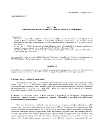 Łęka Opatowska 19 sierpnia 2013r. Nr BGK.6220.6.2013 DECYZJA o środowiskowych uwarunkowaniach zgody na realizację przedsięwzięcia Na podstawie: art. 71 ust. 1 i 2 , art. 72 ust. 1 pkt 3 i ust. 3, art. 75 ust. 1 pkt. 4, art. 84, art. 85 ust. 1 i ust. 2 pkt 2, art. 86 ustawy z dnia 3 października 2008r. o udostępnianiu informacji o środowisku i jego ochronie, udziale społeczeństwa w ochronie środowiska oraz o ocenach oddziaływania na środowisko (Dz. U. z 2008 Nr 199 poz. 1227 ze zm.), − § 3 ust 1 pkt 47 i 52 lit. a, Rozporządzenia Rady Ministrów z dnia 9 listopada 2010r. w sprawie przedsięwzięć mogących znacząco oddziaływać na środowisko (Dz. U. z 2010r. Nr 213, poz. 1397), − art. 104, art. 106 i art. 107 Kodeksu postępowania administracyjnego z dnia 14 czerwca z 1960r. (Dz. U. z 2000r. Nr 98, poz. 1071 ze zm.). − po rozparzeniu wniosku inwestora „Meble Marzenie” Węgłowski i Stryjakiewicz, Opatów ul. Bolesławiecka 14, 63-645 Łęka Opatowska i przeprowadzeniu postępowania w sprawie oceny oddziaływania na środowisko, OKREŚLAM środowiskowe uwarunkowania zgody na realizację przedsięwzięcia polegającego na budowie hali namiotowej magazynowej, na działkach nr ewid. 1186/3 i 1187/11 obręb geodezyjny Opatów, Gmina Łęka Opatowska. 1. Rodzaj i miejsce realizacji przedsięwzięcia: Przedsięwzięcie polegające na budowie hali namiotowej magazynowej, połoŜone będzie na terenie działek nr ewid. 1186/3 i 1187/11 w miejscowości Opatów (obręb geodezyjny Opatów), zgodnie z § 3 ust. 1 pkt 52 lit. a) rozporządzenia Rady Ministrów z dnia 9 listopada 2010 r. w sprawie przedsięwzięć mogących znacząco oddziaływać na środowisko (Dz. U. z 2010r. Nr 213 poz. 1397 z późn. zm.), zaliczane jest do przedsięwzięć mogących potencjalnie znacząco oddziaływać na środowisko. 2. Warunki wykorzystania terenu w fazie realizacji i eksploatacji, ze szczególnym uwzględnieniem konieczności ochrony wartości przyrodniczych, zasobów naturalnych i zabytków oraz ograniczenia uciąŜliwości dla terenów sąsiednich: Planowane przedsięwzięcie polegać będzie na rozbudowie istniejącego zakładu produkującego meble tapicerowane i materace o halę magazynową o powierzchni 525 m2. W planowanej hali magazynowane będą surowce do produkcji i gotowe produkty. Proces produkcyjny w istniejącym zakładzie polega na cięciu i montaŜu szkieletów meblowych, obróbce i przygotowaniu pianki poliuretanowej, krojeniu tkanin, przygotowaniu pokrowcy na meble tapicerowane oraz materace, przygotowaniu gotowych mebli i ich pakowaniu oraz załadunku. Cały zakład zajmuje powierzchnię około 2 ha. Po terenie istniejącego zakładu porusza się około 4 samochodów cięŜarowych dziennie. Zakład pracuje wyłącznie w porze dziennej. Inwestor w uzupełnieniu do karty informacyjnej przedsięwzięcia oświadczył, Ŝe planowana inwestycja nie spowoduje wzrostu zuŜycia materiałów do produkcji. Nie ulegnie zmianie równieŜ rodzaj oraz wielkość produkcji. − Powierzchnia działek na której planowane jest przedsięwzięcie to 10.000,00m2 i 7008,OOm2, − W chwili obecnej powierzchnia zabudowy zakładu produkcyjnego wynosi 429,90 m2, − Nowoprojektowana zabudowa zajmie dodatkową powierzchnię 525 m2, − wymiary projektowanego budynku 35,00 x 15,00 x 4,50 m, − wysokość w kalenicy 7,50 m. Hala namiotowa magazynowa słuŜyć będzie do magazynowania surowców do produkcji - pianki. a. Przewidywany rodzaj i technologia zabudowy dla planowanej inwestycji: W procesie produkcyjnym nie będą wykorzystywane lakiery. Zakład nie posiada równieŜ instalacji do impregnacji drewna. Do produkcji mebli wykorzystywane będą kleje wodne oraz kleje rozpuszczalnikowe w ilości około 200 kg miesięcznie. Realizacja inwestycji nie będzie wiązać się z powstaniem nowych źródeł emisji substancji do powietrza, gdyŜ nowa hala magazynowa nie będzie ogrzewana. W związku z powyŜszym naleŜy stwierdzić, iŜ oddziaływanie planowanego przedsięwzięcia nie będzie miało znaczącego wpływu na stan powietrza w rejonie inwestycji. Uwzględniając zapisy art. 63 ust. 2 pkt 2 lit. e ustawy o udostępnianiu informacji o środowisku i jego ochronie, udziale społeczeństwa w ochronie środowiska oraz o ocenach oddziaływania na środowisko stwierdzono, Ŝe teren planowanej inwestycji połoŜony jest na obszarze chronionego krajobrazu o nazwie Dolina rzeki Prosny, który obecnie nie posiada obowiązujących zakazów. NajbliŜej połoŜonym obszarem Natura 2000 jest obszar mający znaczenie dla Wspólnoty Baranów PLH300035, oddalony o około 14 km. 3. Wymagania dotyczące ochrony środowiska konieczne do uwzględnienia w projekcie budowlanym: Rozwiązanie tematu ochrony środowiska będzie następowało przez: a). prace przy budowie wykonywane będą zgodnie z przepisami BHP i kodeksu pracy, b). budynki zlokalizowane będą zgodnie z przepisami Prawa Budowlanego, c). materiały i urządzenia wymagane dla danego przedsięwzięcia wykonane będą w technologii chroniącej środowisko i zdrowie ludzi, d). biorąc pod uwagę zapisy art. 63 ust. l pkt 2 lit. a, c i d ustawy o udostępnianiu informacji o środowisku i jego ochronie, udziale społeczeństwa w ochronie środowiska oraz o ocenach oddziaływania na środowisko, ze względu na lokalizację oraz skalę i charakter przedsięwzięcia stwierdzono, Ŝe nie będzie ono negatywnie oddziaływać na obszary wodno-błotne oraz inne obszary o płytkim zaleganiu wód podziemnych, obszary leśne oraz obszary objęte ochroną, w tym strefy ochronne ujęć wód i obszary ochronne zbiorników wód śródlądowych. e). uwzględniając zapisy art. 63 ust. l pkt l lit. b ww. ustawy stwierdzono, iŜ ze względu na skalę i rodzaj inwestycji w fazie eksploatacji nie będzie dochodzić do kumulowania się oddziaływań planowanego przedsięwzięcia z oddziaływaniem innych przedsięwzięć. f). w związku z realizacją przedmiotowego przed