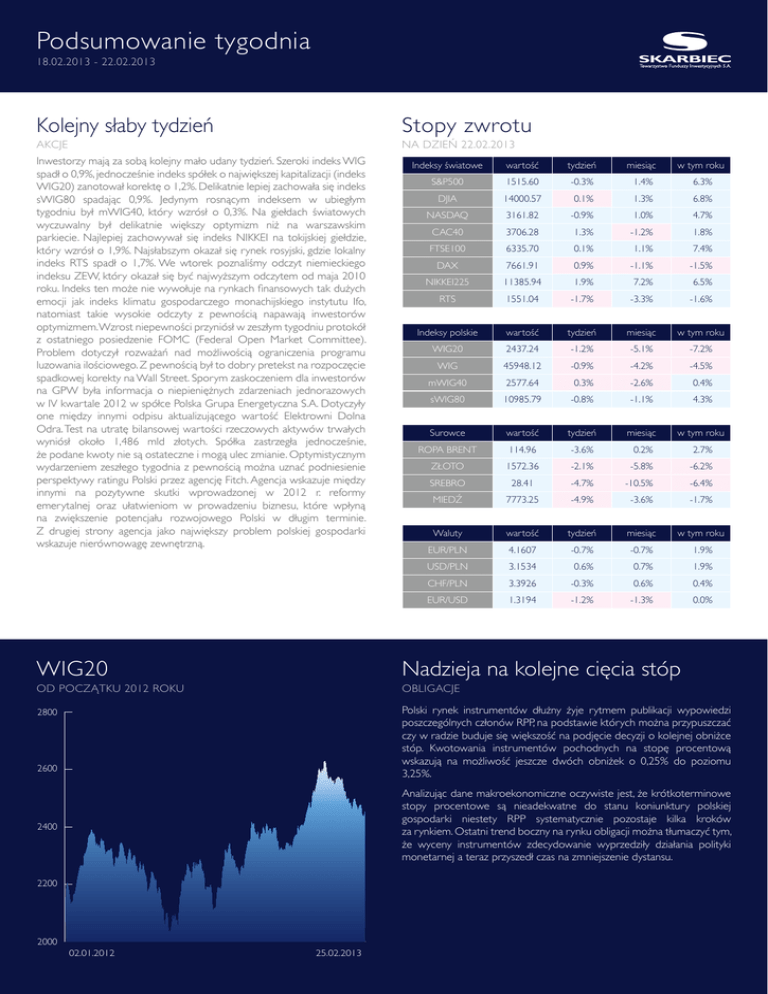 Podsumowanie tygodnia 18.02.2013 - 22.02.2013 Kolejny słaby tydzień Stopy zwrotu AKCJE NA DZIEŃ 22.02.2013 Inwestorzy mają za sobą kolejny mało udany tydzień. Szeroki indeks WIG spadł o 0,9%, jednocześnie indeks spółek o największej kapitalizacji (indeks WIG20) zanotował korektę o 1,2%. Delikatnie lepiej zachowała się indeks sWIG80 spadając 0,9%. Jedynym rosnącym indeksem w ubiegłym tygodniu był mWIG40, który wzrósł o 0,3%. Na giełdach światowych wyczuwalny był delikatnie większy optymizm niż na warszawskim parkiecie. Najlepiej zachowywał się indeks NIKKEI na tokijskiej giełdzie, który wzrósł o 1,9%. Najsłabszym okazał się rynek rosyjski, gdzie lokalny indeks RTS spadł o 1,7%. We wtorek poznaliśmy odczyt niemieckiego indeksu ZEW, który okazał się być najwyższym odczytem od maja 2010 roku. Indeks ten może nie wywołuje na rynkach finansowych tak dużych emocji jak indeks klimatu gospodarczego monachijskiego instytutu Ifo, natomiast takie wysokie odczyty z pewnością napawają inwestorów optymizmem. Wzrost niepewności przyniósł w zeszłym tygodniu protokół z ostatniego posiedzenie FOMC (Federal Open Market Committee). Problem dotyczył rozważań nad możliwością ograniczenia programu luzowania ilościowego. Z pewnością był to dobry pretekst na rozpoczęcie spadkowej korekty na Wall Street. Sporym zaskoczeniem dla inwestorów na GPW była informacja o niepieniężnych zdarzeniach jednorazowych w IV kwartale 2012 w spółce Polska Grupa Energetyczna S.A. Dotyczyły one między innymi odpisu aktualizującego wartość Elektrowni Dolna Odra. Test na utratę bilansowej wartości rzeczowych aktywów trwałych wyniósł około 1,486 mld złotych. Spółka zastrzegła jednocześnie, że podane kwoty nie są ostateczne i mogą ulec zmianie. Optymistycznym wydarzeniem zeszłego tygodnia z pewnością można uznać podniesienie perspektywy ratingu Polski przez agencję Fitch. Agencja wskazuje między innymi na pozytywne skutki wprowadzonej w 2012 r. reformy emerytalnej oraz ułatwieniom w prowadzeniu biznesu, które wpłyną na zwiększenie potencjału rozwojowego Polski w długim terminie. Z drugiej strony agencja jako największy problem polskiej gospodarki wskazuje nierównowagę zewnętrzną. Indeksy światowe wartość tydzień miesiąc w tym roku S&P500 1515.60 -0.3% 1.4% 6.3% DJIA 14000.57 0.1% 1.3% 6.8% NASDAQ 3161.82 -0.9% 1.0% 4.7% CAC40 3706.28 1.3% -1.2% 1.8% FTSE100 6335.70 0.1% 1.1% 7.4% DAX 7661.91 0.9% -1.1% -1.5% NIKKEI225 11385.94 1.9% 7.2% 6.5% RTS 1551.04 -1.7% -3.3% -1.6% Indeksy polskie wartość tydzień miesiąc w tym roku WIG20 2437.24 -1.2% -5.1% -7.2% WIG 45948.12 -0.9% -4.2% -4.5% mWIG40 2577.64 0.3% -2.6% 0.4% sWIG80 10985.79 -0.8% -1.1% 4.3% Surowce wartość tydzień miesiąc w tym roku ROPA BRENT 114.96 -3.6% 0.2% 2.7% ZŁOTO 1572.36 -2.1% -5.8% -6.2% SREBRO 28.41 -4.7% -10.5% -6.4% MIEDŹ 7773.25 -4.9% -3.6% -1.7% Waluty wartość tydzień miesiąc w tym roku EUR/PLN 4.1607 -0.7% -0.7% 1.9% USD/PLN 3.1534 0.6% 0.7% 1.9% CHF/PLN 3.3926 -0.3% 0.6% 0.4% EUR/USD 1.3194 -1.2% -1.3% 0.0% WIG20 Nadzieja na kolejne cięcia stóp OD POCZĄTKU 2012 ROKU OBLIGACJE 2800 Polski rynek instrumentów dłużny żyje rytmem publikacji wypowiedzi poszczególnych członów RPP, na podstawie których można przypuszczać czy w radzie buduje się większość na podjęcie decyzji o kolejnej obniżce stóp. Kwotowania instrumentów pochodnych na stopę procentową wskazują na możliwość jeszcze dwóch obniżek o 0,25% do poziomu 3,25%. 2600 Analizując dane makroekonomiczne oczywiste jest, że krótkoterminowe stopy procentowe są nieadekwatne do stanu koniunktury polskiej gospodarki niestety RPP systematycznie pozostaje kilka kroków za rynkiem. Ostatni trend boczny na rynku obligacji można tłumaczyć tym, że wyceny instrumentów zdecydowanie wyprzedziły działania polityki monetarnej a teraz przyszedł czas na zmniejszenie dystansu. 2400 2200 2000 02.01.2012 25.02.2013 Podsumowanie tygodnia 18.02.2013 - 22.02.2013 Fala spadków Na dobry początek SUROWCE OTOCZENIE MAKROEKONOMICZNE W ubiegłym tygodniu przez rynki surowców przetoczyła się fala spadków, spowodowana spekulacjami odnośnie zakończenia luzowania ilościowego polityki monetarnej przez Fed oraz zapowiedziami dalszego chłodzenia rynku nieruchomości w Chinach. Indeks Reuters Jefferies CRB spadł o 1,65% po przecenie 15 z 19 komponentów, wchodzących w skład indeksu. Tym samym od początku roku indeks znalazł się 0,6% pod kreską. Mocno potaniały metale bazowe tracąc ponad 5%. Cena ropy WTI spadła do poziomów z początku roku - w piątek na zamknięciu za baryłkę płacono niewiele ponad 93 USD (-3,4%). Potaniała również europejska ropa Brent (-3,5%, 113,5 USD/brl). Spadły również ceny benzyny i oleju opałowego, notowane na nowojorskim rynku. Mocny spadek zanotowały kruszce. Za uncje złota płacono 1572 USD(-2,3%), srebro potaniało o 4,6%, spadły również ceny platyny (-4%) i palladu (-2,2%). Potaniały również surowce rolne jak pszenica (-4%) i kukurydza (-1,8%). Ponad 2% wzrosły natomiast ceny soi, kawy i cukru. Miniony tydzień można zaliczyć do umiarkowanie udanych jeśli chodzi o dane z polskiej gospodarki. Rozpoczął się dość nieprzyjemną informacją na temat zatrudnienia i płac w przemyśle. Roczne tempo wzrostu wynagrodzeń wyniosło w styczniu zaledwie 0,4%, mimo że oczekiwano wzrostu o 1%, a jeszcze w grudniu 2012 było to +2,4%. Biorąc pod uwagę inflację w tym okresie, przeciętne wynagrodzenie zmniejszyło się w ciągu ostatnich 12 miesięcy o 1,3% ujmując rzecz realnie. Spadło także zatrudnienia. Styczniowa roczna dynamika wyniosła -0,8%, wobec oczekiwanych -0,9%. Było więc lepiej, niż przewidywali analitycy, ale gorzej niż miesiąc wcześniej, kiedy zatrudnienie spadło o 0,5%. Jeśli złożymy te dwie dane, to okaże się że fundusz płac nominalnie spadł o 0,4% zaś realnie stracił ponad 2%. Wzrost