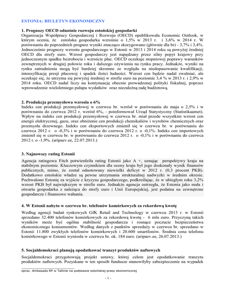 ESTONIA: BIULETYN EKONOMICZNY 1. Prognozy OECD odnośnie rozwoju estońskiej gospodarki Organizacja Współpracy Gospodarczej i Rozwoju (OECD) opublikowała Economic Outlook, w którym ocenia, że estońska gospodarka wzrośnie o 1,5% w 2013 r. i 3,6% w 2014 r. W porównaniu do poprzednich prognoz wyniki znacząco skorygowano (głównie dla br) - 3,7% i 3,4%. Jednocześnie prognozy wzrostu gospodarczego w Estonii w 2013 i 2014 roku są powyżej średniej OECD dla strefy euro. Wzrost gospodarczy jest napędzany przez silny popyt krajowy przy jednoczesnym spadku bezrobocia i wzroście płac. OECD oczekuje stopniowej poprawy warunków zewnętrznych w drugiej połowie roku i dalszego ożywienia na rynku pracy. Jednakże, wyniki na rynku zatrudnienia mogą być bardziej skromne ze względu na niedopasowanie kwalifikacji, intensyfikację presji płacowej i spadek ilości ludności. Wzrost cen będzie nadal zwalniać, ale oczekuje się, że utrzyma się powyżej średniej w strefie euro na poziomie 3,4 % w 2013 r. i 2,9% w 2014 roku. OECD nadal liczy na kontynuację obecnie prowadzonej polityki fiskalnej, poprzez wprowadzenie wieloletniego pułapu wydatków oraz niezależną radę budżetową. 2. Produkcja przemysłowa wzrosła o 6% Indeks cen produkcji przemysłowej w czerwcu br. wzrósł w porównaniu do maja o 2,5% i w porównaniu do czerwca 2012 r. wzrósł 6%, - poinformował Urząd Statystyczny (Statistikaamet). Wpływ na indeks cen produkcji przemysłowej w czerwcu br. miał przede wszystkim wzrost cen energii elektrycznej, gazu, oraz obniżenie cen produkcji chemikaliów i wyrobów chemicznych oraz przemysłu drzewnego. Indeks cen eksportowych zmienił się w czerwcu br. w porównaniu do czerwca 2012 r. o -0,3% i w porównaniu do czerwca 2012 r. o -0,1%. Indeks cen importowych zmienił się w czerwcu br. w porównaniu do czerwca 2012 r. o -0,1% i w porównaniu do czerwca 2012 r. o -1,9%. (aripaev.ee, 22.07.2013.) 3. Najnowszy rating Estonii Agencja ratingowa Fitch potwierdziła rating Estonii jako A +, uznając perspektywy kraju na stabilnym poziomie. Kluczowym czynnikiem dla oceny kraju był jego doskonały wynik finansów publicznych, mimo, że został odnotowany niewielki deficyt w 2012 r. (0,3 procent PKB). Dodatkowo estońskie władze są pewne utrzymania strukturalnej nadwyżki w średnim okresie. Pochwalono Estonię za wyjście z kryzysu gospodarczego, podkreślając, że w ubiegłym roku 3,2% wzrost PKB był największym w strefie euro. Jednakże agencja ostrzegła, że Estonia jako mała i otwarta gospodarka z należąca do strefy euro i Unii Europejskiej, jest podatna na zewnętrzne gospodarcze i finansowe wahania. 4. W Estonii nabyto w czerwcu br. telefonów komórkowych za rekordową kwotę Według agencji badań rynkowych GfK Retail and Technology w czerwcu 2013 r. w Estonii sprzedano 32.400 telefonów komórkowych za rekordową kwotę - 6 mln euro. Przyczyną takich wyników może być ogólna stabilność gospodarcza i rosnące poczucie bezpieczeństwa ekonomicznego konsumentów. Według danych z punktów sprzedaży w czerwcu br. sprzedano w Estonii 11.800 zwykłych telefonów komórkowych i 20.600 smartfonów. Średnia cena telefonu komórkowego w Estonii wyniosła w czerwcu br. ok. 184 euro. (aripaev.ee, 26.07.2013.) 5. Socjaldemokraci planują opodatkować tranzyt produktów naftowych Socjaldemokraci przygotowują projekt ustawy, której celem jest opodatkowanie tranzytu produktów naftowych. Pozyskane w ten sposób fundusze stanowiłyby zabezpieczenie na wypadek ______________________ oprac. Ambasada RP w Tallinie na podstawie estońskiej prasy ekonomicznej -1- konieczności usunięcia skutków zanieczyszczenia wody morskiej w wyniku katastrof statków przewożących tego rodzaju produkty. Zdaniem wiceprezesa Komisji ds. Środowiska Riigikogu Karela Rüütli, państwo estońskie nie jest przygotowane do ewentualnego wypadku z ropą naftową na Bałtyku i rozwiązaniem byłby tzw. fundusz zanieczyszczeń. Środki zostałyby przeznaczone na organizację działań profilaktycznych i zakup odpowiedniego sprzętu do usuwania skutków katastrof środowiskowych. Pomysł utworzenia funduszu powstał w 2006 r., kiedy w wyniku katastrofy morskiej na estońskim wybrzeżu zginęły dziesiątki tysięcy ptaków. (aripaev.ee, 25.07.2013.) 6. Ligi: najważniejszą przyczyną wzrostu cen jest otwarcie rynku energii elektrycznej Minister Finansów Jürgen Ligi powiedział, że przyczyną wysokiej inflacji w Estonii jest przede wszystkim otwarta gospodarka i otwarcie rynku energii elektrycznej. Ligi wyraził opinię, że państwo zrobiło wszystko co możliwe dla utworzenia w pełni otwartej gospodarki: wspomogło powstanie sprzyjających warunków dla konkurencji, przygotowało zrównoważony budżet oraz uchwaliło odpowiednie prawodawstwo. Jednakże po otwarciu rynku elektrycznego wyjaśniło się, że estoński rynek nie działa wystarczająco dobrze, co stało się czynnikiem wzrostu inflacji. Inflacja w Estonii jest większa niż średnia w strefie euro – w czerwcu inflacja wyniosła 4,1%. (err.ee, 18.07.2013.) 7. Projekt Rail Baltica coraz bardziej realny Komisarz UE ds. Transportu Siim Kallas powiedział, że realizacja projektu Rail Baltica jest coraz bardziej realna. Dofinansowanie tego projektu przez UE w wysokości 85% wartości jest bardzo wysokie co czyni go szczególnie ważnym dla KE. Komisarz ma nadzieję, że trzy państwa bałtyckie osiągną w końcu porozumienie co do modelu spółki zarządzającej realizacją projektu. W ubiegłym tygodniu Litwa dała do zrozumienia, że zamierza poprzeć utworzenie w tym celu spółki typu j.v. Według Komisarza utworzenie takiej spółki jest konieczne dla ubiegania się o dofinansowanie RB ze środków unijnych. Estoński europoseł Vilja Savisaar-Toomast uważa, że litewska decyzja została podjęta pod naciskiem KE. Litwa także zgodziła się aby siedziba nowego j.v. mieściła się w Rydze. Taką informację przekazało