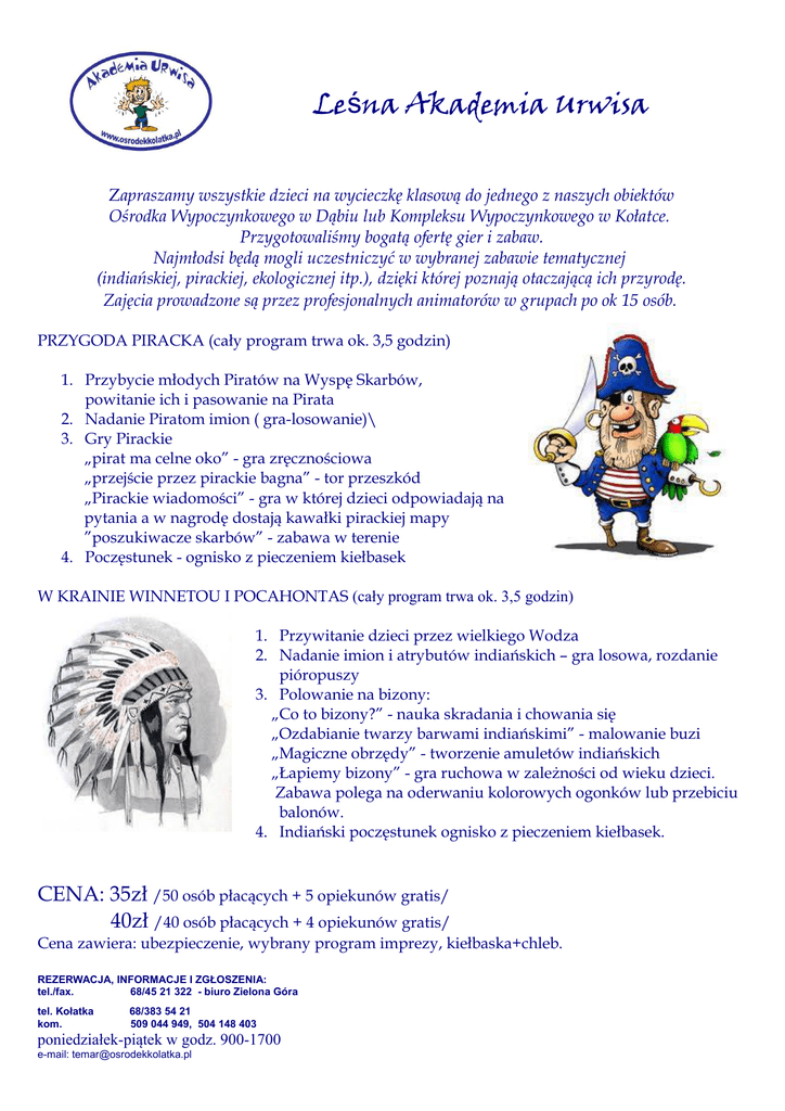 Leśna Akademia Urwisa Zapraszamy wszystkie dzieci na wycieczkę klasową do jednego z naszych obiektów Ośrodka Wypoczynkowego w Dąbiu lub Kompleksu Wypoczynkowego w Kołatce. Przygotowaliśmy bogatą ofertę gier i zabaw. Najmłodsi będą mogli uczestniczyć w wybranej zabawie tematycznej (indiańskiej, pirackiej, ekologicznej itp.), dzięki której poznają otaczającą ich przyrodę. Zajęcia prowadzone są przez profesjonalnych animatorów w grupach po ok 15 osób. PRZYGODA PIRACKA (cały program trwa ok. 3,5 godzin) 1. Przybycie młodych Piratów na Wyspę Skarbów, powitanie ich i pasowanie na Pirata 2. Nadanie Piratom imion ( gra-losowanie)\ 3. Gry Pirackie „pirat ma celne oko” - gra zręcznościowa „przejście przez pirackie bagna” - tor przeszkód „Pirackie wiadomości” - gra w której dzieci odpowiadają na pytania a w nagrodę dostają kawałki pirackiej mapy ”poszukiwacze skarbów” - zabawa w terenie 4. Poczęstunek - ognisko z pieczeniem kiełbasek W KRAINIE WINNETOU I POCAHONTAS (cały program trwa ok. 3,5 godzin) 1. Przywitanie dzieci przez wielkiego Wodza 2. Nadanie imion i atrybutów indiańskich – gra losowa, rozdanie pióropuszy 3. Polowanie na bizony: „Co to bizony?” - nauka skradania i chowania się „Ozdabianie twarzy barwami indiańskimi” - malowanie buzi „Magiczne obrzędy” - tworzenie amuletów indiańskich „Łapiemy bizony” - gra ruchowa w zależności od wieku dzieci. Zabawa polega na oderwaniu kolorowych ogonków lub przebiciu balonów. 4. Indiański poczęstunek ognisko z pieczeniem kiełbasek. CENA: 35zł /50 osób płacących + 5 opiekunów gratis/ 40zł /40 osób płacących + 4 opiekunów gratis/ Cena zawiera: ubezpieczenie, wybrany program imprezy, kiełbaska+chleb. REZERWACJA, INFORMACJE I ZGŁOSZENIA: tel./fax. 68/45 21 322 - biuro Zielona Góra tel. Kołatka kom. 68/383 54 21 509 044 949, 504 148 403 poniedziałek-piątek w godz. 900-1700 e-mail: [email protected]