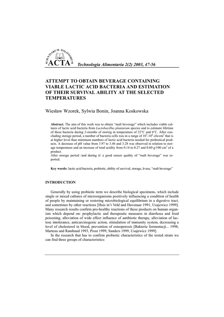 TI SCIEN RUM NO UM POLO AR ACTA Technologia Alimentaria 2(2) 2003, 47-56 ATTEMPT TO OBTAIN BEVERAGE CONTAINING VIABLE LACTIC ACID BACTERIA AND ESTIMATION OF THEIR SURVIVAL ABILITY AT THE SELECTED TEMPERATURES Wiesław Wzorek, Sylwia Bonin, Joanna Koskowska Abstract. The aim of this work was to obtain “malt beverage” which includes viable cultures of lactic acid bacteria from Lactobacillus plantarum species and to estimate lifetime of these bacteria during 2-months of storing in temperature of 22°C and 6°C. After concluding storage period, a number of bacteria cells was in a range of 107-108 cfu/cm3 that is at higher level than minimum numbers of lactic acid bacteria needed for probiotical products. A decrease of pH value from 3.97 to 3.46 and 3.28 was observed in relation to storage temperature and an increase of total acidity from 0.14 to 0.27 and 0.60 g/100 cm3 of a product. After storage period /and during it/ a good sensor quality of “malt beverage” was reported. Key words: lactic acid bacteria, probiotic, ability of survival, storage, kvass, “malt beverage” INTRODUCTION Generally by using probiotic term we describe biological specimens, which include single or mixed cultures of microorganisms positively influencing a condition of health of people by maintaining or restoring microbiological equilibrium in a digestive tract, and sometimes by other reactions [Huis in’t Veld and Havenaar 1991, Usajewicz 1999]. Many research results confirm pro-healthy reactions of these products on human organism which depend on: prophylactic and therapeutic measures in diarrhoea and food poisoning, alleviation of wide effect influence of antibiotic therapy, alleviation of lactose intolerance, anticarcinogenic action, stimulation of immunity system, decreasing a level of cholesterol in blood, prevention of osteoporosis [Bakterie fermentacji... 1998, Marteau and Rambaud 1993, Prost 1999, Sanders 1999, Usajewicz 1999]. In the research that has to confirm probiotic characteristics of the tested strain we can find three groups of characteristics: 48 W. Wzorek ... – general requirements, i.e. origin, safety, resistance to low pH, bile acids and gastric juices, – functional aspects, i.e. ability of adherence to intestinal epithelium, antagonism to pathogens, – technological requirements this means survival ability, activity in technological processes [Probiotyki 2002]. Probiotic specimens include viable cells of microorganisms, generally lactic acid bacteria of genera Lactobacillus, Bifidobacterium and Streptococcus, and also yeast Saccharomyces cerevisiae, Torulopsis [Grzybowski et al. 1997, O’Sullivan et al. 1992]. Most available food probiotic products on the market are fermented dairy beverages which include live cultures of lactic acid bacteria. Milk diet normally is not a base of food for adult, and what is more some people suffer from lactose intolerance or allergy to milk protein. In most cases these are vegetable products therefore technologists try to enlarge products range which include lactic acid bacteria with such products as salads, juices or other obtained from vegetable raw materials [Lee and Salminen 1995, Łaniewska-Moroz et al. 1996]. Especially, we have to consider selected species of Lactobacillus genus, which live in vegetable habitat, they are used in souring of vegetable products [Daeschel and Nes 1994, Krawczyk 1987, Łaniewska-Moroz and Roczniakowa 1993]. Bacteria belonging to Lactobacillus plantarum have good technological and health properties (among them there is resistance to low pH and high acidity, production ability of bacteriocins, safety of use, and some strains were isolated from the human oral cavity and intestinal tract) [Daeschel and Nes 1994, Molin 1998]. The product, which is of vegetable origin and provides a consumer with lactic acid bacteria, seems to be kvass or a beverage of similar type. Kvass is popular in the countries of the former Soviet Union. Kvass is produced from wort or its concentrate, obtained from special rye-malt, barley-malt, rye-flour, sugar and other taste additions. This product undergoes previous limited alcoholic and lactic acid fermentation and includes viable lactic acid bacteria. Bacterial mixture composition used for inoculation is not given. It is sold from barrel trucks and its stability is of 2 to 3 days. Kvass sold in bottles is not produced by fermentation method and does not have lactic acid bacteria, but always contains citric acid and preservatives [Kovalski 1997]. In this work we tried to determine survival ability of lactic acid bacteria during beverage storing with characteristics similar to kvass, which is further on called “malt beverage”. We wanted to answer if produced beverage with viable lactic acid bacteria may have considerably long (in industry scale) period of validity for consumption and such a number of bacteria that it is possible to fulfil condition for products indexed with “bio”prefix. We also searched for changes of chosen chemical components during the process. In experiments, we used “malt beverage” (not kvass) because of simplified technology of its preparation (for example from a concentrate of malt wort). MATERIALS AND METHODS In the research we used lactic acid bacteria: – Lactobacillus plantarum 44 strain from Department of Biotechnology and Food Microbiology, SGGW, Acta Sci. Pol. Attempt to obtain beverage containing ... 49 – Lactobacillus plantarum 299 v isolated from ProViva beverage (Skane Dairy – Sweden). Experiment was carried out using “malt beverage wort” obtained by dissolution and mixing in ratio used in initial tests of the following components: consumption sugar, industrial malt concentrate (produced by Wytwórnia Ekstraktu Słodowego Wolsztyn), caramel, citric acid and mint oil. Initially wort was soured by citric acid to limit possibilities of sporeforming bacteria development. This wort indicated about 11% of extract and total acidity of 0.14 g/
