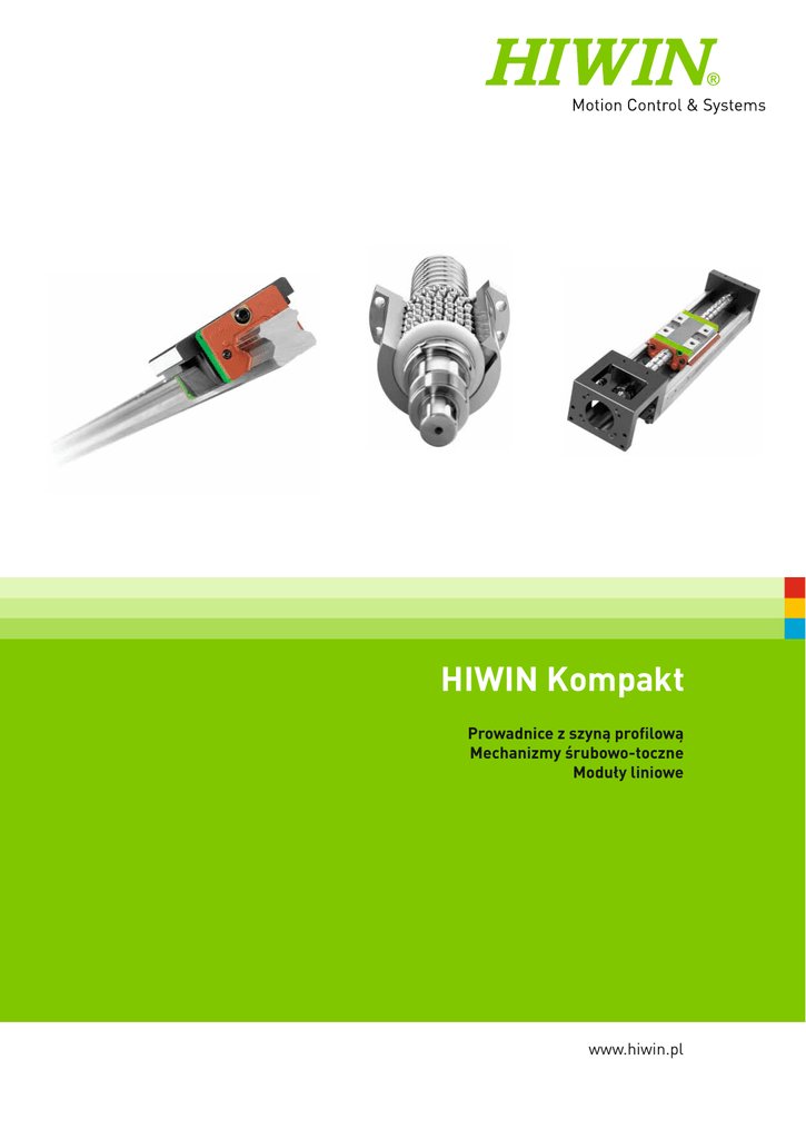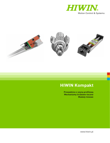 HIWIN Kompakt Prowadnice z szyną profilową Mechanizmy śrubowo-toczne Moduły liniowe www.hiwin.pl HIWIN GmbH Brücklesbünd 2 D-77654 Offenburg Telefon +49 (0) 7 81 9 32 78 - 0 Telefax +49 (0) 7 81 9 32 78 - 90 [email protected] www.hiwin.de Wszelkie prawa zastrzeżone. Przedruk, także we fragmentach, bez zezwolenia jest zabroniony. Uwaga: Dane techniczne w tym katalogu mogą ulec zmianie bez uprzedzenia Witamy w firmie HIWIN Firma HIWIN oferuje pełny asortyment produktów w zakresie techniki liniowej. W naszym Katalogu Kompakt przedstawiamy skrótowe zestawienie naszego standardowego programu produktów dostarczanych bezpośrednio z magazynu. HIWIN Kompakt Spis treści 1. Prowadnice liniowe z szyną profilową 2 1.1 1.2 1.3 1.4 Prowadnica z szyną profilowaną – Seria HG / EG Prowadnica z szyną profilowaną – Seria Q1 Prowadnica z szyną profilowaną – Seria MG Prowadnica z szyną profilowaną – Seria RG 4 25 32 40 2. Mechanizmy śrubowo-toczne 54 2.1 2.2 2.3 2.4 2.5 2.6 2.7 2.8 Nakrętka pojedyncza wg. DIN Nakrętka pojedyncza cylindryczna Nakrętka pojedyncza DIN DEB Nakrętka podwójna DIN DDB Cylindryczna nakrętka pojedyncza ZE Cylindryczna nakrętka podwójna ZD Końcówki wrzecion i konfiguracja łożysk Akcesoria 56 57 58 59 60 61 62 63 3. Systemy pozycjonowania 68 3.1 3.2 3.3 3.4 Zestawienie produktów Moduły liniowe Kody zamówień dla modułów liniowych Moduły liniowe KK – Dane techniczne Akcesoria 70 71 72 97 Prowadnice z szyną profilową 2 Prowadnica z szyną profilową umożliwia liniowe przemieszczanie za pomocą łożyskowania kulkowego. Niezwykle precyzyjny ruch liniowy prowadnicy umożliwiają kulki łożyskowe znajdujące się pomiędzy szyną a wózkiem. Łożyskowanie w takiej prowadnicy wykazuje 50-krotnie mniejszy współczynnik tarcia niż w wypadku prowadnic z prowadzeniem ślizgowym. Dzięki wymuszonemu prowadzeniu wózka na sznie, prowadnice liniowe z szyną profilową mogą przenosić obciążenia zarówno w poziomie, jak i w pionie. 3 Prowadnice z szyną profilową Seria HG, EG 1.1 Prowadnice szynowe serii HG / EG 1.1.1 Szczególne właściwości prowadnic liniowych z szyną profilową seria HG i EG 1.1.3 Numery artykułu serii HG Prowadnice z szyną profilową firmy HIWIN serii HG/EG przeznaczone s do niezwykle dużych obciążeń, posiadają cztery bieżnie toczne i przygotowane zostały do obciążeń i sztywności o 30 % wyższej niż dla innych podobnych produktów. Uzyskano to dzięki optymalizacji bieżni obiegowej i jej budowy. Łatwe przemieszanie się całego układu zapewnia zoptymalizowany układ obiegowy Prowadnice z szyną profilowaną serii HG dzielą się na modele wymienialne i niewymienialne. Wymiary obu modeli są jednakowe. Najważniejsza różnica polega na tym, że w wypadku modeli wymienialnych można dowolnie wymieniać wózek i szyny profilowe; Ich dokładność sięga klasy P. W związku z surową kontrolą dokładności wymiarowej modele z wymienialnymi elementami naj-lepiej nadają się dla klientów, którzy nie stosują prowadnic z szyną profilową parami na jednej osi. Numery artykułów serii obejmują wymiary, model, klasę dokładności, naprężenie wstępne itd. Ograniczniki zapobiegają wypadaniu kulek, w szczególności wtedy kiedy w czasie montażu wózek zdejmowany jest z szyny profilowej. 1.1.2 Budowa prowadnic serii Hg i Eg Wózek Szyna profilowa System przekierowania Uszczelka zamykająca Końcówka smarownicza Uszczelka dolna Kulki Zaślepka System obiegowy: wózek, szyna profilowa, system przekierowania i ograniczniki kulek Układ smarowania: końcówka smarownicza; opcjonalnie: łącznik smarowniczy Zabezpieczenie przeciwpyłowe: uszczelka zamykająca, uszczelka dolna, Zaślepka; opcjonalnie: podwójne uszczelki, zbierak metalowy (patrz rozdział 1.1.9) 4 Ograniczniki kulek I. Modele niewymienialne (dopasowywane według życzenia klienta) G W 25 C C 2 R 1600 ZA H 2 DD E2 E2: wykonanie ze zbiornikiem oleju SE: metalowy system przekierowania Seria HG i EG Wykonanie W: wózek z kołnierzem H: wysoka budowa wózka L: niska budowa wózka Zabezpieczenie przeciwpyłowe2) Liczba szyn na oś1) Wielkość 15, 20, 25, 30, 35, 45, 55, 65 Klasa dokładności: C, H, P, SP, UP Klasa obciążeniowa S: średnie obciążenie C: duże obciążenie H: bardzo duże obciążenie Oznaczenie naprężenia wstępnego: ZO, ZA, ZB Długość szyny profilowej [mm] Sposób mocowania wózka A: z góry C: z góry i z dołu liczba wózków na szynę profilową Mocowanie szyny profilowej R: z góry T: z dołu U: z góry za pomocą większego otworu montażowego (EG15 / EG30) II. Modele wymienialne Numer artykułu wózka HG / EG G W 25 C C ZA H ZZ E2 Seria HG i EG E2: wykonanie ze zbiornikiem oleju SE: metalowy system przekierowania Wykonanie W: wózek z kołnierzem H: wysoka budowa wózka L: niska budowa wózka Zabezpieczenie przeciwpyłowe2) Klasa dokładności: C, H, P Oznaczenie naprężenia wstępnego: ZO, ZA Wielkość 15, 20, 25, 30, 35, 45, 55, 65 Klasa obciążeniowa S: średnie obciążenie C: duże obciążenie H: bardzo duże obciążenie Sposób mocowania wózka A: z góry C: z góry i z dołu Numer artykułu szyny profilowej HG / EG G R 25 R 1200 H Klasa dokładności: C, H, P Seria HG i EG Długość szyny profilowej [mm] Szyna profilowa Wielkość 15, 20, 25, 30, 35, 45, 55, 65 Mocowanie szyny profilowej R: z góry T: z dołu Z: dla połączenia gwintowego z prowadnicą zębatkową 90° (tylko seria HG) Uwaga: 1) Cyfra 2 oznacza również ilość, tzn. jedna sztuka wyżej podanego artykułu składa się z pary szyn. W wypadku pojedynczych szyn nie podaje się żadnej cyfry. 2) Przy ochronie przeciwpyłowej brak wartości oznacza wykonanie standardowe (uszczelka zamykająca i uszczelka dolna) ZZ: uszczelka zamykająca, uszczelka dolna i zbierak KK: podwójne uszczelki, uszczelka dolna i zbierak DD: podwójne uszczelki i uszczelka dolna 5 Prowadnice z szyną profilową Seria HG, EG 1.1.4 Modele I. Wykonania wózk