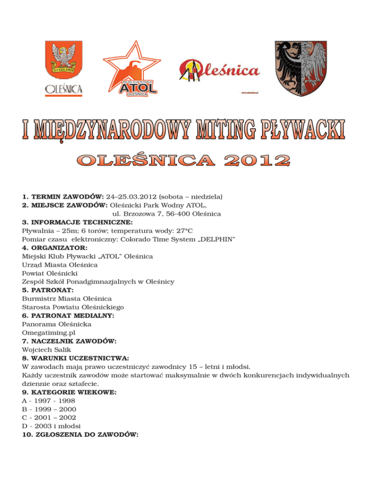 1. TERMIN ZAWODÓW: 24–25.03.2012 (sobota – niedziela) 2. MIEJSCE ZAWODÓW: Oleśnicki Park Wodny ATOL, ul. Brzozowa 7, 56-400 Oleśnica 3. INFORMACJE TECHNICZNE: Pływalnia – 25m; 6 torów; temperatura wody: 27°C Pomiar czasu elektroniczny: Colorado Time System „DELPHIN” 4. ORGANIZATOR: Miejski Klub Pływacki „ATOL” Oleśnica Urząd Miasta Oleśnica Powiat Oleśnicki Zespół Szkół Ponadgimnazjalnych w Oleśnicy 5. PATRONAT: Burmistrz Miasta Oleśnica Starosta Powiatu Oleśnickiego 6. PATRONAT MEDIALNY: Panorama Oleśnicka Omegatiming.pl 7. NACZELNIK ZAWODÓW: Wojciech Salik 8. WARUNKI UCZESTNICTWA: W zawodach mają prawo uczestniczyć zawodnicy 15 – letni i młodsi. Każdy uczestnik zawodów może startować maksymalnie w dwóch konkurencjach indywidualnych dziennie oraz sztafecie. 9. KATEGORIE WIEKOWE: A - 1997 - 1998 B - 1999 – 2000 C - 2001 – 2002 D - 2003 i młodsi 10. ZGŁOSZENIA DO ZAWODÓW: - Zgłoszenia należy dostarczyć na adres: [email protected] w nieprzekraczalnym terminie do 19 marca 2012. Tel. 517 168 779 (informatyk zawodów Kamil Frank) - Zgłoszenia dokonane po terminie nie będą brane pod uwagę. - Zgłoszenie musi zawierać: imię i nazwisko zawodnika; pełną datę urodzenia w formacie dd/mm/rrrr; numer licencji; nazwę klubu; kod klubu; dystans i konkurencje oraz najlepszy wynik uzyskany w zgłoszonej konkurencji. - Zgłoszenia tylko w formie elektronicznej przygotowane przy pomocy SPLASH Edytora. - Po opublikowaniu listy zgłoszonych w dniu 20 marca godz. 20:00, nie będzie możliwe dokonywanie korekty zgłoszenia za wyjątkiem ewentualnych skreśleń. Skreślenia możliwe do 23 marca 2012 (godz.20:00). Po tym terminie na stronie www.omegatiming.eu zostanie opublikowana lista startowa wg której będzie pobierana opłata za zgłoszenie oraz harmonogram zawodów. 11. WARUNKI FINANSOWANIA: - Koszty organizacyjne ponoszą organizatorzy zawodów - Uczestnicy przyjeżdżają na koszt własny - Opłata startowa: Opłata startowa wynosi 25 zł od każdego zgłoszonego zawodnika (bez względu na ilość zgłoszonych startów). - Nie przewiduje się zwrotu opłaty startowej. - Wszystkie świadczenia opłacane w biurze zawodów płatne gotówką. 12. PRZEPISY TECHNICZNE: Zawody są rozgrywane zgodnie z przepisami FINA i PZP. Rozstawienie serii nastąpi na podstawie przysłanych czasów zgłoszeń. Konkurencje zostaną przeprowadzone seriami na czas bez podziału na kategorie wiekowe od najsłabszej. Zgłoszenia zawodników bez nr kodu klubu, nr licencji nie zostaną ujęte w rankingu europejskim na stronie www.swimrankings.net. 13. WYNIKI LIVE BĘDĄ DOSTĘPNE NA STRONIE www.omegatiming.pl 14. PROGRAM ZAWODÓW: BLOK I – sobota 24 marca 2012 ODPRAWA TECHNICZNA 12:45 ROZGRZEWKA – godz. 13.00 ZAWODY – godz. 14.00 1. 3. 5. 7. 9. Dziewczęta: 100 m stylem motylkowym – kat A B 50 m stylem grzbietowym – kat A B C D 100 m stylem dowolnym – kat A B C 50 m stylem klasycznym – kat A B C D 200 m stylem grzbietowym – kat A B Chłopcy: 2. 100 m stylem motylkowym – kat A B 4. 50 m stylem grzbietowym – kat A B C D 6. 100 m stylem dowolnym – kat A B C 8. 50 m stylem klasycznym – kat A B C D 10. 200 m stylem grzbietowym – kat A B BLOK II – niedziela 25 marca 2012 ROZGRZEWKA – godz. 10.00 ZAWODY – godz. 11.00 Dziewczęta: Chłopcy: 11. 50 m stylem dowolnym – kat A B C D 12. 50 m stylem dowolnym – kat A B C D 13. 100 m stylem klasycznym – kat A B 14. 100 m stylem klasycznym – kat A B 15. 50 m stylem motylkowym – kat A B C D 16. 50 m stylem motylkowym – kat A B C D 17. 100 m stylem grzbietowym – kat A B C 18. 100 m stylem grzbietowym – kat A B C 19. 200 m stylem zmiennym – kat A B 20. 200 m stylem zmiennym – kat A B 21. Sztafeta mieszana 9 x 50 m stylem grzbietowym, dowolnym na przemian zaczynając od stylu grzbietowego. W skład zespołu sztafetowego musi wchodzić po jednym zawodniku/zawodniczce (ewentualnie mogą być dwie zawodniczki ale nie może być dwóch zawodników) z każdej kategorii wiekowej oraz trener (lub trenerka ekipy). 15. NAGRODY: - Medale i dyplomy dla trzech najlepszych zawodników (K/M) w poszczególnych konkurencjach, w kat. wiekowej. - Puchar za zajęcie I miejsca i nagrody rzeczowe dla 3 najlepszych zawodników w każdej kat. wiekowej (chłopcy, dziewczęta) - suma punktów FINA za 3 najlepsze starty. - Tort dla zwycięskiej sztafety. Nagroda specjalna zostanie wylosowana w niedzielę spośród wszystkich pływaków startujących w zawodach (warunkiem odebrania nagrody jest osobista obecność podczas losowania). W miarę pozyskiwania sponsorów pula nagród wzrośnie. Warunkiem otrzymania nagród jest ich osobisty odbiór w czasie dekoracji zawodników. 16. SPRAWY PORZĄDKOWE: - Podstawą dopuszczenia do startu jest posiadanie aktualnych badań lekarskich – za posiadanie aktualnych badań lekarskich czyni się odpowiedzialnych kierowników ekip oraz trenerów. - Każdy zawodnik reprezentujący swój klub musi być przez niego ubezpieczony na czas rozgrywania zawodów - Za dyscyplinę i porządek w czasie trwania zawodów czyni się odpowiedzialnych Kierowników ekip - Za dopuszczenie zawodnika do startu czyni się odpowiedzialnych Kierowników ekip - Organizatorzy zastrzegają sobie prawo korekty programu czasowego zawodów - Prawo interpretacji niniejszego regulaminu przysługuje organizatorom - W sprawach nie objętych regulaminem decyduje Naczelnik Zawodów oraz Sędzia Główny. - Zgłoszenie drużyny jest równoznaczne z akceptacją niniejszego regulaminu 17. ZAKWATEROWANIE I WYŻYWIENIE: Internat SOSzW, ul. Wojska Polskiego 67/69, 56-400 Oleśnica (200m od pływalni) - Koszt osobodnia 65 zł. Ilość miejsc noclegowych ograniczona – decyduje kolejność zgłoszeń. Zgłoszenia na noclegi i wyżywienie do 17.03.2012r wyłącznie w formie pisemnej z pieczęcią i podpisem osoby odpowiedzialnej w klubie za w/w zamówienie. Osobodzień w cenie 65 zł. składa się z : - nocleg z 24-25.