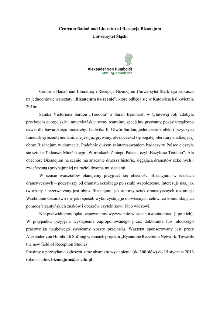 Centrum Badań nad Literaturą i Recepcją Bizancjum Uniwersytet Śląski Centrum Badań nad Literaturą i Recepcją Bizancjum Uniwersytet Śląskiego zaprasza na jednodniowe warsztaty „Bizancjum na scenie”, które odbędą się w Katowicach 6 kwietnia 2016r. Sztuka Victoriena Sardou „Teodora” z Sarah Bernhardt w tytułowej roli zdobyła przebojem europejskie i amerykańskie sceny teatralne, specjalny prywatny pokaz urządzono nawet dla bawarskiego monarchy, Ludwika II. Utwór Sardou, jednocześnie efekt i przyczyna francuskiej bizantynomanii, nie jest już grywany, ale doczekał się bogatej literatury analizującej obraz Bizancjum w dramacie. Podobnie dużym zainteresowaniem badaczy w Polsce cieszyła się sztuka Tadeusza Micińskiego „W mrokach Złotego Pałacu, czyli Bazylissa Teofanu”. Ale obecność Bizancjum na scenie ma znacznie dłuższą historię, sięgającą dramatów szkolnych i zwieńczoną (przynajmniej na razie) dwoma musicalami. W czasie warsztatów planujemy przyjrzeć się obecności Bizancjum w tekstach dramatycznych – począwszy od dramatu szkolnego po sztuki współczesne. Interesuje nas, jak tworzony i przetwarzany jest obraz Bizancjum, jak autorzy sztuk dramatycznych rozumieją Wschodnie Cesarstwo i w jaki sposób wykorzystują je do własnych celów, co komunikują za pomocą bizantyńskich znaków i obrazów czytelnikowi i/lub widzowi. Nie przewidujemy opłat, zapewniamy wyżywienie w czasie trwania obrad (i po nich). W przypadku przyjęcia wystąpienia zaproponowanego przez doktoranta lub młodszego pracownika naukowego zwracamy koszty przejazdu. Warsztat sponsorowany jest przez Alexander von Humboldt Stiftung w ramach projektu „Byzantine Reception Network. Towards the new field of Reception Studies”. Prosimy o przesyłanie zgłoszeń oraz abstraktu wystąpienia (do 300 słów) do 15 stycznia 2016 roku na adres [email protected]