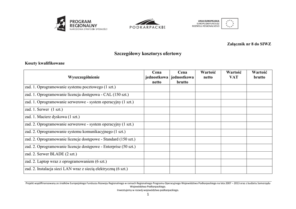 Załącznik nr 8 do SIWZ Szczegółowy kosztorys ofertowy Koszty kwalifikowane Wyszczególnienie Cena Cena jednostkowa jednostkowa netto brutto Wartość netto Wartość VAT Wartość brutto zad. 1. Oprogramowanie systemu pocztowego (1 szt.) zad. 1. Oprogramowanie licencja dostępowa - CAL (150 szt.) zad. 1. Oprogramowanie serwerowe - system operacyjny (1 szt.) zad. 1. Serwer (1 szt.) zad. 1. Macierz dyskowa (1 szt.) zad. 2. Oprogramowanie serwerowe - system operacyjny (1 szt.) zad. 2. Oprogramowanie systemu komunikacyjnego (1 szt.) zad. 2. Oprogramowanie licencje dostępowe - Standard (150 szt.) zad. 2. Oprogramowanie licencje dostępowe - Enterprise (50 szt.) zad. 2. Serwer BLADE (2 szt.) zad. 2. Laptop wraz z oprogramowaniem (6 szt.) zad. 2. Instalacja sieci LAN wraz z siecią elektryczną (6 szt.) Projekt współfinansowany ze środków Europejskiego Funduszu Rozwoju Regionalnego w ramach Regionalnego Programu Operacyjnego Województwa Podkarpackiego na lata 2007 – 2013 oraz z budżetu Samorządu Województwa Podkarpackiego. Inwestujemy w rozwój województwa podkarpackiego. 1 zad. 2. Przełącznik sieci LAN 24 porty (6 szt.) zad. 2. Sieć WLAN (1 szt.) zad. 3. Kamera typ I wraz z wyposażeniem (1 szt.) zad. 3. Mikrofon typ I (2 szt.) zad. 3. Mikrofon typ II (2 szt.) zad. 3. Mobilna stacja zarządzająca (2 szt.) zad. 3. Oprogramowanie strumieniowania danych (1 szt.) zad. 3. Wizualizer (1 szt.) zad. 3. Tablet (1 szt.) zad. 4. Audiobook (20 szt.) zad. 4. Terminale odsłuchowe typ I - Wypożyczalnia Muzyczna (3 szt.) zad. 4. Terminale odsłuchowe typ II - Wypożyczalnia Muzyczna (5 szt.) zad. 4. Pracownia digitalizacji dźwięku (1 szt.) zad. 4. Studio nagrań (1 szt.) zad. 4. Instalacja sieci LAN wraz z siecią elektryczną zad. 4. Przełącznik sieci LAN 48 portów Projekt współfinansowany ze środków Europejskiego Funduszu Rozwoju Regionalnego w ramach Regionalnego Programu Operacyjnego Województwa Podkarpackiego na lata 2007 – 2013 oraz z budżetu Samorządu Województwa Podkarpackiego. Inwestujemy w rozwój województwa podkarpackiego. 2 zad. 4. Laptopy z oprogramowaniem - pracownia (15 szt.) zad. 5. Skaner wielkoformatowy (1 szt.) zad. 5. Skaner mikrofilmów (1 szt.) zad. 5. Komputery z oprogramowaniem (7 szt.) zad. 6. Wirtualny przewodnik (23 placówki) - spacery wirtualne, film (1 szt.) zad. 6. Bookcrossing (wymiana książek) (1 szt.) zad. 6. e-czasopisma - (1 szt.) zad. 6. Lektor on-line (1 szt.) zad. 6. Wersja mobilne (1 szt.) zad. 7. Konsolidacja danych (1 szt.) zad. 7. Kody Qr code (1 szt.) zad. 7. Kody RFID - wypożyczalnia główna (1 szt.) zad. 7. Zestawy komputerowe (6 szt.) zad. 7. Interfejs dla systemów bibliotecznych (1 szt.) zad. 7. Integracja z portalem (1 szt.) zad. 7. Pomoc-online (1 szt.) RAZEM Projekt współfinansowany ze środków Europejskiego Funduszu Rozwoju Regionalnego w ramach Regionalnego Programu Operacyjnego Województwa Podkarpackiego na lata 2007 – 2013 oraz z budżetu Samorządu Województwa Podkarpackiego. Inwestujemy w rozwój województwa podkarpackiego. 3 Koszty niekwalifikowane Cena Wyszczególnienie Cena Wartość Wartość Wartość jednostkowa jednostkowa jednostkowa VAT jednostkowa netto brutto brutto netto zad. 3. Kamera typ II - monitoring wew. (11 szt.) zad. 3. Kamera typ III - monitoring zewn. (2 szt.) zad. 3. Rejestrator cyfrowy do monitoringu (1 szt.) zad. 2. Projektor (6 szt.) zad. 2. Ekran elektryczny (6 szt.) zad. 3. Tablica interaktywna wraz z wyposażeniem (1 szt.) zad. 3. Projektor (1 szt.) RAZEM ...................................................................................... (miejscowość, data) ....................................................................................... (imię, nazwisko, stanowisko, pieczątka firmowa, podpis osoby lub osób uprawnionych do reprezentowania Wykonawcy) Projekt współfinansowany ze środków Europejskiego Funduszu Rozwoju Regionalnego w ramach Regionalnego Programu Operacyjnego Województwa Podkarpackiego na lata 2007 – 2013 oraz z budżetu Samorządu Województwa Podkarpackiego. Inwestujemy w rozwój województwa podkarpackiego. 4