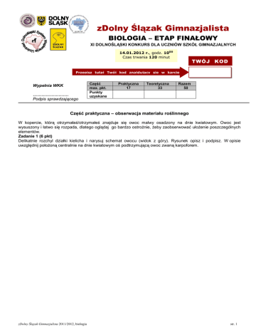 zDolny Ślązak Gimnazjalista BIOLOGIA – ETAP FINAŁOWY XI DOLNOŚLĄSKI KONKURS DLA UCZNIÓW SZKÓŁ GIMNAZJALNYCH 14.01.2012 r., godz. 1000 Czas trwania 120 minut TWÓJ KOD Przepisz tutaj Twój kod znajdujący się w karcie Wypełnia WKK ……………………. Podpis sprawdzającego Część max. pkt. Punkty uzyskane Praktyczna 17 Teoretyczna 33 Razem 50 Część praktyczna – obserwacja materiału roślinnego W kopercie, którą otrzymałaś/otrzymałeś znajduje się owoc malwy osadzony na dnie kwiatowym. Owoc jest wysuszony i łatwo się rozpada, dlatego oglądaj go bardzo ostroŜnie, Ŝeby zaobserwować ułoŜenie poszczególnych elementów. Zadanie 1 (6 pkt) Delikatnie rozchyl działki kielicha i narysuj schemat owocu (widok z góry). Rysunek opisz i podpisz. W opisie uwzględnij połoŜoną centralnie na dnie kwiatowym oś podtrzymującą owoc zwaną karpoforem. zDolny Ślązak Gimnazjalista 2011/2012, biologia str. 1 TW Ó J K OD Zadanie 2 (4 pkt) Ustal typ owocu wpisując 4 razy znak X w kolumnie „Owoc malwy” przy odpowiednich nazwach. Owoc malwy Niektóre typy owoców suche jednonasienne orzech ziarniak niełupka wielonasienne pękające mieszek strąk łuszczyna torebka rozpadające się rozłupnia strąk przewęzisty Zadanie 3 (5 pkt) Encyklopedia PWN: Rozłupka, bot. owocek zawierający jedno nasienie. Wykorzystaj informację do zidentyfikowania rozłupki i nasienia malwy. Narysuj rozłupkę i nasienie malwy, zachowaj proporcje. rozłupka malwy nasienie malwy Zadanie 4 (1 pkt) Na podstawie obserwacji materiału biologicznego ustal, ile płatków korony ma kwiat malwy i wpisz odpowiedź: ………………………………………………………………… Zadanie 5 (1 pkt) Na podstawie obserwacji materiału biologicznego ustal z ilu owocolistków składa się zaląŜnia malwy i wpisz odpowiedź: ………………………………………………….. zDolny Ślązak Gimnazjalista 2011/2012, biologia str. 2 TW Ó J K OD Część teoretyczna Tekst do zadania 6 Alergią nazywamy nadmierną reakcję organizmu na jakiś czynnik (alergen). Kontakt z alergenem powoduje wytwarzanie przeciwciał, znajdujących się między innymi na błonie komórkowej komórek tucznych. Kiedy alergen zostanie wyłapany przez przeciwciała, komórki tuczne wydzielają histaminy, odpowiedzialne za takie reakcje alergiczne, jak kaszel, katar, wysypka. Zadanie 6 (3 pkt) Na rysunku podpisz wskazane elementy, wybierając potrzebne terminy z tekstu. Zadanie 7 (3 pkt) Opisz cechy komórek tucznych wstawiając znak X w zacienione rubryki. 1. Najbardziej podobna komórka: 2. Częste miejsce występowania: leukocyt neuron oocyt zakończenia nerwowe błona śluzowa mięsień sercowy 3. NaleŜy do układu: hormonalnego nerwowego odpornościowego Tekst do zadań, 8, 9. 10. Intensywność oddychania komórkowego u roślin zaleŜy miedzy innymi od temperatury otoczenia. U ziemniaka na przykład najwyŜsza jest w przedziale temperatur 35-40 stopni Celsjusza. PowyŜej 40° gwałtownie spada. Oddychanie nie zachodzi w temperaturze poniŜej około 5°C. Zadanie 8 (2 pkt) Opisz współrzędne wykresu, który mógłby ilustrować podaną informację. 1. Współrzędna niezaleŜna x: ……………….2. Współrzędna zaleŜna y: …………………… Zadanie 9 (1 pkt) Podaj przykładową jednostkę dla zmiennej zaleŜnej y: …………………………………….. Zadanie 10 (1 pkt) Które współrzędne (x, y) opisują wykres ilustrujący informację podaną w tekście? WskaŜ je. A. B. C. D. (0, 0), (0, 5), (0, 35), (0, 45) (5, 10), (35, 70), (40, 80), (45, 90) (5, 1), (35, 70), (40, 70), (45, 20) (0, 5), (30, 70), (35, 75), (45, 70) zDolny Ślązak Gimnazjalista 2011/2012, biologia str. 3 TW Ó J K OD Zadanie 11 (4 pkt) Rozpoznaj roślinę przedstawioną na rysunku. A. Zapisz nazwę rodzajową tej rośliny. ………………………………………………. B. Zapisz nazwę rodziny, do której ta roślina naleŜy……………………………………… C. Zaznacz na rysunku i podpisz nazwę organu odpowiedzialnego za I. rozmnaŜanie płciowe tej rośliny, II. rozmnaŜanie bezpłciowe rośliny. Wybrane organy podpisz odpowiednio I i II. Zadanie 12 (4 pkt) Wykorzystaj poniŜszy opis do wykonania zadania. Opis przeprowadzenia doświadczenia: Materiały: − indofenol – barwnik koloru niebieskiego, który traci barwę w obecności witaminy C, − tabletka z witaminą C, pokruszona i rozpuszczona w 1 ml wody, − po 5 ml soku z cebuli, jabłek, cytryn, ziemniaka. − 5 probówek, − 5 kroplomierzy. Wykonanie: − Podpisać probówki: 1. roztwór witaminy C, 2. sok z cebuli, 3. sok z jabłek, 4. sok z cytryn, 5. sok z ziemniaków. − Do kaŜdej probówki dodać po 2 ml indofenolu. − Wkraplać powoli do probówek: 1. roztwór witaminy C, a do probówek 2. - 5. odpowiednie soki i mieszać ich zawartość. − Zanotować liczbę dodanych kropli witaminy C i kaŜdego soku. 12 A. Zapisz cel tego doświadczenia………………………………………………………………………… ………………………………………………………………………………………………………………………. 12 B. Wyjaśnij, dlaczego uŜyto pięciu kroplomierzy, a nie jednego. …………………………………………………………………………………………………………………….... 12 C. Określ kiedy naleŜy zakończyć wkraplanie witaminy C do indofenolu. ………………………………………………………………………………………………………………..…….. 12 D. Wyjaśnij, po co przeprowadzono próbę w probówce 1. ………………………………………………………………………………………………………………..…….. Zadanie 13 (4 pkt) Uzupełnij tabelę w taki sposób, by opisywała sposoby identyfikacji wybranych zwiazków chemicznych. Wykrywany związek chemiczny 