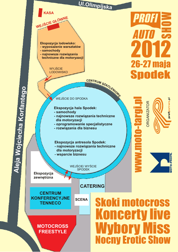 Ul.Olimp ijska ŒCIE WEJ SHOW KASA WNE G£Ó 2012 26-27 maja Ekspozycja lodowisko: - wyposa¿enie warsztatów - samochody - najnowsze rozwi¹zania techniczne dla motoryzacji WYJŒCIE LODOWISKO O Ekspozycja hala Spodek: - samochody - najnowsze rozwi¹zania techniczne dla motoryzacji - oprogramowanie specjalistyczne - rozwi¹zania dla biznesu Ekspozycja antresola Spodek: - najnowsze rozwi¹zania techniczne dla motoryzacji - wsparcie biznesu WEJŒCIE/ WYŒCIE SPODEK Ekspozycja zewnêtrzna ORGANIZATOR WEJŒCIE DO SPODKA www.moto-targi.pl cha Korfante E Aleja Wojcie Spodek W go CENTRU MS ZK OL EN I CATERING CENTRUM KONFERENCYJNE TENNECO MOTOCROSS FREESTYLE SCENA Skoki motocross Koncerty live Wybory Miss Nocny Erotic Show