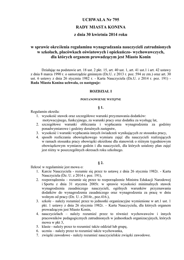UCHWAŁA Nr 795 RADY MIASTA KONINA z dnia 30 kwietnia 2014 roku w sprawie określenia regulaminu wynagradzania nauczycieli zatrudnionych w szkołach, placówkach oświatowych i opiekuńczo- wychowawczych, dla których organem prowadzącym jest Miasto Konin Działając na podstawie art. 18 ust. 2 pkt. 15, art. 40 ust. 1, art. 41 ust.1 i art. 42 ustawy z dnia 8 marca 1990 r. o samorządzie gminnym (Dz.U. z 2013 r. poz. 594 ze zm.) oraz art. 30 ust. 6 ustawy z dnia 26 stycznia 1982 r. - Karta Nauczyciela (Dz.U. z 2014 r. poz. 191) Rada Miasta Konina uchwala, co następuje: ROZDZIAŁ I POSTANOWIENIE WSTĘPNE § 1. Regulamin określa: 1. wysokość stawek oraz szczegółowe warunki przyznawania dodatków: motywacyjnego, funkcyjnego, za warunki pracy oraz dodatku za wysługę lat, 2. szczegółowe warunki obliczania i wypłacania wynagrodzenia za godziny ponadwymiarowe i godziny doraźnych zastępstw, 3. wysokość i warunki wypłacania innych świadczeń wynikających ze stosunku pracy, 4. sposób rozliczania obowiązkowego wymiaru zajęć dla nauczycieli realizujących w ramach stosunku pracy obowiązki określone dla stanowisk o róŜnym tygodniowym obowiązkowym wymiarze godzin i dla nauczycieli, dla których ustalony plan zajęć jest róŜny w poszczególnych okresach roku szkolnego. § 2. Ilekroć w regulaminie jest mowa o: 1. Karcie Nauczyciela - rozumie się przez to ustawę z dnia 26 stycznia 1982r. - Karta Nauczyciela (Dz. U. z 2014 r. poz. 191), 2. rozporządzeniu – rozumie się przez to rozporządzenie Ministra Edukacji Narodowej i Sportu z dnia 31 stycznia 2005r. w sprawie wysokości minimalnych stawek wynagrodzenia zasadniczego nauczycieli, ogólnych warunków przyznawania dodatków do wynagrodzenia zasadniczego oraz wynagrodzenia za pracę w dniu wolnym od pracy (Dz. U. z 2014r., poz.416.), 3. szkole – naleŜy rozumieć przez to jednostki organizacyjne wymienione w art.1 ust. 1 pkt. 1 ustawy z dnia 26 stycznia 1982r. – Karta Nauczyciela, dla których organem prowadzącym jest Miasto Konin, 4. nauczycielach – naleŜy rozumieć przez to równieŜ wychowawców i innych pracowników pedagogicznych zatrudnionych w jednostkach organizacyjnych, których mowa w pkt 3, 5. klasie - naleŜy przez to rozumieć takŜe oddział lub grupę, 6. uczniu – naleŜy przez to rozumieć takŜe wychowanka, 7. związki zawodowe - naleŜy rozumieć nauczycielskie związki zawodowe. ROZDZIAŁ II DODATKI § 3. Dodatek motywacyjny 1. Warunkiem przyznania nauczycielowi dodatku motywacyjnego jest: 1) podejmowanie efektywnych i nowatorskich działań dydaktycznych oraz aktywizujących metod nauczania i wychowania sprzyjających indywidualnemu rozwojowi ucznia i podnoszeniu jakości pracy szkoły, 2) udokumentowane osiągnięcia edukacyjne uczniów, potwierdzone wynikami egzaminów zewnętrznych, udziałem w konkursach, turniejach i olimpiadach, 3) udział w pracach zespołów nadzorujących i komisjach egzaminacyjnych sprawdzianów i egzaminów gimnazjalnych, maturalnych i potwierdzających kwalifikacje zawodowe, 4) rozwiązywanie problemów wychowawczych uczniów, 5) efektywne działania na rzecz uczniów o specjalnych potrzebach edukacyjnych, potrzebujących opieki, 6) prowadzenie działań profilaktycznych oraz przeciwdziałanie agresji, patologiom i uzaleŜnieniom wśród uczniów, 7) inicjowanie i organizowanie imprez i uroczystości szkolnych, 8) opieka nad samorządem uczniowskim i innymi organizacjami uczniowskimi, działającymi w szkole, 9) podejmowanie inicjatyw i działań istotnie zwiększających udział i rolę szkoły w środowisku lokalnym. 2. Warunkiem przyznania dodatku motywacyjnego nauczycielowi, któremu powierzono stanowisko dyrektora jest spełnienie niŜej wymienionych wymagań: 1) wzorowe kierowanie i zarządzanie szkołą/placówką: a. realizacja uchwał i zarządzeń organu prowadzącego, b. realizacja zadań statutowych, c. rzetelne planowanie i realizacja przyjętego planu finansowego, d. prawidłowe prowadzenie polityki kadrowej, e. podejmowanie aktywnych działań na rzecz poprawy bazy materialnej szkoły/placówki, w tym pozyskiwanie dodatkowych środków, f. prawidłowe i terminowe sporządzenie sprawozdań, g. dbałość o bazę szkoły/placówki, prawidłowe zarządzanie majątkiem; 2) wyróŜniające sprawowanie nadzoru pedagogicznego, 3) aktywne wspieranie i organizowanie doskonalenia zawodowego nauczycieli, 4) wyróŜniające promowanie szkoły/placówki i odpowiednie reprezentowanie jej na zewnątrz, 5) wyróŜniające realizowanie strategii oświatowej Miasta Konina, 6) tworzenie dobrej atmosfery pracy m.in. przez właściwą współpracę z radą pedagogiczną, związkami zawodowymi działającymi w szkole, radą rodziców oraz radą szkoły, 7) pozytywna ocena wyników kontroli przeprowadzonych przez upowaŜnione organy. 3. Dodatek motywacyjny nauczycielom przyznaje dyrektor szkoły/placówki. Dodatek dyrektorowi szkoły/placówki przyznaje Prezydent Miasta Konina. Przyznanie dodatku motywacyjnego odbywa się wyłącznie w ramach środków finansowych wyodrębnionych na ten cel w planie finansowym szkoły. 4. Wysokość środków finansowych przeznaczonych na dodatki motywacyjne, w przeliczeniu na jeden etat odnosi się procentowo w stosunku do wynagrodzenia zasadniczego: 1) 6 % dla nauczycieli, 2) 13% dla wicedyrektorów oraz innych stanowisk kierowniczych przewidzianych w statucie szkoły, 3) 28 % dla dyrektorów. 5. Dodatek motywacyjny i funkcyjny oraz inne dodatki dla dyrektorów nie mogą przekroczyć 75% uposaŜenia zasadniczego. Dodatek motywacyjny i funkcyjny oraz inne dodatki dla wicedyrektorów nie mogą przekroczyć 45% uposaŜenia zasadniczego. 6. Dodatek motywacyjny przyznaje się na czas określony, nie dłuŜszy niŜ sześć miesięcy. 7. Dodatek motywacyjny wypłaca się z góry, w terminie wypłaty wynagrodzenia. § 4. Dodatek funkcyjny 1. Dyrektorowi, wicedyrektorowi oraz nauczycielowi, któremu powierzono stanowisko kierownicze przewidzi