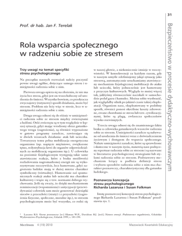 31 Rola wsparcia spo³ecznego w radzeniu sobie ze stresem Rola wsparcia spo³ecznego w radzeniu sobie ze stresem Trzy uwagi na temat specyfiki stresu psychologicznego Na początku naszych rozważań należy poczynić pewne uwagi ogólne, dotyczące samego stresu i umiejętności radzenia sobie z nim. Pierwsza uwaga opiera się na złożeniu, że nie ma życia bez stresu, gdyż jest on wszechobecny od urodzenia do śmierci. Wszystko bowiem, co przekracza zwyczajowy (rutynowy) sposób działania, może być stresem. Problem nie leży więc w stresie, lecz w umiejętności radzenia sobie z nim. Druga uwaga odnosi się do różnic w umiejętności radzenia sobie ze stresem między zwierzętami a ludźmi. Otóż zwierzęta są w tym względzie w lepszej sytuacji, gdyż mając wrodzony obraz gatunkowego wroga (zagrożenia), są również wyposażone w gotowe programy zaradcze, zawierające się w dwóch wzorcach działania: atak lub ucieczka. Towarzyszy temu pełna mobilizacja energetyczna organizmu (np. napięcie mięśniowe, zwiększone tętno, redystrybucja krwi do organów odpowiedzialnych za mobilizację organizmu itp.). U człowieka na poziomie fizjologicznym występują takie same atawistyczne reakcje, które z braku możliwości rozładowania nagromadzonej energii nie są wykorzystywane rzeczywiście, lecz hamowane, gdyż zagrożenia ludzkie mają w dużej mierze charakter symboliczny (wirtualny). Hamowanie zaś spontanicznych reakcji ataku lub ucieczki ma charakter kulturowy i wiąże się z tzw. normami dobrego wychowania. Jeśli się zważy, że dzięki mechanizmom reminiscencji (wspomnienia) i antycypacji (przewidywania) człowiek sam może generować dziesiątki stresów z przeszłości (straty) i z przyszłości (zagrożenia fizyczne, społeczne, moralne itp.), to stresem psychologicznym może być wszystko, co rodzi się w naszej głowie, a niekoniecznie istnieje w rzeczywistości. W konsekwencji za każdym razem, gdy w naszym umyśle zdefiniujemy jakąś sytuację jako stresową, automatycznie uruchamiamy atawistyczny mechanizm fizjologicznej mobilizacji do ataku lub ucieczki, który jednocześnie jest hamowany z przyczyn kulturowych. Wygląda to mniej więcej tak, jakbyśmy równocześnie naciskali w samochodzie pedał gazu i hamulec. Można sobie wyobrazić, jak wyglądałby silnik po jakimś czasie takiej eksploatacji. Organizm nasz, eksploatowany w podobny sposób, również ponosi określone koszty zdrowotne, zwane chorobami ze stresu lub tzw. cywilizacyjnymi, które są plagą, zwłaszcza społeczeństw wysoko rozwiniętych. Trzecia uwaga odnosi się do znamiennego faktu braku u człowieka gatunkowych wzorców radzenia sobie ze stresem. Umiejętności zaradcze są nabywane od urodzenia do śmierci wraz z doświadczeniem życiowym i dostępem do wsparcia społecznego. Nabyte umiejętności zaradcze, które są sprawdzone i skuteczne w naszym życiu, stanowią nasz podręczny repertuar radzenia sobie ze stresem i są nazwane w literaturze psychologicznej strategiami lub stylami radzenia sobie ze stresem. Podstawowy mechanizm leżący u podłoża definicji stresu i wyboru sposobów radzenia sobie z nim ma charakter poznawczy, charakterystyczny dla gatunku ludzkiego. Bezpieczeñstwo w procesie dydaktyczno-wychowawczym Prof. dr hab. Jan F. Terelak Poznawcza koncepcja stresu psychologicznego Richarda Lazarusa i Susan Folkman Istotę poznawczej koncepcji stresu psychologicznego Richarda Lazarusa i Susan Folkman1 przedstawia rys. 1. 1 Lazarus R.S. Ocena poznawcza [w:] Ekman W.P., Davidson R.J. [red.] Natura emocji. Podstawowe zagadnienia, Gdańskie Wydawnictwo Psychologiczne, Gdańsk 1999, s. 183-190. Meritum 4 (19) 2010 Mazowiecki Kwartalnik Edukacyjny 32 Prof. dr hab. Jan F. Terelak Bezpieczeñstwo w procesie dydaktyczno-wychowawczym OCENA POZNAWCZA RADZENIE SOBIE KRZYWDA ZDARZENIE STRESOWE EFEKTY ODCZUCIA Korzystne Emocje pozytywne ZAGROŻENIE WYZWANIE Ocena pierwotna stresora Ocena wtórna własnych możliwości ŁAGODNA LUB OBOJĘTNA Skoncentrowanie na problemie Skoncentrowanie na emocjach Niekorzystne lub brak efektów Dystres Przewartościowanie PODTRZYMYWANIE PROCESU RADZENIA SOBIE ZE STRESEM Emocje pozytywne Rys. 1. Model poznawczej koncepcji stresu R. Lazarusa i S. Folkman Jak wynika z rys. 1, podstawowym mechanizmem psychologicznym odpowiedzialnym za decyzję, która sytuacja życiowa jest stresowa, a która nie, jest ocena poznawcza zagrożenia, rozumiana jako mechanizm interpretujący zdarzenia. Autorzy wyróżniają dwa rodzaje oceny poznawczej – ocenę pierwotną i wtórną. Ocena pierwotna jest procesem, w którym ocenia się, czy docierający do mózgu bodziec (sytuacja) jest stresorem, czy nie. Bodźce ocenione jako nieszkodliwe, pozytywne lub obojętne nie są zaliczane do kategorii stresorów, a ocena taka uruchamia odpowiednie zasoby zaradcze organizmu. Dzielimy je na: (1) bez znaczenia, (2) sprzyjająco-pozytywne. Jeśli bodziec (sytuacja) został oceniony jako stresor, powstaje stan napięcia, wywołujący określone procesy psychofizjologiczne i ich korelaty emocjonalne. Wyróżniamy trzy kategorie stresorów: (a) krzywda lub strata, (b) zagrożenie i (c) wyzwanie. Pierwsza kategoria (krzywda lub strata) odnosi się do powstałej już szkody lub urazu (jak np. w przypadku śmierci bliskiej osoby, utraty poczucia sensu życia itp.). Druga kategoria (zagrożenie) może odnosić się do takich samych szkód, Mazowiecki Kwartalnik Edukacyjny lecz w przypadku, gdy jeszcze nie wystąpiły, a są tylko antycypowane. Trzecia kategoria, czyli wyzwanie, wskazuje na ocenę własnych możliwości opanowania sytuacji stresowej. Rozróżnienie między szkodą (stratą), zagrożeniem i wyzwaniem ma zdaniem Lazarusa i Folkman duże znaczenie dla analizy procesu radzenia sobie ze stresem. Stres psychologiczny odnosi się przede wszystkim do wymagań (lub konfliktów między nimi), które według oceny konkretnej osoby wyczerpują bądź przekraczają jej możliwości (we