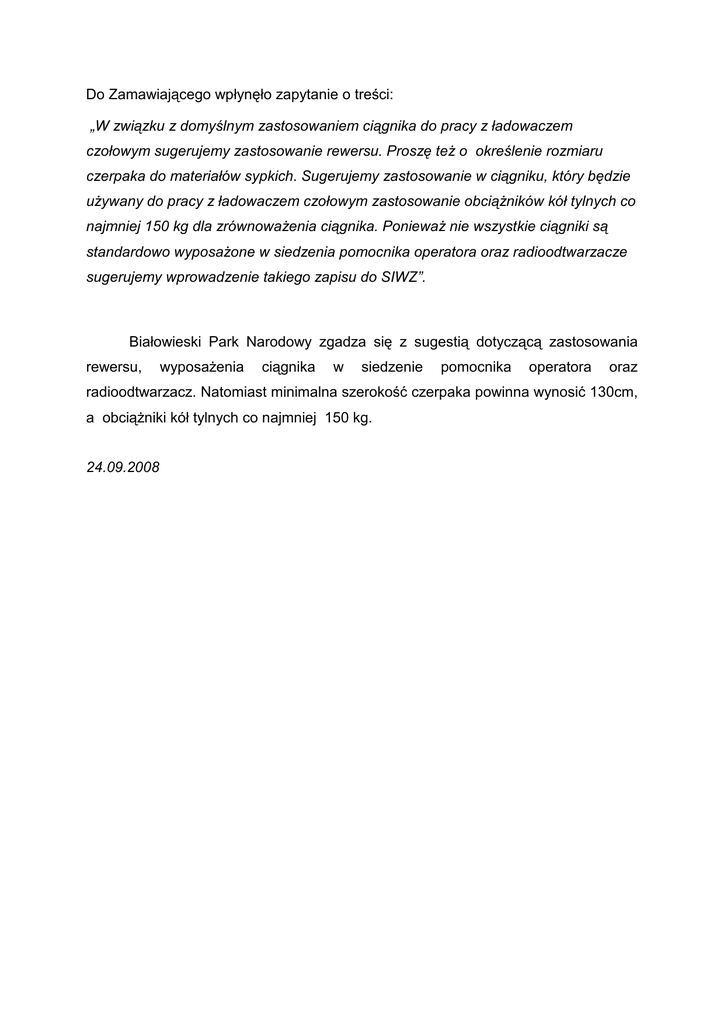 Do Zamawiającego wpłynęło zapytanie o treści: „W związku z domyślnym zastosowaniem ciągnika do pracy z ładowaczem czołowym sugerujemy zastosowanie rewersu. Proszę teŜ o określenie rozmiaru czerpaka do materiałów sypkich. Sugerujemy zastosowanie w ciągniku, który będzie uŜywany do pracy z ładowaczem czołowym zastosowanie obciąŜników kół tylnych co najmniej 150 kg dla zrównowaŜenia ciągnika. PoniewaŜ nie wszystkie ciągniki są standardowo wyposaŜone w siedzenia pomocnika operatora oraz radioodtwarzacze sugerujemy wprowadzenie takiego zapisu do SIWZ”. Białowieski Park Narodowy zgadza się z sugestią dotyczącą zastosowania rewersu, wyposaŜenia ciągnika w siedzenie pomocnika operatora oraz radioodtwarzacz. Natomiast minimalna szerokość czerpaka powinna wynosić 130cm, a obciąŜniki kół tylnych co najmniej 150 kg. 24.09.2008
