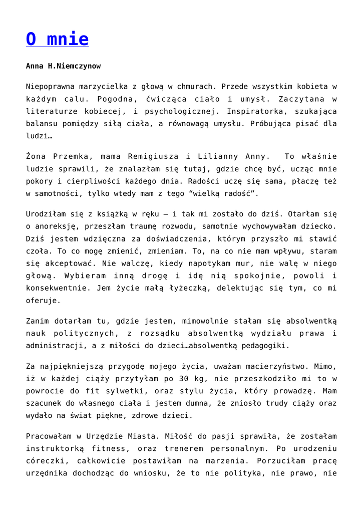 O mnie Anna H.Niemczynow Niepoprawna marzycielka z głową w chmurach. Przede wszystkim kobieta w każdym calu. Pogodna, ćwicząca ciało i umysł. Zaczytana w literaturze kobiecej, i psychologicznej. Inspiratorka, szukająca balansu pomiędzy siłą ciała, a równowagą umysłu. Próbująca pisać dla ludzi… Żona Przemka, mama Remigiusza i Lilianny Anny. To właśnie ludzie sprawili, że znalazłam się tutaj, gdzie chcę być, ucząc mnie pokory i cierpliwości każdego dnia. Radości uczę się sama, płaczę też w samotności, tylko wtedy mam z tego “wielką radość”. Urodziłam się z książką w ręku – i tak mi zostało do dziś. Otarłam się o anoreksję, przeszłam traumę rozwodu, samotnie wychowywałam dziecko. Dziś jestem wdzięczna za doświadczenia, którym przyszło mi stawić czoła. To co mogę zmienić, zmieniam. To, na co nie mam wpływu, staram się akceptować. Nie walczę, kiedy napotykam mur, nie walę w niego głową. Wybieram inną drogę i idę nią spokojnie, powoli i konsekwentnie. Jem życie małą łyżeczką, delektując się tym, co mi oferuje. Zanim dotarłam tu, gdzie jestem, mimowolnie stałam się absolwentką nauk politycznych, z rozsądku absolwentką wydziału prawa i administracji, a z miłości do dzieci…absolwentką pedagogiki. Za najpiękniejszą przygodę mojego życia, uważam macierzyństwo. Mimo, iż w każdej ciąży przytyłam po 30 kg, nie przeszkodziło mi to w powrocie do fit sylwetki, oraz stylu życia, który prowadzę. Mam szacunek do własnego ciała i jestem dumna, że zniosło trudy ciąży oraz wydało na świat piękne, zdrowe dzieci. Pracowałam w Urzędzie Miasta. Miłość do pasji sprawiła, że zostałam instruktorką córeczki, fitness, całkowicie oraz trenerem postawiłam na personalnym. marzenia. Po urodzeniu Porzuciłam pracę urzędnika dochodząc do wniosku, że to nie polityka, nie prawo, nie pedagogika, a właśnie zgłębianie możliwości ludzkiego umysłu jest tym, co chcę w życiu robić. Już wiem, że ta droga mnie uszczęśliwia. Rozmawiając z ludźmi, jestem najszczęśliwsza na świecie. Ciało jest piękne w każdym rozmiarze, pod warunkiem, że jest silne i zadbane. Nie ma słabych ciał, są słabe charaktery. Piękno zawsze leży w oczach patrzącego. Piękne ciało, bez pięknego umysłu jest jak małżeństwo bez miłości…Porzuciłam uzależnienie od fitnessu, na rzecz uzależnienia od słowa pisanego… Teraz ćwiczę dla zdrowia – psychicznego przede wszystkim. Czytam, czytam, czytam i…piszę… Niebawem, na półki księgarni trafi moja debiutancka powieść, nad którą prace zostały ukończone w grudniu 2016 r. Pisanie jest tym, co mnie bardzo uspokaja. Pozwala mi żyć życiem moich bohaterów, oraz uczy patrzenia na własne doświadczenia z dystansem. Kocham ciszę towarzyszącą procesowi pisania, jest ona dla mnie najpiękniejszą muzyką. Wierzę, że moja przygoda z pisaniem, będzie trwała całe życie. Cieszę się, że zostaję obdarzona tak wielkim zaufaniem i mogę czytać o Was. To daje mi inspirację, która jest matką każdego kolejnego pomysłu. Wasze maile są dla mnie na wagę złota. Czytam je wszystkie i staram się odpisywać. Kilka faktów o mnie : * Przez wiele lat pracowałam jako trener personalny i instruktorka fitness. * Aktywność fizyczna to wielka pasja i miłość. Lubię bicie serca towarzyszące męczeniu ciała. Czuję wtedy pod skórą namacalny przepływ życia. * Uwielbiam gotować. Gotuję każdego dnia. Jedzenie to magia. Znajdziecie tu wiele pysznych przepisów, które mam nadzieję przypadną Wam do gustu. * Największą słabość mam do szarlotki, którą sama piekę, oraz do lodów…potrafię zjeść litr za jednym razem * Sama piekę chleb – nazywam to swoją osobistą magią. Zapach chleba, to zapach domu. Dom pachnący chlebem na w sobie prawdę. * Namiętnie hoduję kwiaty doniczkowe, mam pokaźną kolekcję storczyków i kaktusów. * Uwielbiam słuchać muzyki, aczkolwiek w muzyczny błogostan wpadam tylko w trakcie biegania, oraz jazdy samochodem. Na codzień otaczam się ciszą – brzmi najpiękniej. * Moja pierwszą pracą, była posada sprzedawcy strojów kąpielowych!!! Do dziś mam słabość do bikini * Lubię sprzątać i dbać o dom w którym mieszkam z rodziną…to dla mnie forma regeneracji potreningowej oraz…medytacji… * Praktykuję uważność. Staram się ZAUWAŻAĆ to, co się dzieje dookoła mnie. * Jestem strasznie sentymentalna jeśli chodzi o ludzi. Przywiązuję się do nich ogromnie. * Jestem wrażliwa…czasami aż za bardzo. Wzruszam się zwykłymi, niezwykłymi rzeczami. * Codzienność jest dla mnie niecodzienna. Uśmiech dziecka, zapach świeżo zaparzonej kawy, rozmowa z bliską osobą…chwila zatrzymania i zadumy, to moja osobista celebracja życia. * Mam słabość do pięknych perfum. Zapamiętuję zapachy, kojarzę je z ludźmi i sytuacjami z życia. * Uwielbiam palić świeczki, z każdego wyjazdu przywożę nowe, woskowe cuda. Kiedy piszę, zawsze je zapalam. To taki mój rytuał. Marzę o tym, aby nigdy nie przestało mi się chcieć. Abym do końca życia pozostała w pełni sił fizycznych i mentalnych. Marzę, aby jak najkorzystniej wykorzystać potencjał, z którym się urodziłam. Chcę się dzielić z ludźmi tym, co w sobie noszę. Życie poświęcone innym, warte jest przeżycia. Uczę się być szczęśliwą, albowiem jak powiedział Erich From “Szczęście nie jest ani dziełem przypadku, ani darem Bogów. Szczęście to coś, co każdy z nas musi wypracować dla samego siebie”. Pracuję na moją radość każdego dnia. Uśmiech, który widzisz, to nie dar od losu, lecz wykształcony nawyk. To, co dajemy ludziom, wraca do nas podwójnie. Lubię uśmiechniętych ludzi, więc sama staram się uśmiechać. Najważniejsza w życiu jest miłość do siebie, tylko wtedy, kiedy pokochamy siebie bezwarunkowo, jesteśmy w stanie przekazać miłość dalej, kochać inny