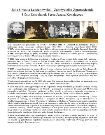 Julia Urszula Ledóchowska – Założycielka Zgromadzenia Sióstr Urszulanek Serca Jezusa Konającego Julia Ledóchowska przychodzi na świat 17 kwietnia 1865 w Loosdorf (Austria)jako drugie z siedmiorga dzieci Antoniego Ledóchowskiego (1823-1885) i Józefiny Salis-Zizers (1831-1909). W 1874 roku rodzina przenosi się do Sankt Pölten, większego miasteczka niedaleko Loosdorf. Tam Julia uczęszcza do Szkoły Pań Angielskich, gdzie otrzymuje wykształcenie o profilu humanistycznym. W 1883 urzeczywistniają się plany Antoniego, by wrócić z rodziną na ziemie polskie. Ledóchowscy nabywają dworek w Lipnicy Murowanej, niedaleko Krakowa. W 1886 Julia wstępuje do klasztoru urszulanek w Krakowie. Po nowicjacie Julia składa śluby zakonne i otrzymuje imię s. Maria Urszula od Jezusa. Pracuje jako nauczycielka i wychowawczyni w szkole prowadzonej przez siostry urszulanki. Bierze też lekcje malarstwa i ozdabia klasztorną kaplicę malowidłami ściennymi i obrazami. W 1904 roku zostaje wybrana przełożoną klasztoru krakowskiego. W 1907 z błogosławieństwem papieża Piusa X wraz z dwiema siostrami wyjeżdża do Petersburga, aby objąć kierownictwo internatu dla dziewcząt przy polskim gimnazjum parafii św. Katarzyny. Siostry noszą strój świecki, ponieważ w imperium rosyjskim życie zakonne jest zakazane. M. Urszula szybko znajduje drogę do serc i umysłów dziewcząt. Uczy się języka rosyjskiego i zdaje egzamin państwowy, aby móc prowadzić lekcje języka francuskiego. Wspólnota sióstr powiększa się. W 1908 roku mała filia klasztoru krakowskiego staje się autonomicznym domem urszulanek z własnym nowicjatem, a m. Urszula jego przełożoną. W 1910 nad Zatoką Fińską powstaje dom dla wspólnoty, zwany Merentähti (po fińsku: Gwiazda Morza), oraz - realizujące idee pedagogiczne m. Urszuli - gimnazjum z internatem dla dziewcząt. M. Urszula, przynaglona miłością Chrystusa, nawiązuje szybko kontakt z miejscową ludnością protestancką, a katolicka kaplica domu staje się miejscem modlitwy również dla Finów – w ich własnym języku. Wybuch wojny w 1914 roku powoduje wydalenie m. Urszuli, jako obywatelki austriackiej, z Rosji. Wyjeżdża do Szwecji, do Sztokholmu, a następnie do Danii. Zatrzymała się w Skandynawii: w Sztokholmie, następnie w Danii. Wspólnie z wyjeżdżającymi kolejno z Petersburga siostrami zorganizuje szkołę języków dla skandynawskich dziewcząt, potem m.in. ochronkę dla sierot po polskich emigrantach. Jednocześnie uczestniczy aktywnie w życiu katolickiej diaspory w Skandynawii. Podejmuje współpracę z Komitetem Pomocy Ofiarom Wojny, założonym w Szwajcarii przez Henryka Sienkiewicza. Poprzez akcję odczytową kształtuje wrażliwość społeczeństw skandynawskich na sprawę niepodległości Polski. Uczy się języków skandynawskich, aby lepiej dotrzeć do słuchaczy. W 1918 roku Polska odzyskuje niepodległość. Matka myśli o powrocie ze swoją wspólnotą do kraju. W 1920 roku, dzięki ofiarności norweskiego konsula Stolt-Nielsena, zostaje kupiony majątek w Pniewach. Tu osiedla się petersburska wspólnota urszulanek po kilkuletniej wędrówce. Powstaje pierwszy dom szarych urszulanek, dom macierzysty. 1 Wkrótce potem Stolica Apostolska daje pozwolenie na przekształcenie wspólnoty klasztoru petersburskiego w apostolskie Zgromadzenie Sióstr Urszulanek Serca Jezusa Konającego - żyjące duchowością urszulańską sięgającą korzeniami św. Anieli Merici oraz tradycją pracy wychowawczej jako uprzywilejowanego narzędzia ewangelizacji, szukające równocześnie form odpowiadających nowym potrzebom, szczególnie ludzi uboższych. Zgromadzenie szybko się rozwija. Powstają domy i dzieła w Polsce i na Kresach Wschodnich, od 1928 we Włoszech, od 1930 we Francji. M. Urszula formuje siostry do umiłowania Boga ponad wszystko, pragnąc, aby żyły w prostocie, były pokorne, a równocześnie pełne poświęcenia i twórcze w służbie innym, zwłaszcza dzieciom i młodzieży. Uśmiech, pogodę ducha i dobroć uważała za szczególnie wiarygodne świadectwo więzi z Chrystusem. Spala się miłością do Jezusa Chrystusa i ta miłość pozwala jej kochać każdego człowieka, bez względu na wyznanie, przekonania, pozycję. Matka Urszula umiera 29 maja 1939 w Rzymie w opinii świętości. 20 czerwca 1983 w Poznaniu Jan Paweł II beatyfikuje m. Urszulę. W 1989zachowane od zniszczenia ciało bł. Urszuli zostaje przewiezione z Rzymu do Pniew i złożone w kaplicy domu macierzystego. W 2002 roku kończy się proces kanonizacyjny: 23 kwietnia w Watykanie ogłasza się dekret o uznaniu cudu za wstawiennictwem bł. Urszuli. 18 maja 2003 w Rzymie Ojciec Św. Jan Paweł II kanonizuje m. Urszulę Ledóchowską. W dniu 5 marca 2009 roku Senat Rzeczypospolitej Polski podjął uchwałę w sprawie uczczenia 70. rocznicy śmierci świętej Urszuli Ledóchowskiej i uznania jej za wzór patriotki. Liturgiczne wspomnienie św. Urszuli przypada 29 maja. Trwa peregrynacja relikwii i obrazu św. Urszuli Od 17 kwietnia 2015 roku trwa peregrynacja relikwii i obrazu św. Urszuli po rodzinach na terenie pniewskich i sąsiednich parafii. Od tego czasu relikwie i obraz św. Urszuli gościły w 34 rodzinach z Pniew i okolic, z Poznania, Nowego Tomyśla i Obornik, przebywały w Parafii św. Jana Chrzciciela w Pniewach na czas odpustu, a w dniu 19 września 2015 roku pojadą do Kwilcza z okazji poświęcenia tam figury św. Urszuli. Zachęcamy do korzystania z łask Roku Jubileuszowego z okazji 150-lecia urodzin św. Urszuli i do przyjmowania relikwii i obrazu Świętej. Ich obecność w domu daje całej rodzinie możliwość wspólnej modlitwy (każda rodzina otrzymuje specjalny modlitewnik) i refleksji, może być po prostu okazją do wspólnego świętowania i radowania się obecnością niezwykłego Gościa. Chęć przyjęcia relikwii i obrazu Świętej na jedną dobę można zgłosić w zakrystii kaplicy Sanktuarium. Peregrynacja będzie t
