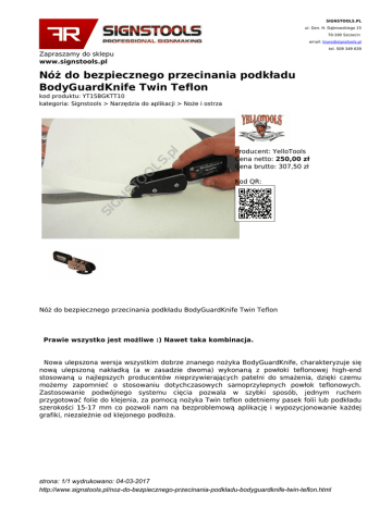 SIGNSTOOLS.PL ul. Gen. H. Dąbrowskiego 15 70-100 Szczecin email: [email protected] tel. 509 349 639 Zapraszamy do sklepu www.signstools.pl Nóż do bezpiecznego przecinania podkładu BodyGuardKnife Twin Teflon kod produktu: YT15BGKTT10 kategoria: Signstools > Narzędzia do aplikacji > Noże i ostrza Producent: YelloTools Cena netto: 250,00 zł Cena brutto: 307,50 zł Kod QR: Nóż do bezpiecznego przecinania podkładu BodyGuardKnife Twin Teflon Prawie wszystko jest możliwe :) Nawet taka kombinacja. Nowa ulepszona wersja wszystkim dobrze znanego nożyka BodyGuardKnife, charakteryzuje się nową ulepszoną nakładką (a w zasadzie dwoma) wykonaną z powłoki teflonowej high-end stosowaną u najlepszych producentów nieprzywierających patelni do smażenia, dzięki czemu możemy zapomnieć o stosowaniu dotychczasowych samoprzylepnych powłok teflonowych. Zastosowanie podwójnego systemu cięcia pozwala w szybki sposób, jednym ruchem przygotować folie do klejenia, za pomocą nożyka Twin teflon odetniemy pasek folii lub podkładu szerokości 15-17 mm co pozwoli nam na bezproblemową aplikację i wypozycjonowanie każdej grafiki, niezależnie od klejonego podłoża. strona: 1/1 wydrukowano: 04-03-2017 http://www.signstools.pl/noz-do-bezpiecznego-przecinania-podkladu-bodyguardknife-twin-teflon.html