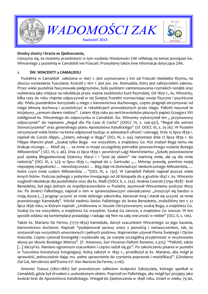 WADOMOŚCI ZAK Kwiecień 2013 Drodzy siostry i bracia ze Zjednoczenia, Cieszymy się, że możemy przedstawić w tym wydaniu Wiadomości ZAK refleksję na temat powiązań św. Wincentego z pustelnią w Camaldoli we Frascati. Przesyłamy także inne informacje dotyczące ZAK. 1. ŚW. WINCENTY a CAMALDOLI Pustelnia w Camaldoli założona w 1607 r. jest usytuowana 5 km od Frascati niedaleko Rzymu, na zboczu wzniesienia Tuscolana. Kościół z 1611 r. jest pw. św. Romualda, który jest założycielem zakonu. Przez wieki pustelnia fascynowała pielgrzymów, była punktem zainteresowania rzymskich notabli oraz wybierana jako miejsce na rekolekcje przez ważne osobistości Kurii Rzymskiej. Od 1820 r., ks. Wincenty, kilka razy do roku chętnie odpoczywał w tej Świętej Pustelni wzmacniając swoje fizyczne i psychiczne siły. Wielu pustelników korzystało u niego z kierownictwa duchowego, często pragnęli otrzymywać od niego lekturę duchową i uczestniczyć w rekolekcjach prowadzonych przez niego. Pallotti nazywał te inicjatywy „cennym darem niebios”. Latem 1839 roku po serii krwotoków płucnych papież Grzegorz XVI zobligował ks. Wincentego do odpoczynku w Camaldoli. Św. Wincenty wykorzystał ten „ przymusowy odpoczynek” do napisania „Reguł dla Pia Casa di Carita” (OOCC VI, s. 246-431), “Reguł dla ustroni Stowarzyszenia” oraz generalnego planu Apostolstwa Katolickiego” (cf. OOCC III, s. 25-26). W Pustelni otrzymywał wiele listów na które odpisywał budząc w adresatach ufność i odwagę. Dnia 15 lipca 1839 r. napisał do Curzio Alippi:, „Zatem, odwagi w Bogu” (OCL III, s. 44), natomiast dnia 17 lipca 1839 r. do Filippo Mancini pisał: „Szukaj tylko Boga - we wszystkim, a znajdziesz Go. Kto znalazł Boga temu nie brakuje niczego … Módl się … za mnie w mojej szczególnej potrzebie powszechnego wylania Bożego Miłosierdzia” ( OCL III, s. 46). Dnia 22 lipca 1839 r. powtórzył Luigi Morichiniemu: „Szkoły pozostawione pod opieką Błogosławionej Dziewicy Maryi i i “pod jej okiem” nie martwią mnie, ale są dla mnie radością” (OCL III, s. 52); w lipcu 1839 r., napisał do s. Gertrude: „... Mówiąc prawdę, pomimo mojej niepojętej niegodności … niewdzięczności … Bóg daje mi doświadczyć nieskończonego Miłosierdzia, … które czyni mnie cudem Miłosierdzia …”(OCL III, s. 130). W Camaldoli Pallotti napisał jeszcze wiele innych listów. Podczas jednego z pobytów trwającego od 28 listopada do 4 grudnia 1847 r. ks. Wincenty wygłosił rekolekcje dla pustelników oraz dla ks. Melii (OOCC X, s. 252). Andrea Castrati (1794-1878) - brat Benedetto, był jego jednym ze współpracowników w Pustelni, asystował Wincentemu podczas Mszy św. Po śmierci Pallottiego, napisał o nim w sprawozdawczym oświadczeniu: „troszczył się bardzo o moją duszę (...) pragnąc uczynić ze mnie dobrego zakonnika, kierował mną i starał się uczynić ze mnie prawdziwego Kamedułę”. Wśród siedmiu listów Pallottiego do brata Benedetto, znaleźliśmy ten z 22 lipca 1836 roku, w którym napisał: „Umiłowany w Jezusie Ukrzyżowanym, szukaj Boga, a znajdziesz Go. Szukaj Go we wszystkim, a znajdziesz Go wszędzie. Szukaj Go zawsze, a znajdziesz Go zawsze. W ten sposób oddasz się kontemplacji posiadając i radując się Nim na całą wieczność w niebie” (OCL II, s. 126). Także ks. Mariano Da Fermo, (1775-1854) Kameduła, darzył szacunkiem Wincentego za jego kazania, kierownictwo duchowe. Napisał: “podejmował sprawy wiary z jasnością i namaszczeniem, tak, że zostawiał nas wszystkich umocnionych i pełnych podziwu. Naprzemian używał Pisma Świętego i Ojców Kościoła. Często cytował Ewangelię i wydawało się, że czerpie szczególną przyjemność w recytowaniu słowa po słowie Boskiego Mistrza”. (F. Amoroso, San Vincenzo Pallotti Romano, s.375). “Pallotti, także [...] darzył ks. Mariano ogromnym szacunkiem i często radził się go”. Po zakończeniu pisania w pustelni w Tuscolana Konstytucji Kongregacji, którą założył w 1835 r., przedłożył je ks. Mariano, aby mógł je sprawdzić, jednocześnie dając mu pełne uprawnienie do czynienia poprawek i modyfikacji”. (Girolamo Dal Gal, Nel silenzio dell’Eremo il P. Don Mariano Da Fermo, s.116). Antonio Toesca (1802-1881) był prawdziwym odbiciem świętości Założyciela, którego spotkał w Camaldoli, gdzie był drwalem z uszkodzonym okiem. Poprosił on Pallottiego, aby mógł być przyjęty jako świecki brat do Apostolstwa Katolickiego. Wstąpił do Zjednoczenia w 1848 roku. Zmarł w wieku 79 lat, w 1881 roku, pozostawiając pamięć swoich cnót także dla księży. Święty Wincenty udał się do Camaldoli ostatni raz w sierpniu 1849 roku. 2. WYBORY W RODZINIE PALLOTYŃSKIEJ Krajowa Rada Koordynacyjna USA: Doroczne spotkanie KRK odbyło się w USA od 12 do 13 kwietnia 2013 r. w Baltimore, Maryland, podczas którego Bob Gay został ponownie wybrany na Przewodniczącego, natomiast ks. Greg Serwa SAC na wice Przewodniczącego. Christine Hanna i Jamine Truss zostały wyznaczone na sekretarza i ekonoma, przejmując obowiązki odpowiednio od Louise Gay oraz s. Elisabeth Heptner, SAC. KRK Szwajcaria: Do Rady Koordynacyjnej wybrano p. Melanie Dähler –Przewodniczącą, ponownie wybrano ks. Erich Schädler SAC na wice Przewodniczącego, s. Danielę Schumacher SAC wybrano na ekonomkę oraz Beatrice Herzog (Wspólnota APIS). Vreni Tanner wchodzi nadal w skład KRK. Siostry Eucharystki Św. Wincentego Pallottiego, Włochy: W dniach 11- 20 marca 2013 r. miała miejsce Kapituła Generalna Sióstr Eucharystek Św. Wincentego Pallottiego. Dnia 19 marca s. Adalgisa Cammarata została wybrana Przełożoną Generalną, s. Anna G. Sardiello Wikarią Generalną. S. Angelina Monaco, s. Margherita Casertano, s. Giovanna Cammarata i s. Giustina Gallantino Radnymi Generalnymi. Życzymy Bożego błogosławieństwa i dobrych natchnień każdej z wybranych osób do posług