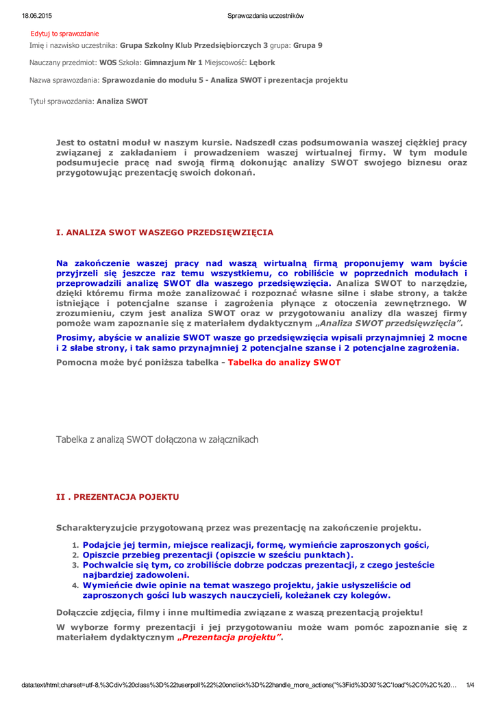 Nazwa sprawozdania: Sprawozdanie do modułu 5 Analiza SWOT i prezentacja projektu