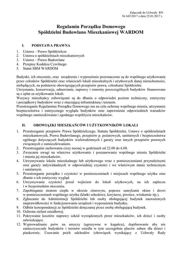 Załącznik do Uchwały RN Nr 645/2017 z dnia 25.01.2017 r. Regulamin Porządku Domowego Spółdzielni Budowlano Mieszkaniowej WARDOM I. 1. 2. 3. 4. 5. PODSTAWA PRAWNA Ustawa – Prawo Spółdzielcze Ustawa o spółdzielniach mieszkaniowych Ustawa – Prawo Budowlane Przepisy Kodeksu Cywilnego Statut SBM WARDOM Budynki, ich otoczenie, oraz urządzenia i wyposażenie przeznaczone są do wspólnego użytkowania przez członków Spółdzielni oraz właścicieli lokali mieszkalnych i użytkowych danej nieruchomości, niebędących, na podstawie obowiązujących przepisów prawa, członkami Spółdzielni. Utrzymanie, konserwacja, odnawianie, naprawy i remonty poszczególnych budynków finansowane są z opłat za użytkowanie lokali. Wszyscy mieszkańcy zobowiązani są do dbania o odpowiedni poziom techniczny, estetyczny i porządkowy budynków wraz z otaczającą infrastrukturą i terenem. Przestrzeganie Regulaminu Porządku Domowego ma na celu ochronę wspólnego mienia, utrzymanie bezpieczeństwa i estetycznego wyglądu budynków oraz zapewnienie odpowiednich warunków wspólnego zamieszkiwania i zgodnego współżycia mieszkańców. II. OBOWIĄZKI MIESZKAŃCÓW I UŻYTKOWNIKÓW LOKALI Przestrzeganie przepisów Prawa Spółdzielczego, Statutu Spółdzielni, Ustawy o spółdzielniach mieszkaniowych, Prawa Budowlanego, przepisów p. pożarowych, sanitarnych i bezpieczeństwa ogólnego dotyczących budynków wielorodzinnych i garaży oraz innych przepisów prawnych związanych z zamieszkiwaniem. 2. Przestrzeganie zachowania ciszy nocnej w godzinach od 22.00 do 6.00. 3. Zwracanie uwagi na właściwe użytkowanie i poszanowanie wspólnego mienia Spółdzielni i mienia jej mieszkańców. 4. Utrzymywanie lokalu mieszkalnego lub użytkowego wraz z pomieszczeniami przynależnymi oraz garaży indywidualnych w odpowiedniej czystości i we właściwym stanie technicznym i sanitarnym. 5. Przestrzeganie porządku i czystości w pomieszczeniach i miejscach wspólnego użytku oraz dbanie o ich estetyczny wygląd. 6. Utrzymywanie czystości przed wejściem do lokali użytkowych, na ich zapleczu i w bezpośrednim otoczeniu. 7. Zapobieganie stratom ciepła w okresie zimowym, poprzez zamykanie okien i drzwi w pomieszczeniach wspólnego użytku (klatki schodowe, korytarze, piwnice, wózkarnie itp.). 8. Zgłaszanie do Administracji Spółdzielni lub osoby obsługującej budynek zauważonych nieprawidłowości w funkcjonowaniu urządzeń i wyposażenia budynku. 9. Odbiór korespondencji ze Spółdzielni doręczanej przez osobę obsługującą budynek. 10. Ochrona zieleni osiedlowej. 11. Pokrywanie kosztów naprawy szkód wyrządzonych przez mieszkańców, ich dzieci i osoby odwiedzające. 12. Wyprowadzanie psów na smyczy (agresywne w kagańcu), dopilnowanie aby nie zanieczyszczały budynków i terenów osiedla w tym szczególnie placów zabaw dla dzieci i piaskownic. Usuwanie psich odchodów (obowiązek wynikający z Uchwały Rady 1. m.st. Warszawy ) oraz naprawianie wyrządzonych przez psy szkód w osiedlu. Dbanie, aby pozostawione w domu bez opieki psy nie zakłócały ciszy i spokoju innym mieszkańcom. 13. Udostępnianie lokalu w razie awarii wywołującej szkodę w budynku lub zagrażającej bezpośrednio powstaniem szkody w celu umożliwienia jej niezwłocznego usunięcia oraz zapewnienie dostępu do instalacji wspólnej budynku. 14. Udostępnianie lokalu, po uprzednim uzgodnieniu terminu, w celu: - dokonania okresowego przeglądu stanu wyposażenia technicznego lokalu oraz wykonania niezbędnych prac: konserwacyjnych, remontowych, jak również w celu wyposażenia budynku w dodatkowe instalacje, - odczytu liczników i podzielników oraz ich wymiany. 15. Odśnieżanie i udrażnianie odpływów wody z balkonów, loggii i tarasów przynależnych do lokali. 16. Zgłaszanie ilości osób zamieszkujących w lokalu i zmian w tym zakresie. 17. Usuwanie z lokali przedmiotów tzw. wielkogabarytowych tylko w uzgodnieniu z Administracją Spółdzielni, na wskazane miejsce czasowego ich składowania, w celu ich niezwłocznego usunięcia z terenu osiedla. 18. Wykonywanie remontów i napraw w taki sposób aby w jak najmniejszym stopniu zakłócały spokój innych mieszkańców i nie utrudniały korzystania z części wspólnych budynku. Ponadto do obowiązków właściciela remontowanego lokalu należy: - powiadomienie sąsiadów o planowanym remoncie, - uprzątanie na bieżąco i wywożenie na własny koszt odpadów powstałych podczas prac remontowych, - bieżące sprzątanie części wspólnych zanieczyszczonych podczas prowadzeniu prac remontowych, - uzyskanie zgody Administracji na wyłączenia instalacji wodno-kanalizacyjnej, centralnego ogrzewania, elektrycznej i gazowej. 19. Prace remontowe w lokalach powinny być przeprowadzone z uwzględnieniem okresu ciszy nocnej, a wywołujące szczególnie zwiększony hałas winny być wykonywane jedynie w godzinach 8.00 – 18.00, z wyłączeniem niedziel i dni świątecznych. III. DZIAŁANIA I CZYNNOŚCI ZABRONIONE Przechowywanie na balkonach, loggiach i tarasach przedmiotów naruszających estetykę budynku. 2. Trzepanie oraz czyszczenie dywanów, chodników, itp. na balkonach, loggiach, tarasach, w oknach i na klatkach schodowych. 3. Wyrzucanie przez okna na teren osiedla śmieci, jakichkolwiek przedmiotów lub substancji. 4. Wrzucanie do urządzeń sanitarnych przedmiotów i odpadków powodujących niedrożność instalacji kanalizacyjnej . 5. Palenie tytoniu na klatkach schodowych, w piwnicach, garażach, na strychach, w kabinach dźwigowych i pomieszczeniach śmietnikowych. 6. Spożywanie napojów alkoholowych i zażywanie środków odurzających w klatkach schodowych i w pomieszczeniach wspólnego użytku oraz na terenach osiedli. 7. Przechowywanie na balkonach, loggiach, tarasach, garażach, piwnicach oraz w pomieszczeniach wspólnego użytkowania materiałów łatwopalnych, wybuchowych, żrących, cuchnących, szkodliwych i niebezpiecznych ( np. gazu w butlach, p
